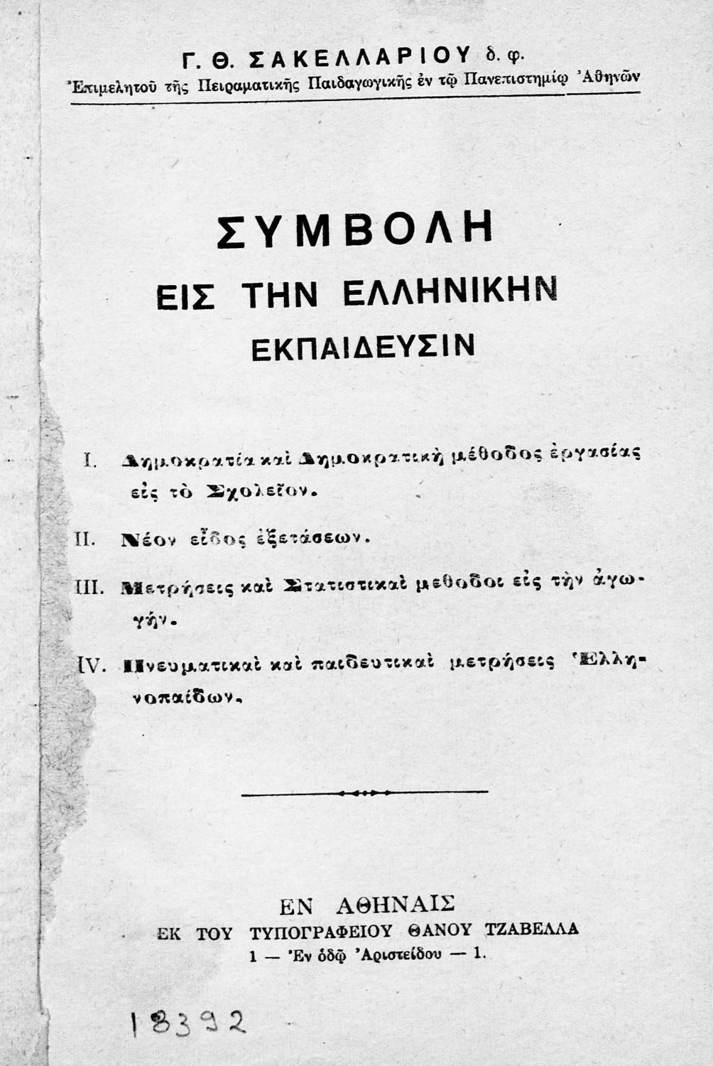 Τίτλος: Συμβολή εις την Ελληνικήν Εκπαίδευσιν