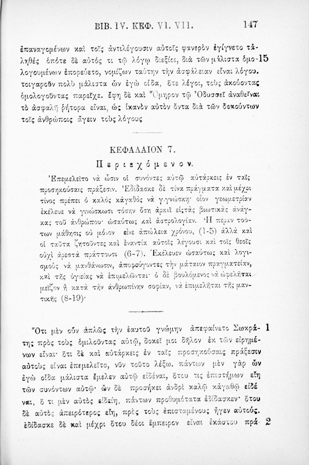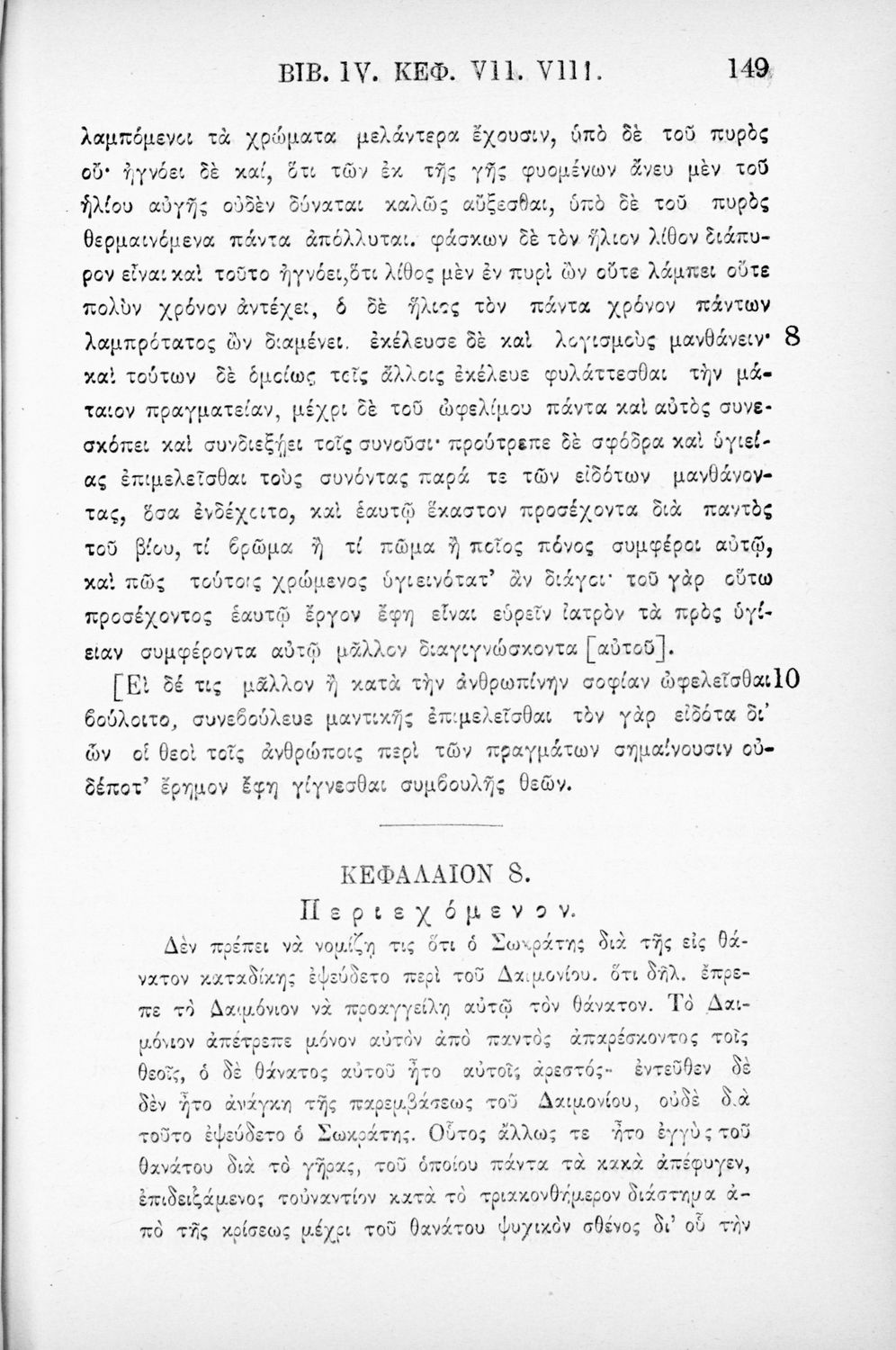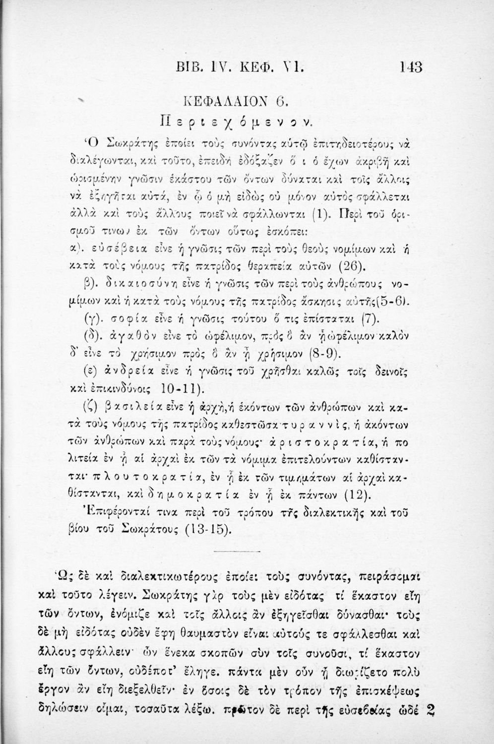 Παρουσίαση περιεχομένου: Μαθητικό βοήθημα Αρχαίων Ελληνικών για τα Ελληνικά Σχολεία, Παρθεναγωγεία και Γυμνάσια που περιέχει αποσπάσματα από τα Απομνημονεύματα του Ξενοφώντα, εισαγωγή στο έργο, ερμηνευτική ανάλυση, λεξικό και παράρτημα σχετικά με την ηθική του Σωκράτη.