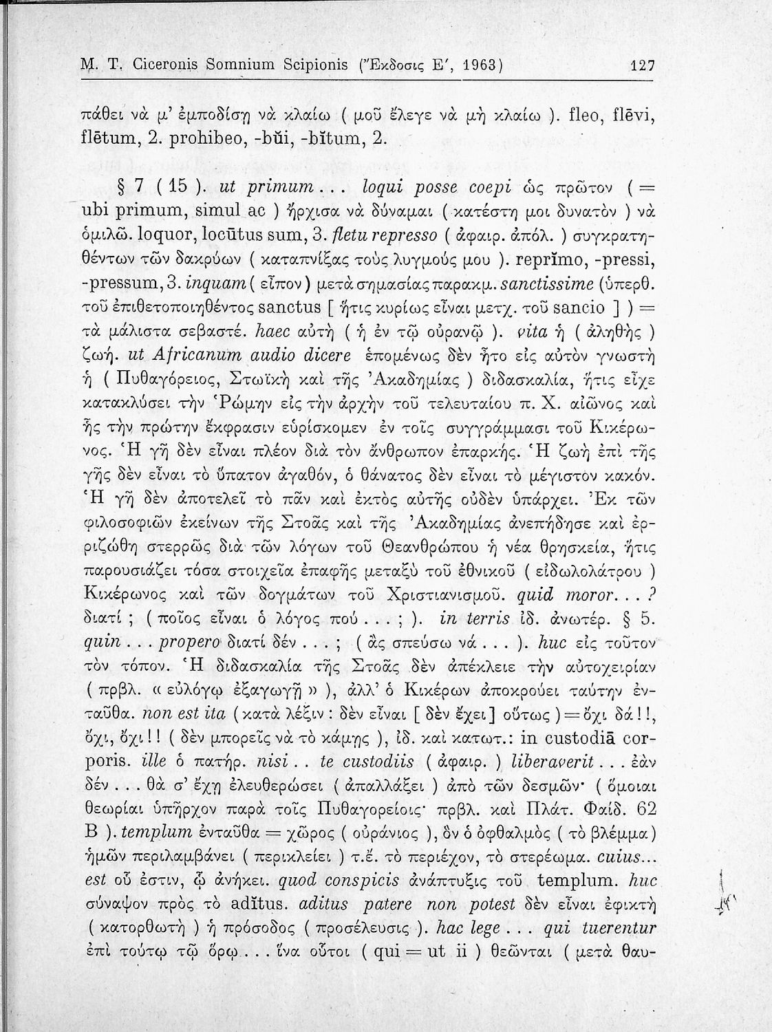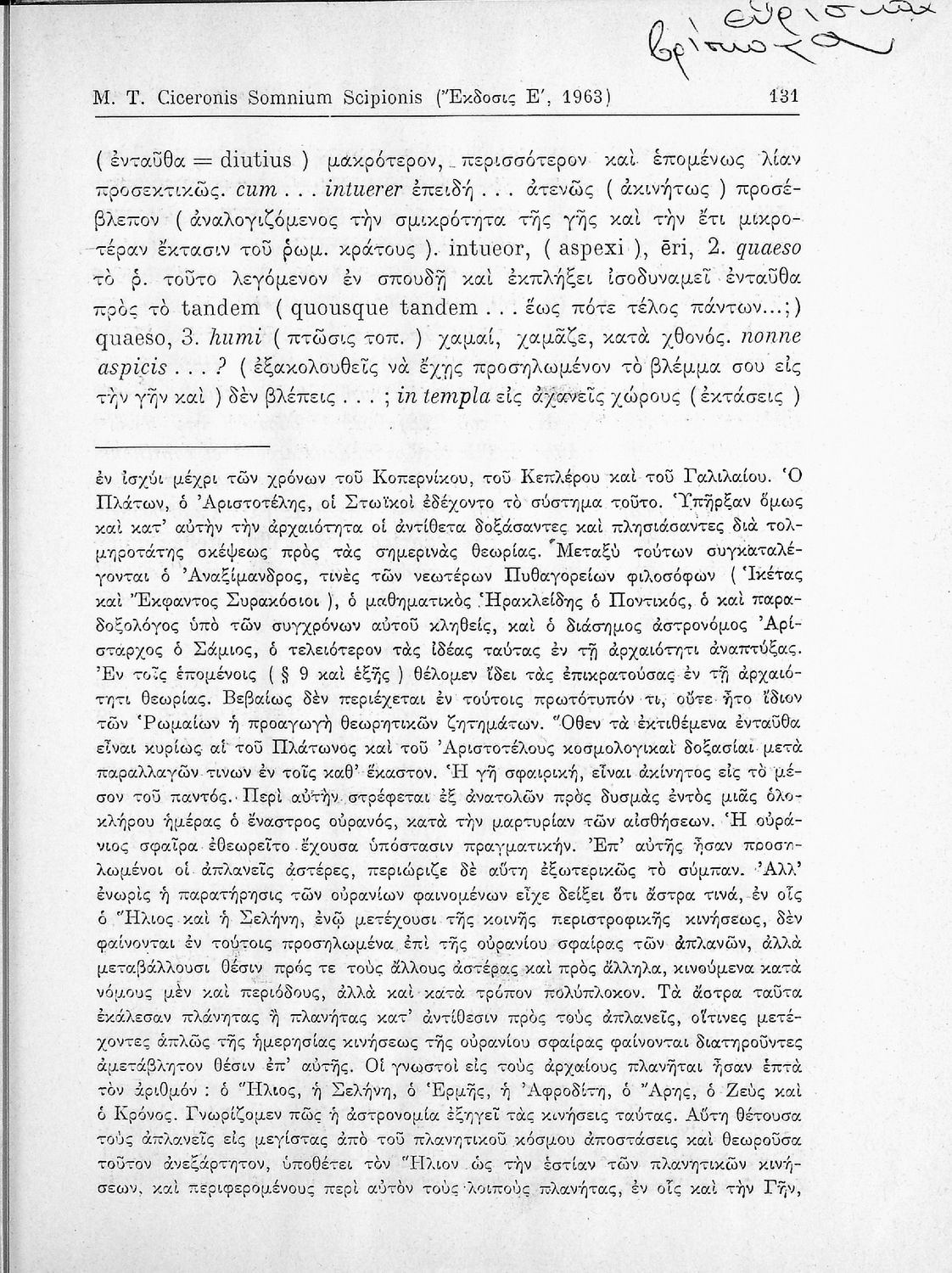 Σχολικό εγχειρίδιο Λατινικών ΣΤ΄ Γυμνασίου που περιλαμβάνει εισαγωγή στο έργο και τη ζωή του Κικέρωνα, το έργο του Ενύπνιον Σκιπίωνος και γλωσσικές και ερμηνευτικές σημειώσεις.