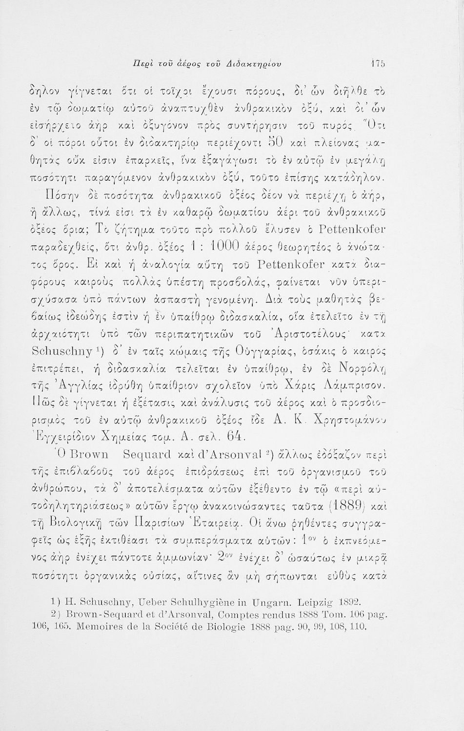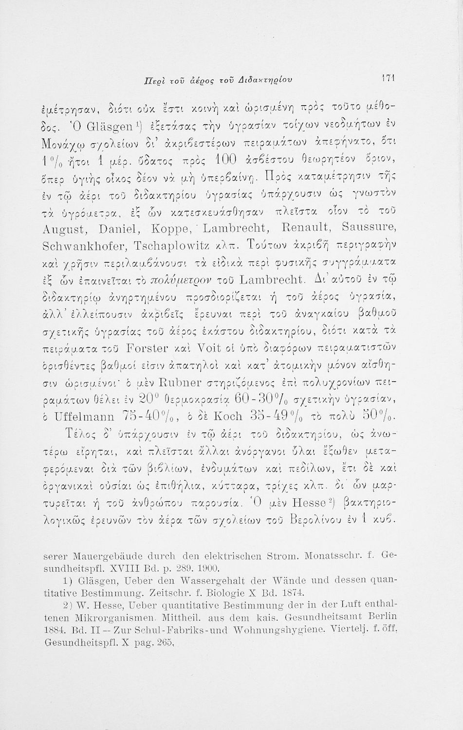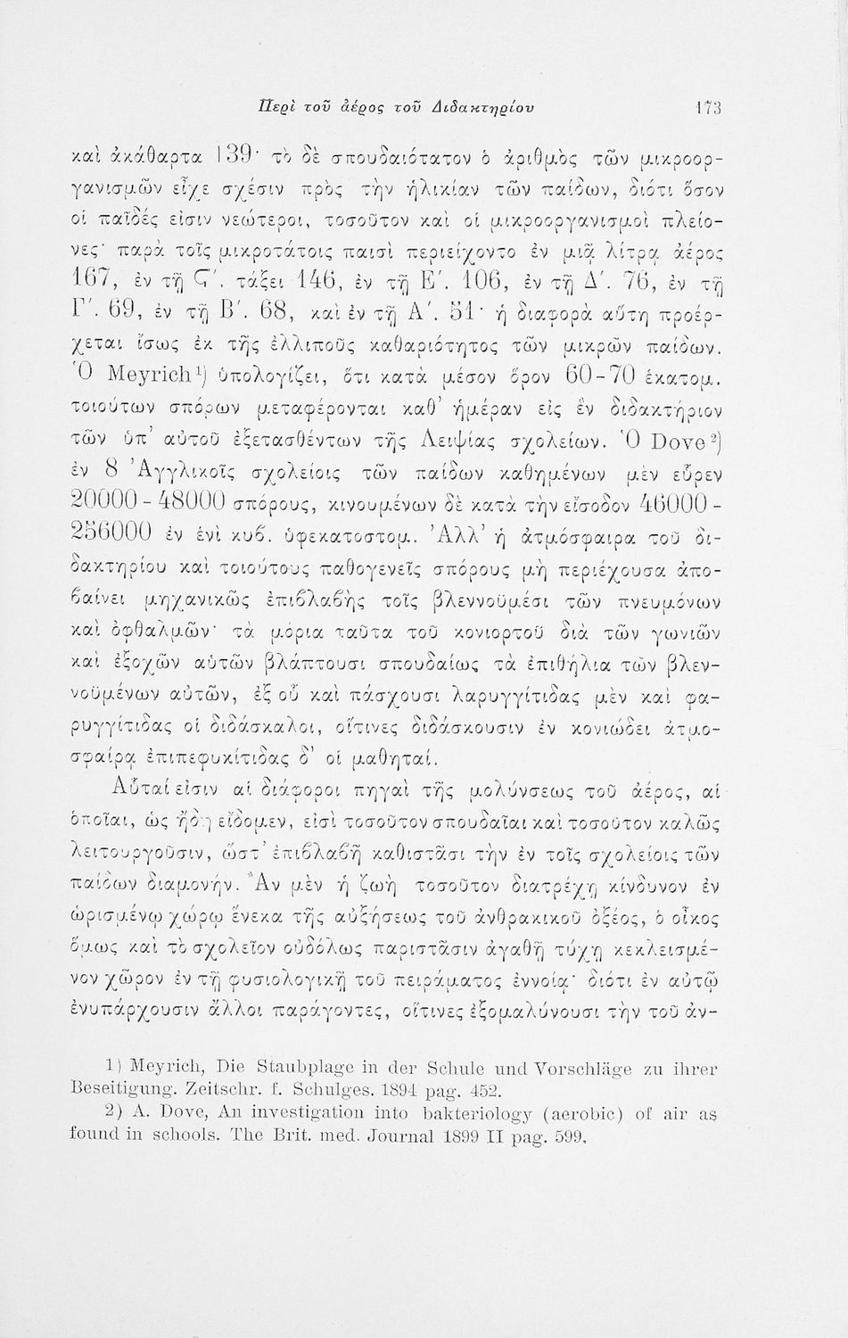 Επιστημονικό σύγγραμμα με εκτενείς αναφορές στην σχετική ξενόγλωσση βιβλιογραφία που πραγματεύεται ζητήματα υγιεινής των σχολικών κτηρίων και της διδασκαλίας και ιατρικής εποπτείας.