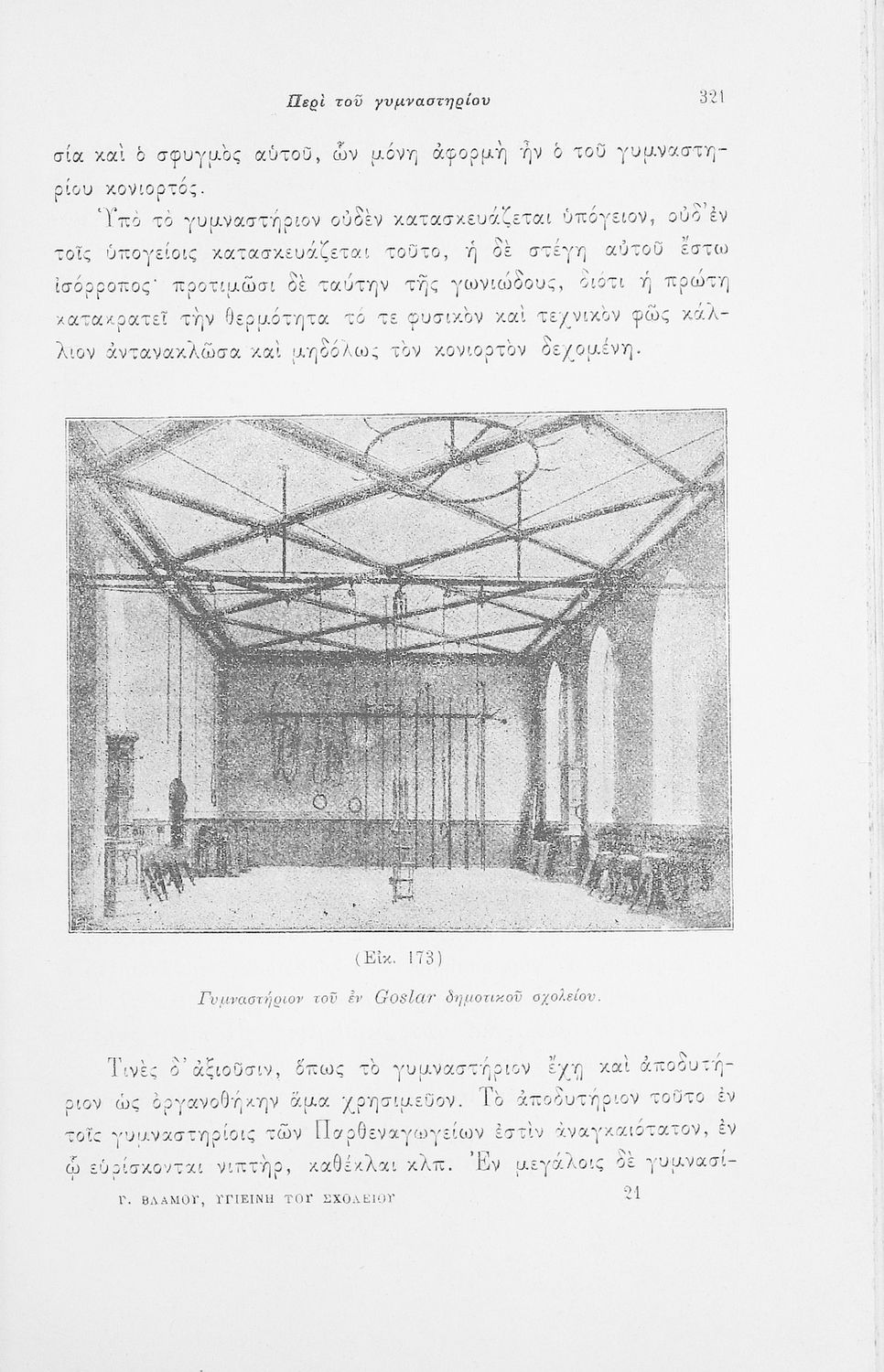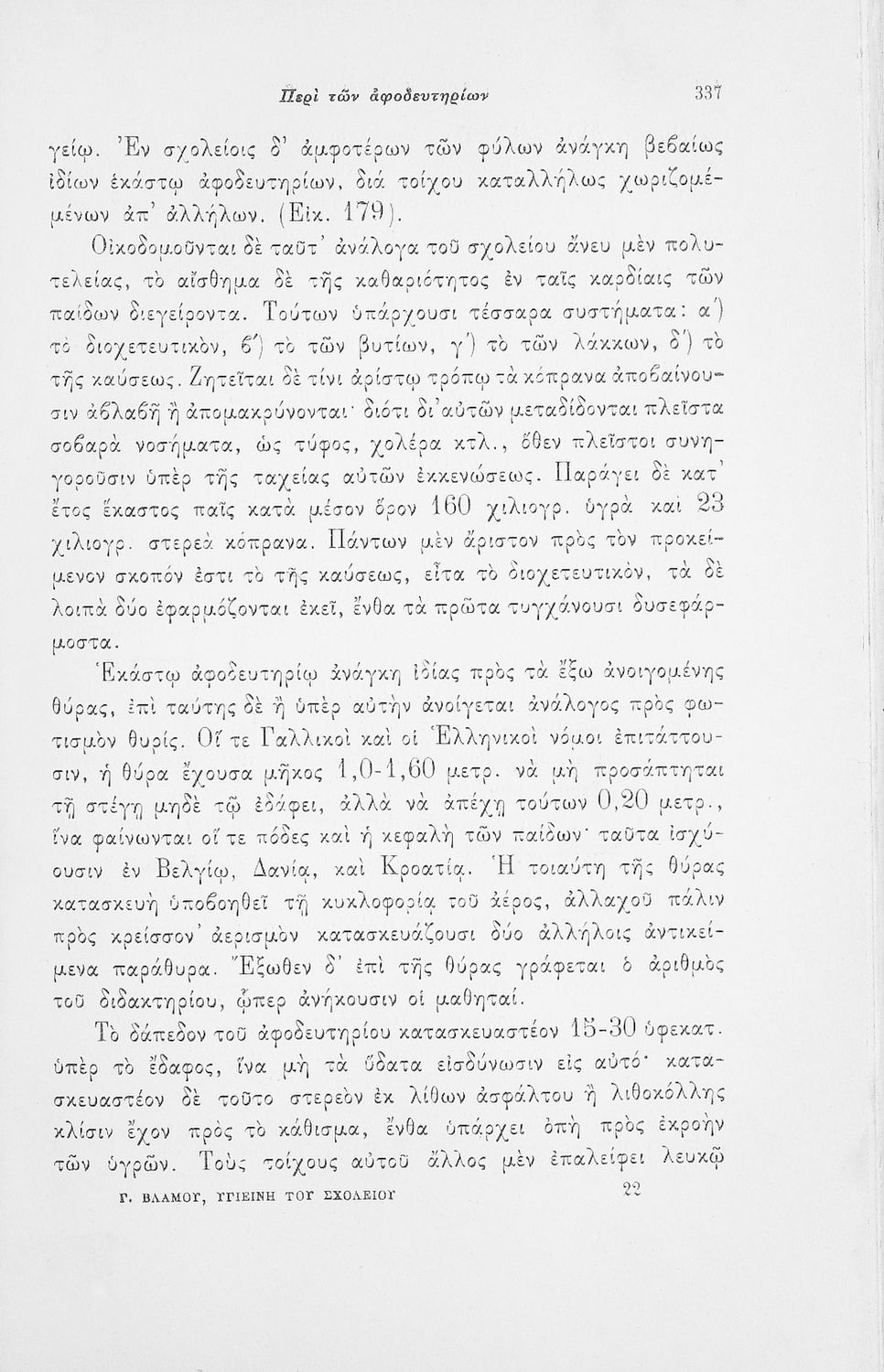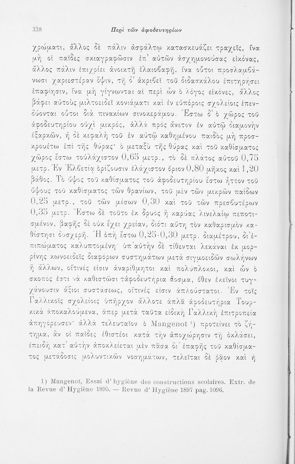 Παρουσίαση περιεχομένου: Επιστημονικό σύγγραμμα με εκτενείς αναφορές στην σχετική ξενόγλωσση βιβλιογραφία που πραγματεύεται ζητήματα υγιεινής των σχολικών κτηρίων και της διδασκαλίας και ιατρικής εποπτείας.