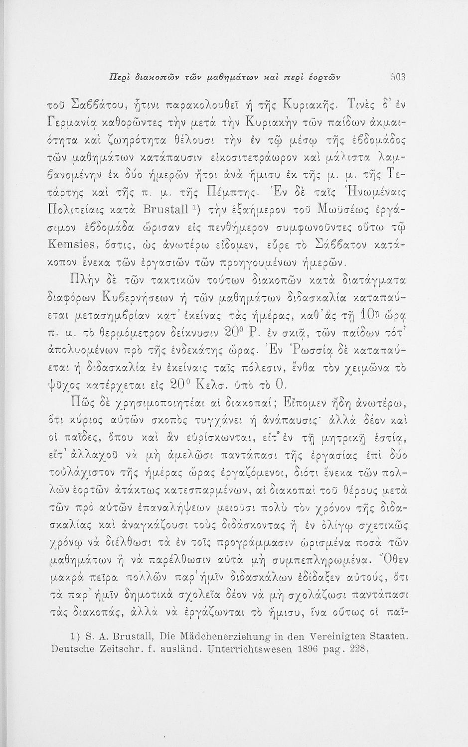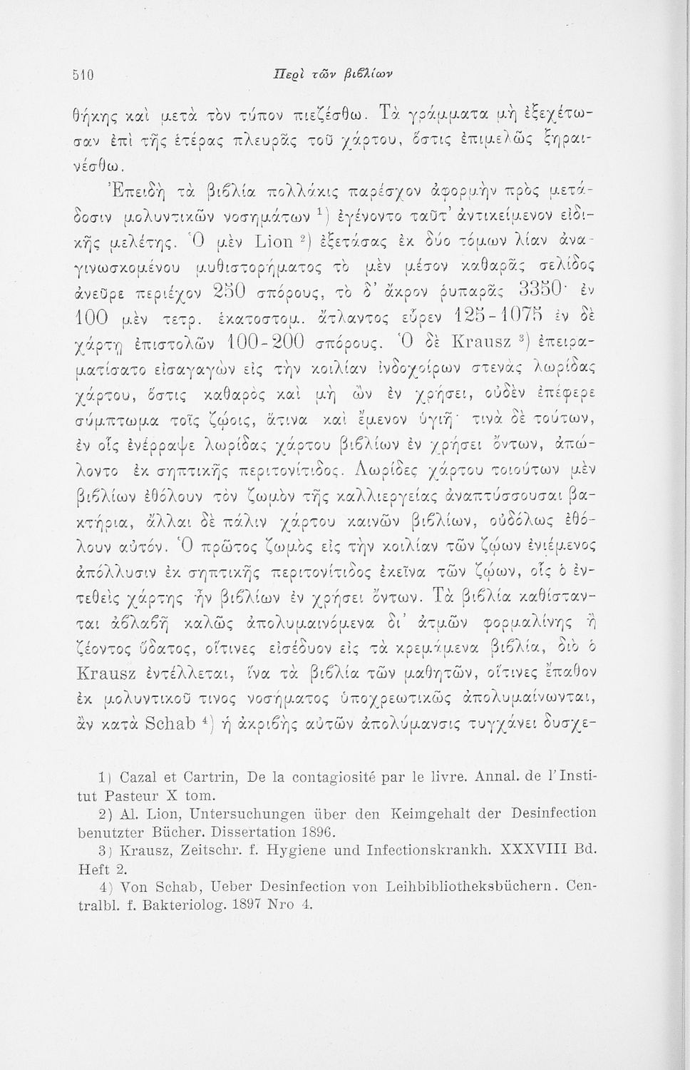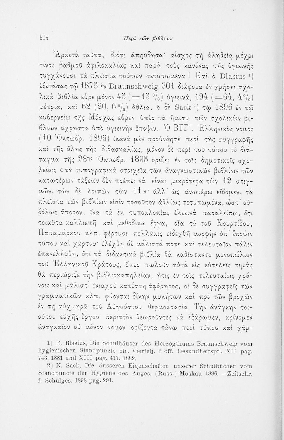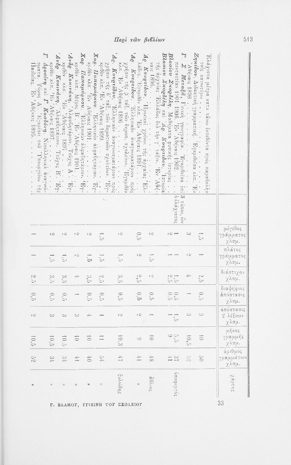 Επιστημονικό σύγγραμμα με εκτενείς αναφορές στην σχετική ξενόγλωσση βιβλιογραφία που πραγματεύεται ζητήματα υγιεινής των σχολικών κτηρίων και της διδασκαλίας και ιατρικής εποπτείας.