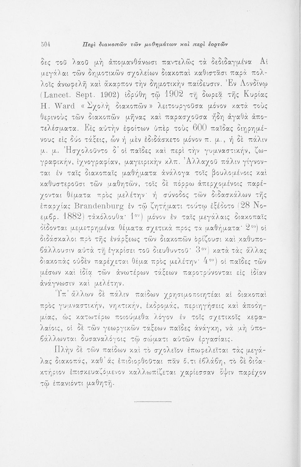 Παρουσίαση περιεχομένου: Επιστημονικό σύγγραμμα με εκτενείς αναφορές στην σχετική ξενόγλωσση βιβλιογραφία που πραγματεύεται ζητήματα υγιεινής των σχολικών κτηρίων και της διδασκαλίας και ιατρικής εποπτείας.