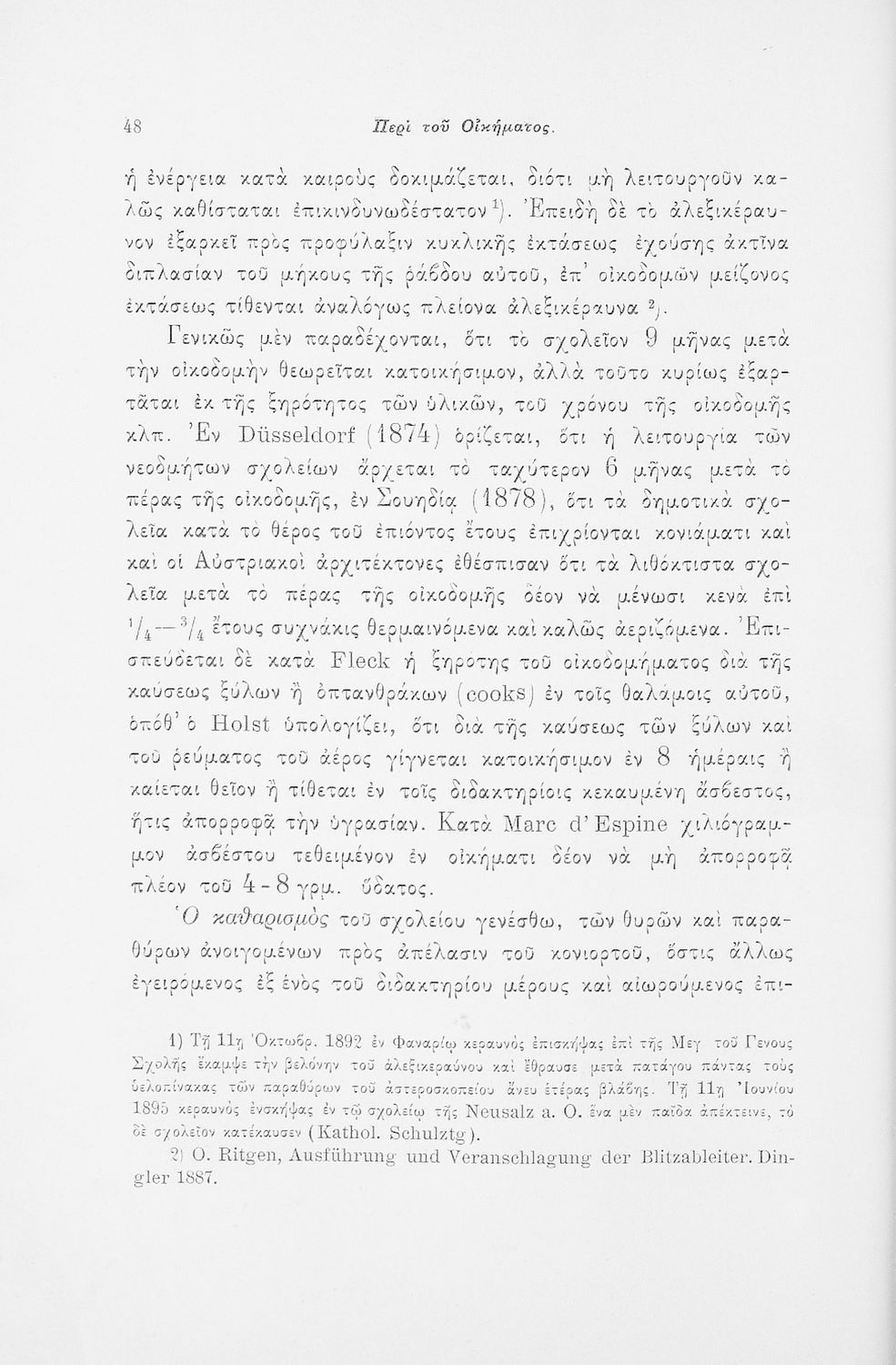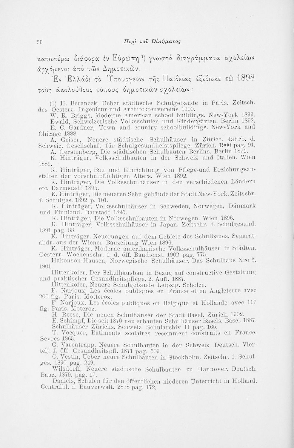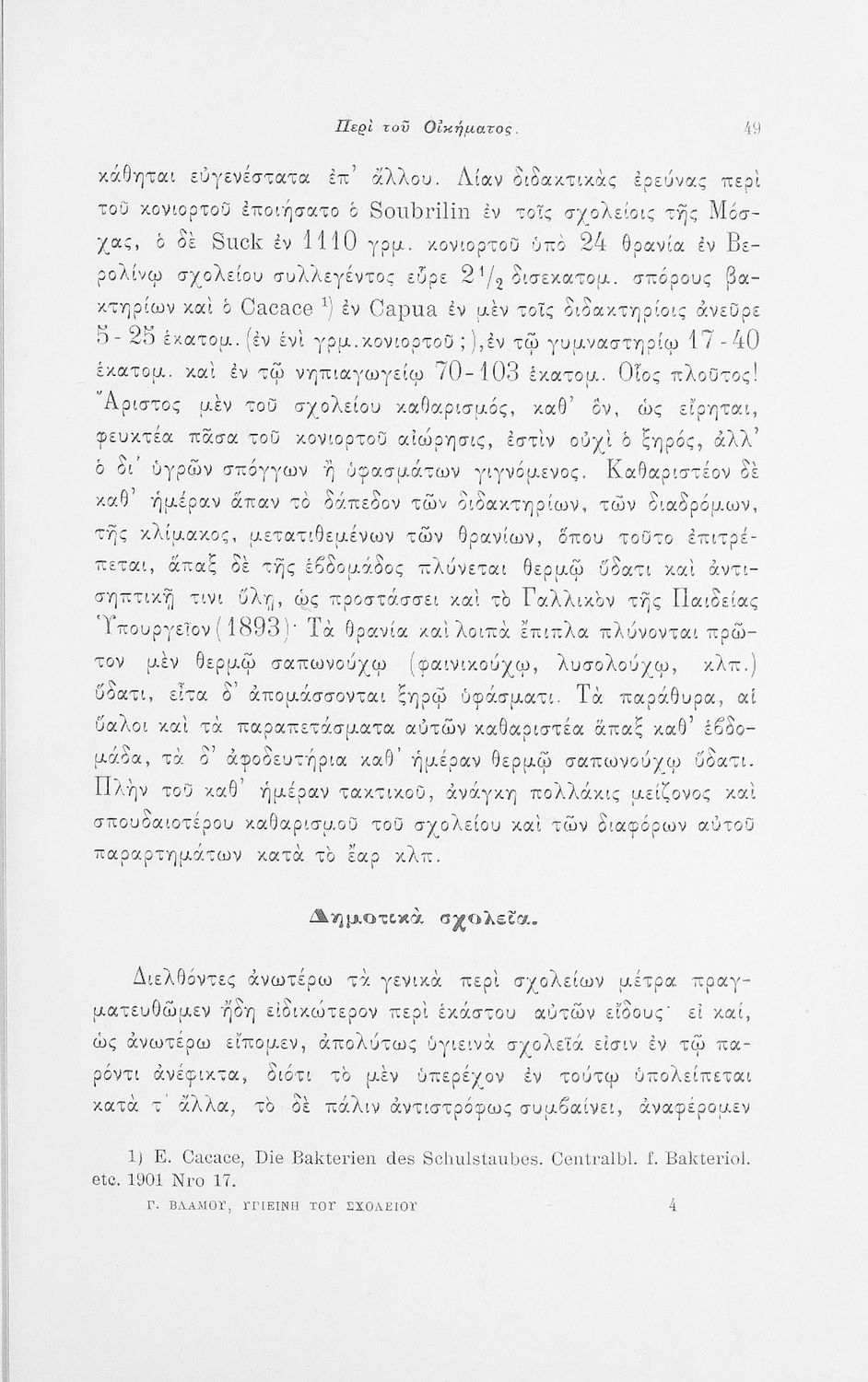 Επιστημονικό σύγγραμμα με εκτενείς αναφορές στην σχετική ξενόγλωσση βιβλιογραφία που πραγματεύεται ζητήματα υγιεινής των σχολικών κτηρίων και της διδασκαλίας και ιατρικής εποπτείας.