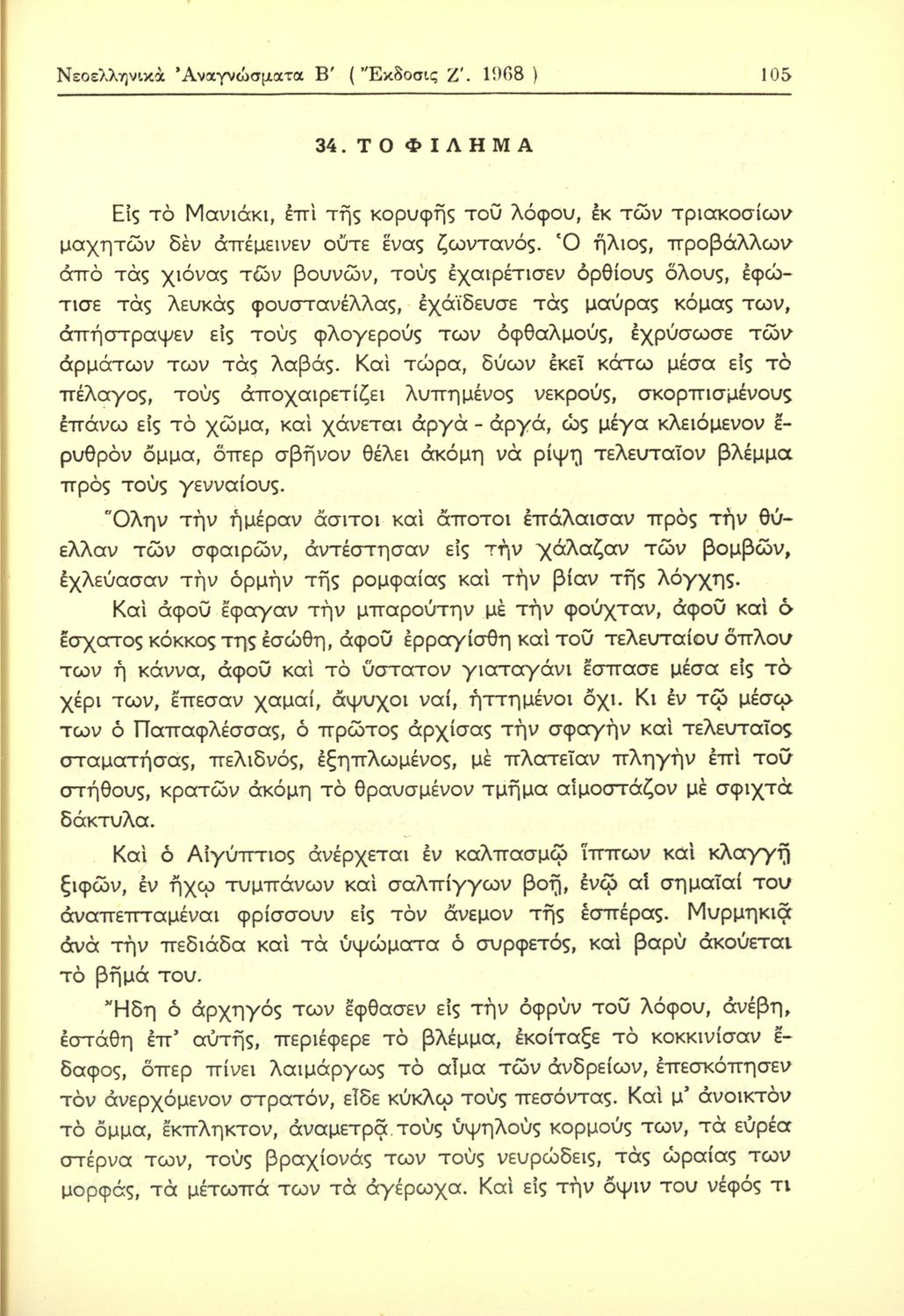 Σχολικό εγχειρίδιο Νέων Ελληνικών Δ΄ Γυμνασίου και Β΄ Αστικού Σχολείου που περιέχει πεζά και ποιήματα Ελλήνων συγγραφέων εμπνευσμένα από τη θρησκευτική και κοινωνική ζωή, την ελληνική μυθολογία, την αρχαία και