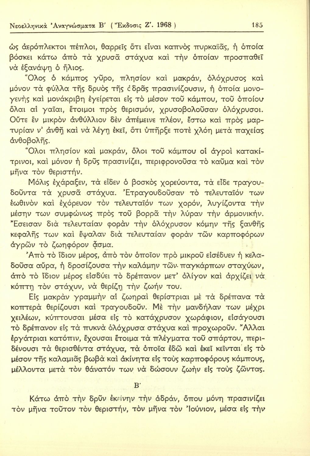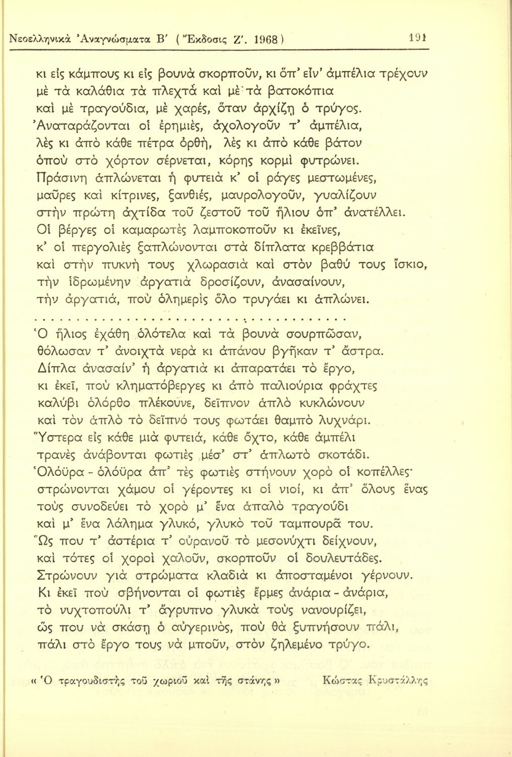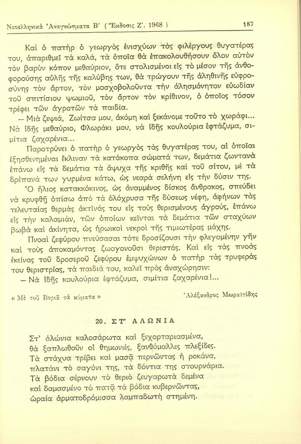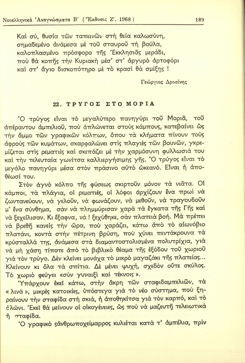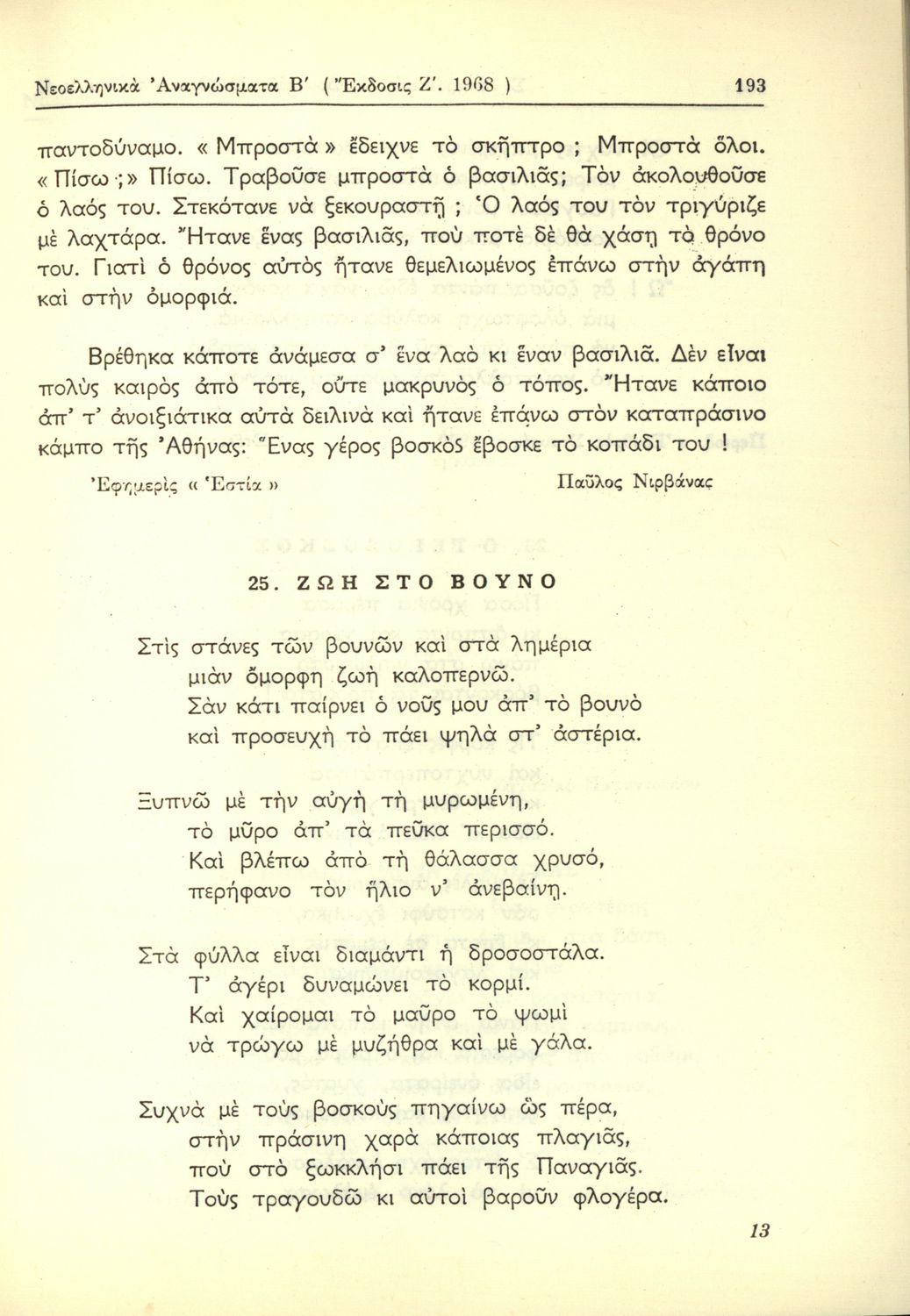 Σχολικό εγχειρίδιο Νέων Ελληνικών Β' Γυμνασίου που περιέχει ποιήματα και πεζά Ελλήνων συγγραφέων εμπνευσμένα από τη θρησκευτική, εθνική, οικογενειακή και κοινωνική ζωή και την ελληνική φύση. Περιέχει παράρτημα με βιογραφίες των συγγραφέων και λεξιλόγιο. Φέρει το σύμβολο της δικτατορίας.