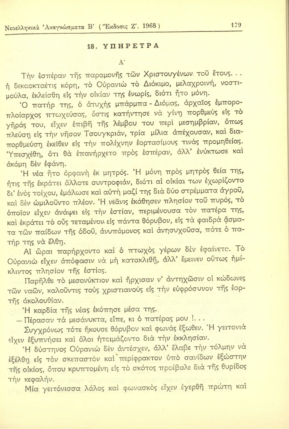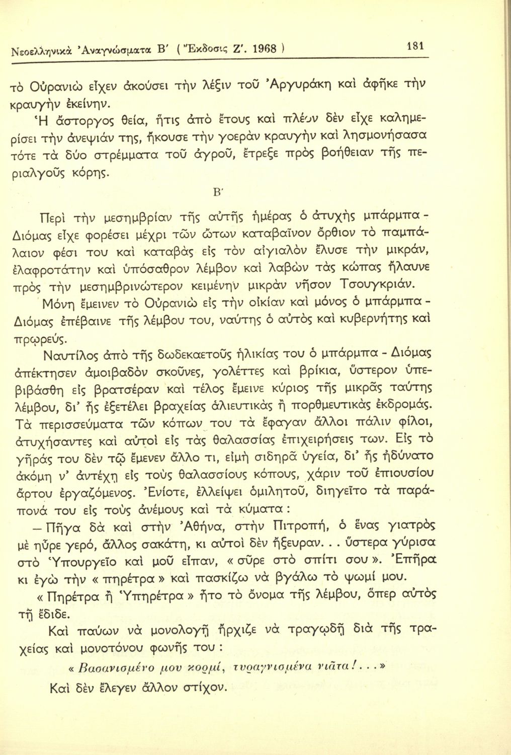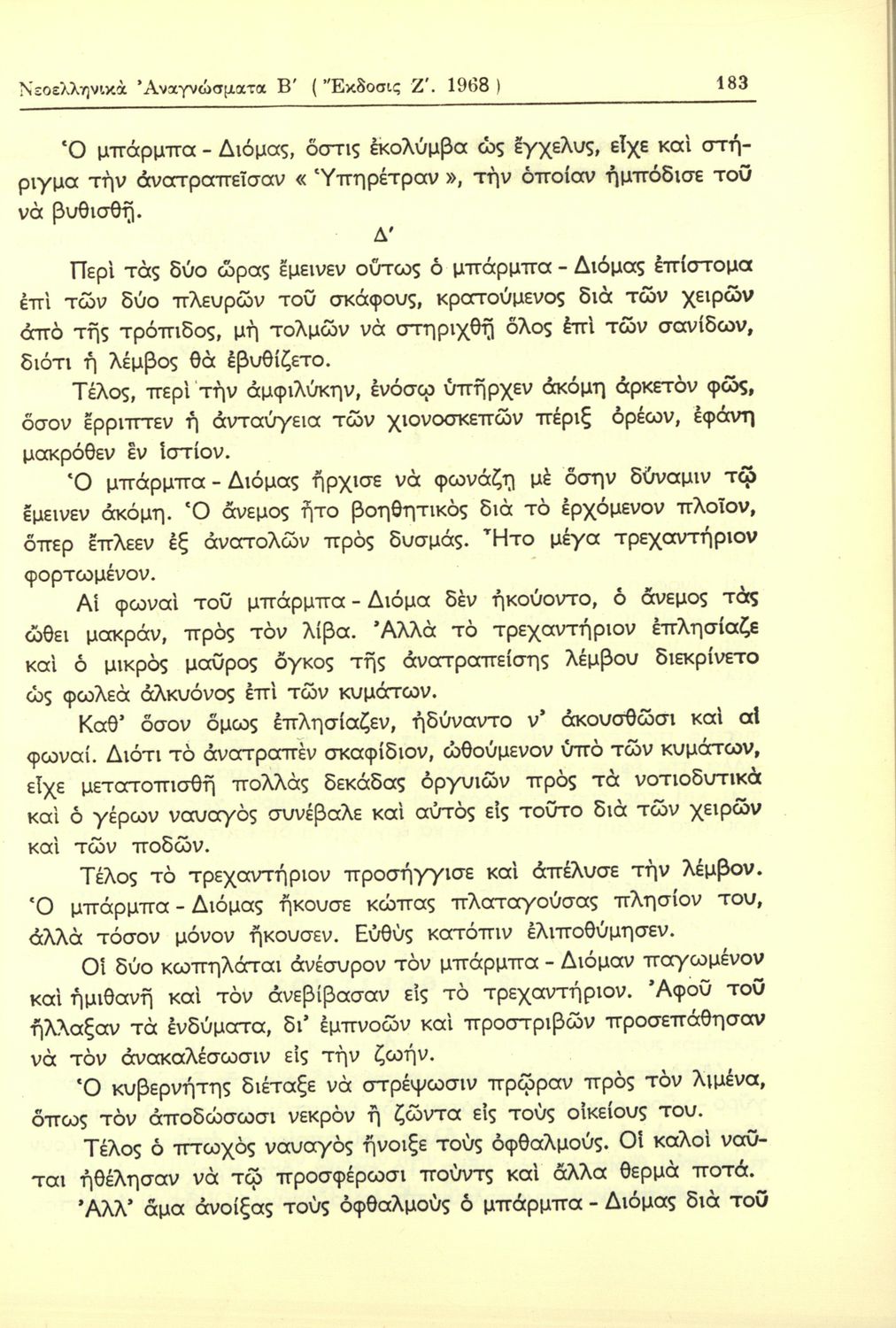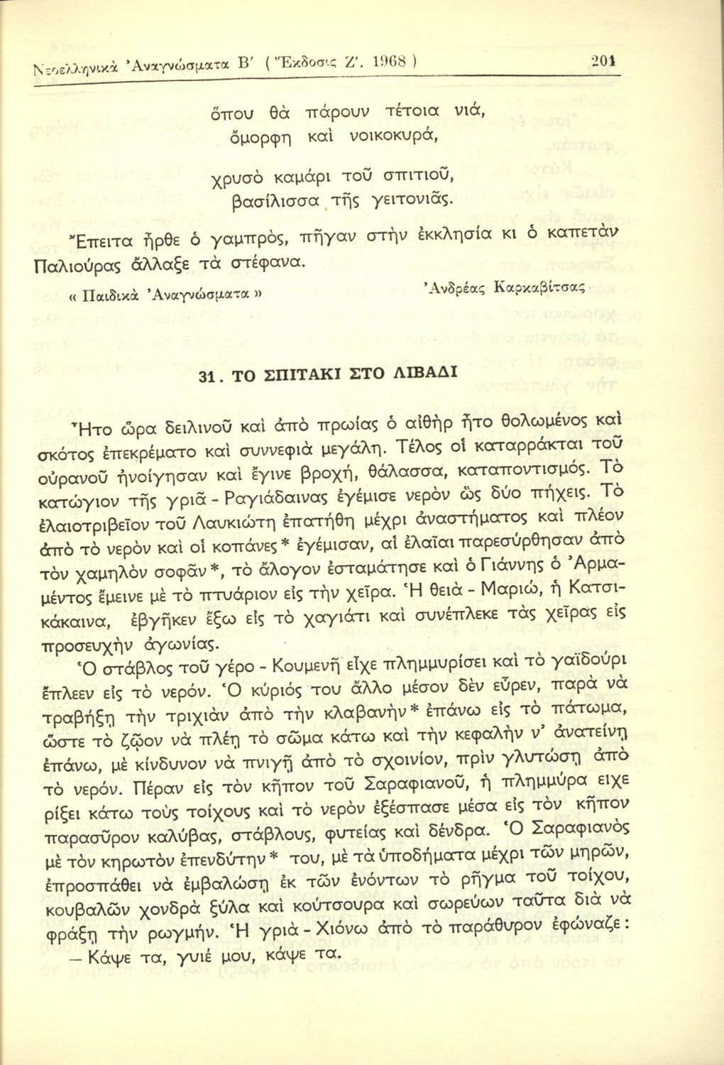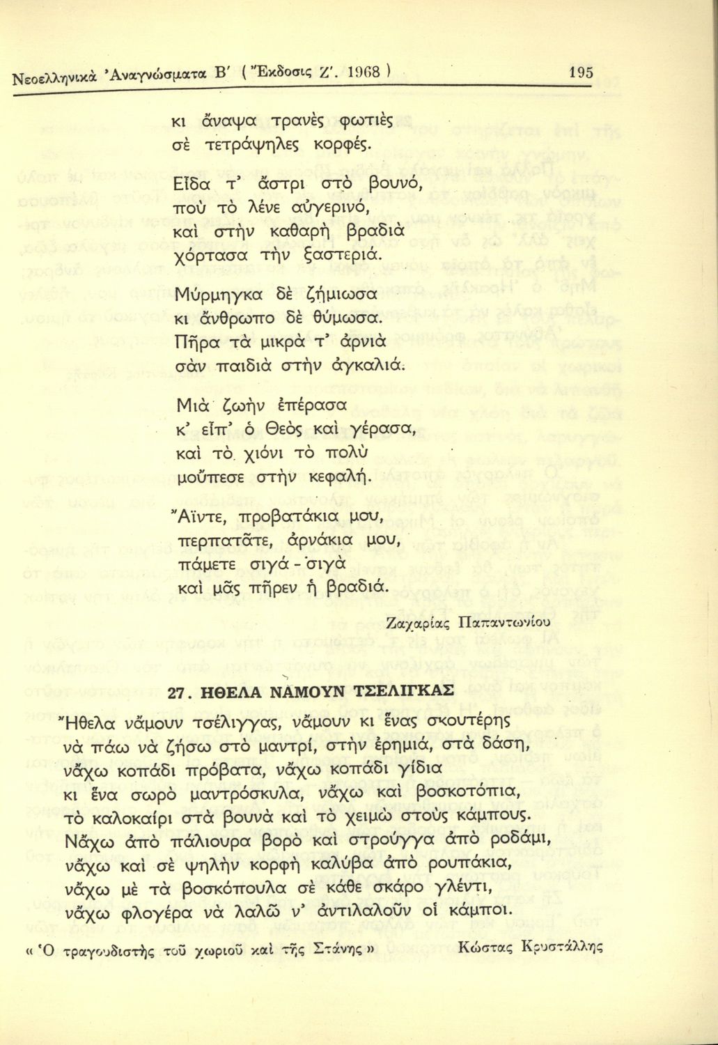 Σχολικό εγχειρίδιο Νέων Ελληνικών Β' Γυμνασίου που περιέχει ποιήματα και πεζά Ελλήνων συγγραφέων εμπνευσμένα από τη θρησκευτική, εθνική, οικογενειακή και κοινωνική ζωή και την ελληνική φύση. Περιέχει παράρτημα με βιογραφίες των συγγραφέων και λεξιλόγιο. Φέρει το σύμβολο της δικτατορίας.
