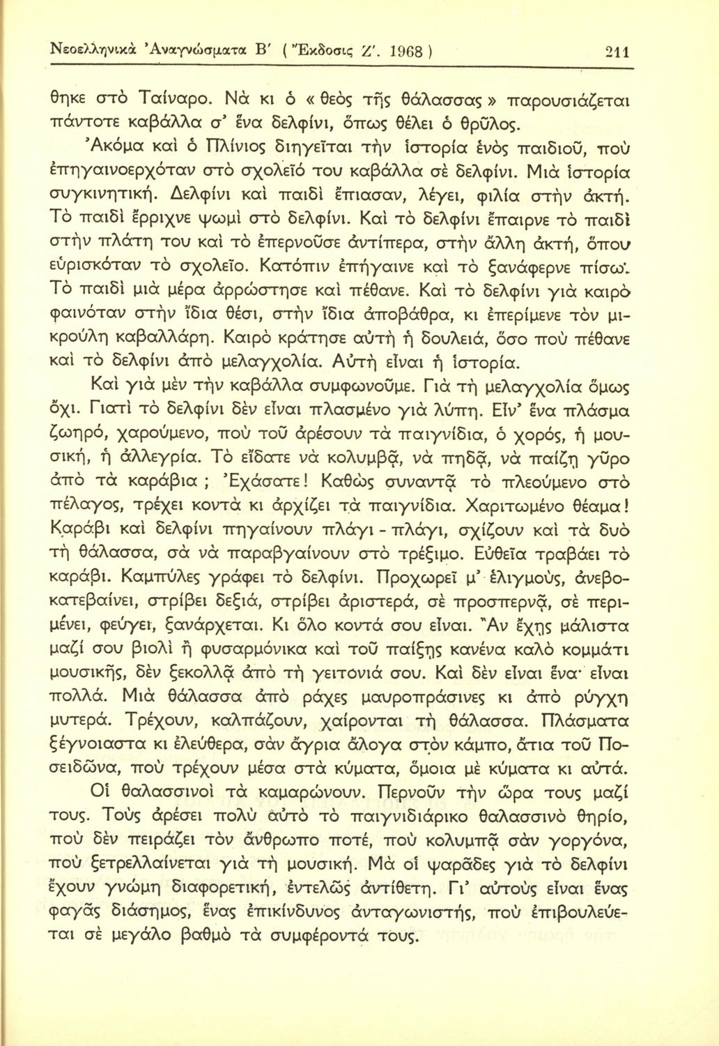 Παρουσίαση περιεχομένου: Σχολικό εγχειρίδιο Νέων Ελληνικών Β' Γυμνασίου που περιέχει ποιήματα και πεζά Ελλήνων συγγραφέων εμπνευσμένα από τη θρησκευτική, εθνική, οικογενειακή και κοινωνική ζωή και την ελληνική φύση. Περιέχει παράρτημα με βιογραφίες των συγγραφέων και λεξιλόγιο. Φέρει το σύμβολο της δικτατορίας.