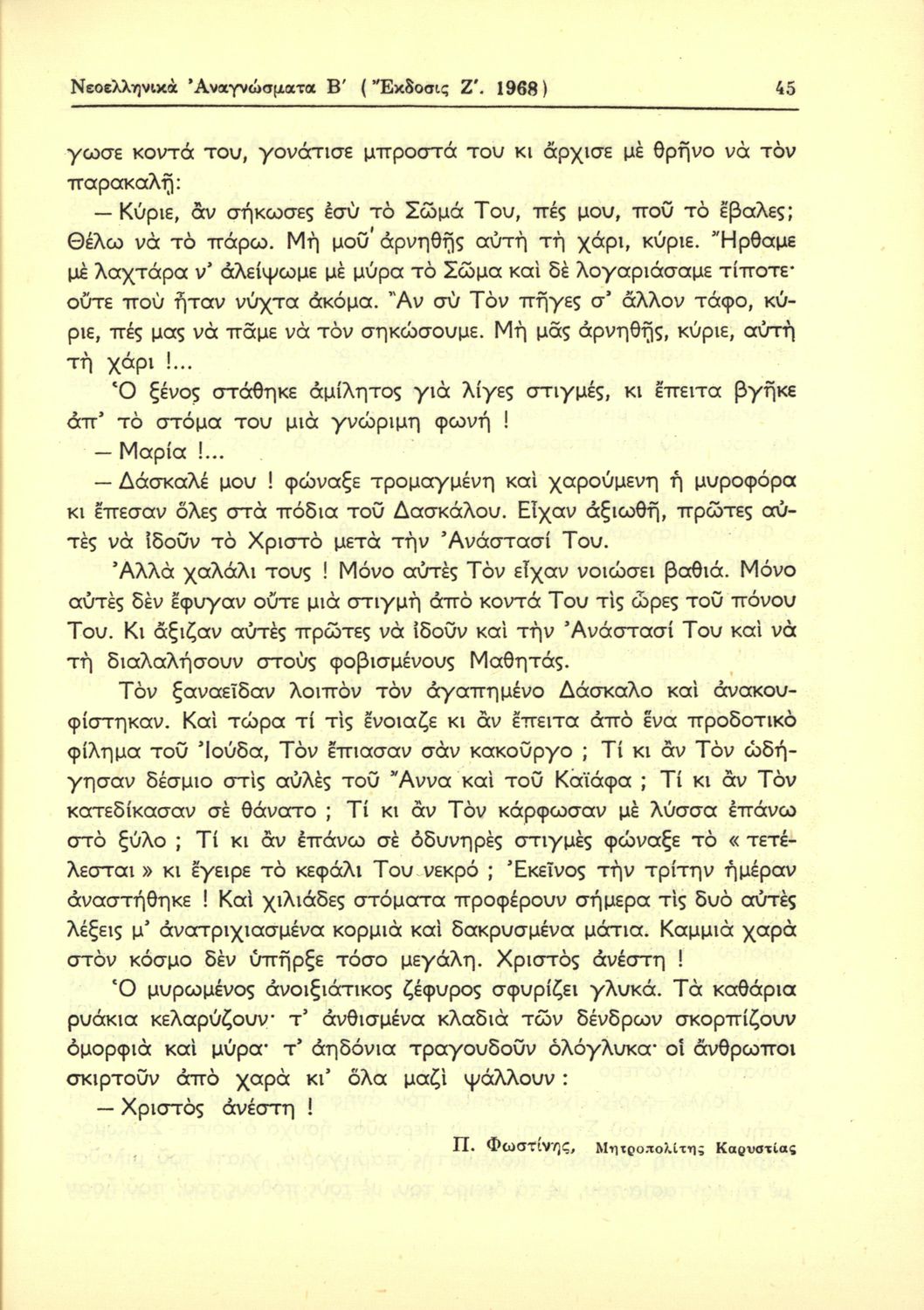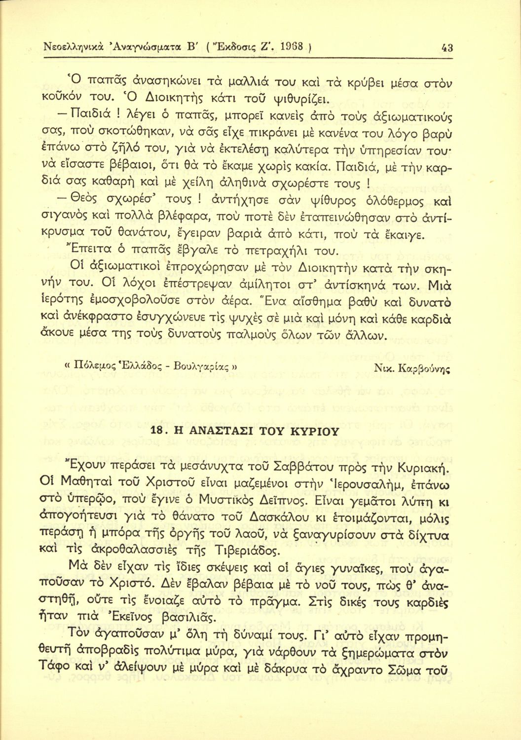 520 ## _aΣχολικό εγχειρίδιο Νέων Ελληνικών Β' Γυμνασίου που περιέχει ποιήματα και πεζά Ελλήνων συγγραφέων εμπνευσμένα από τη θρησκευτική, εθνική, οικογενειακή και κοινωνική ζωή και την ελληνική φύση. Περιέχει παράρτημα με βιογραφίες των συγγραφέων και λεξιλόγιο. Φέρει το σύμβολο της δικτατορίας.