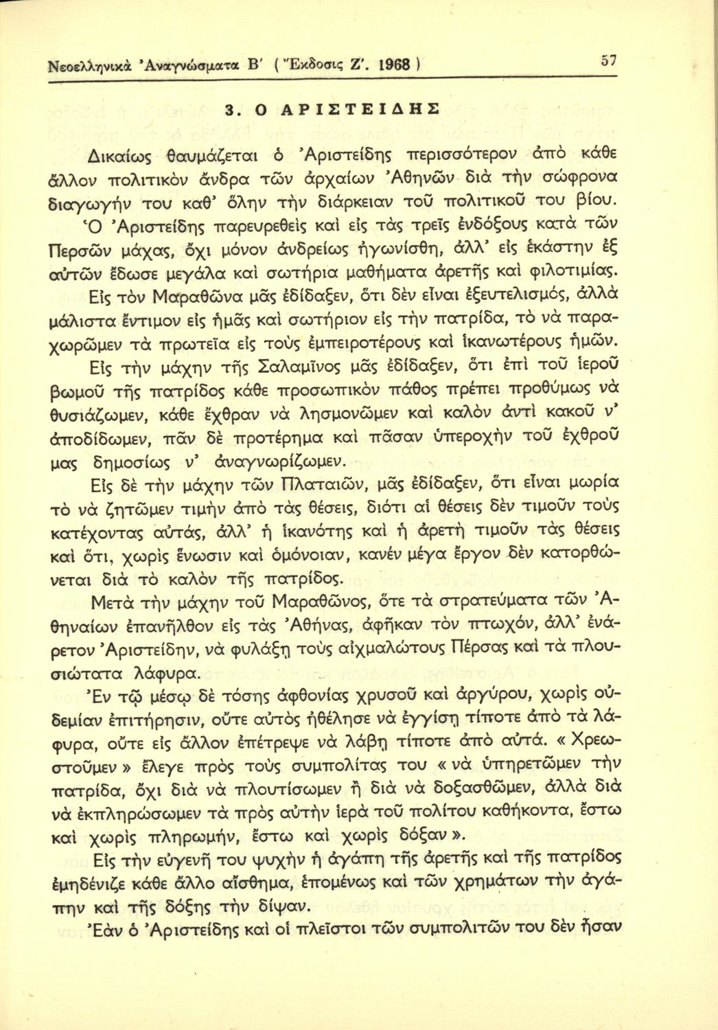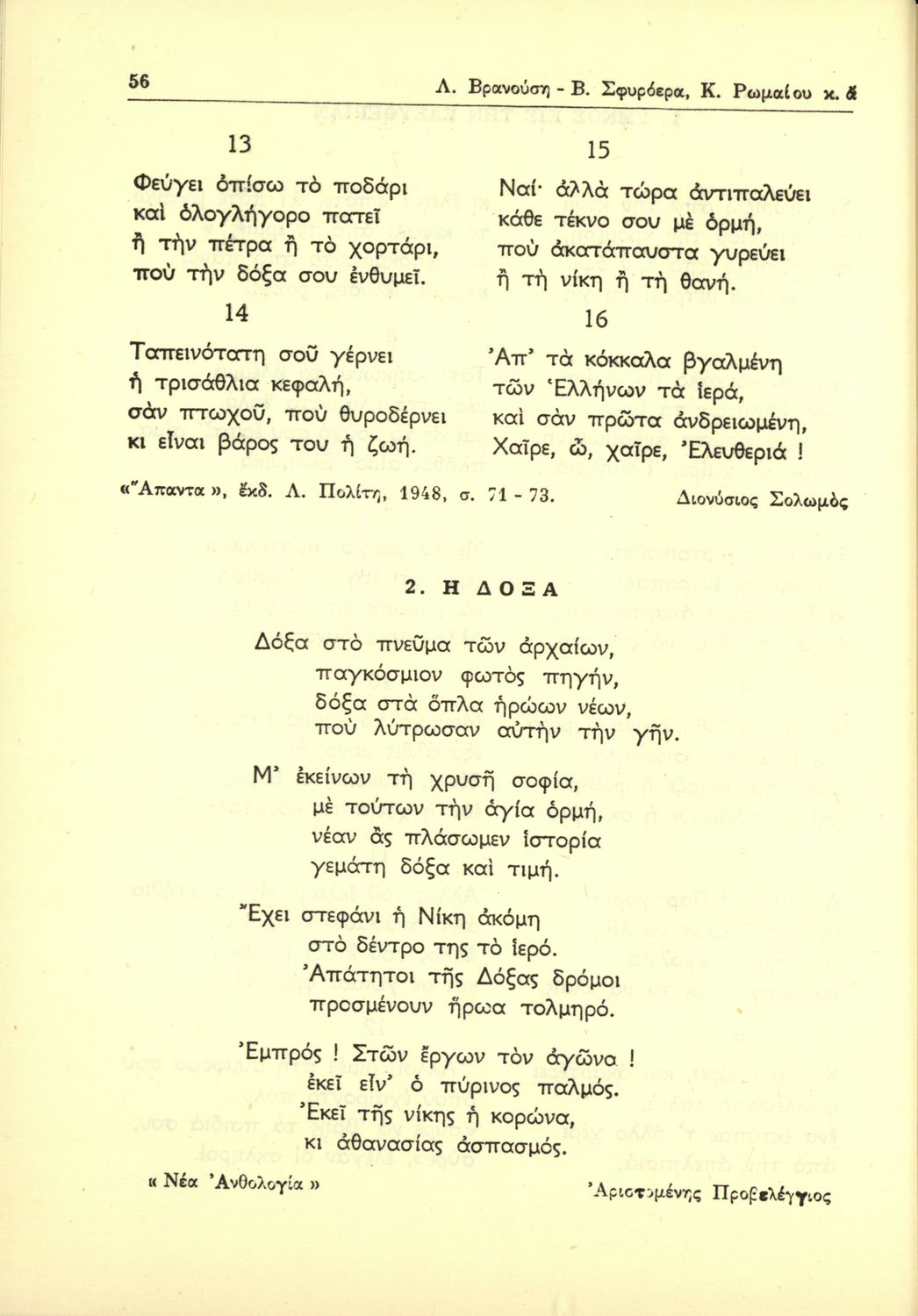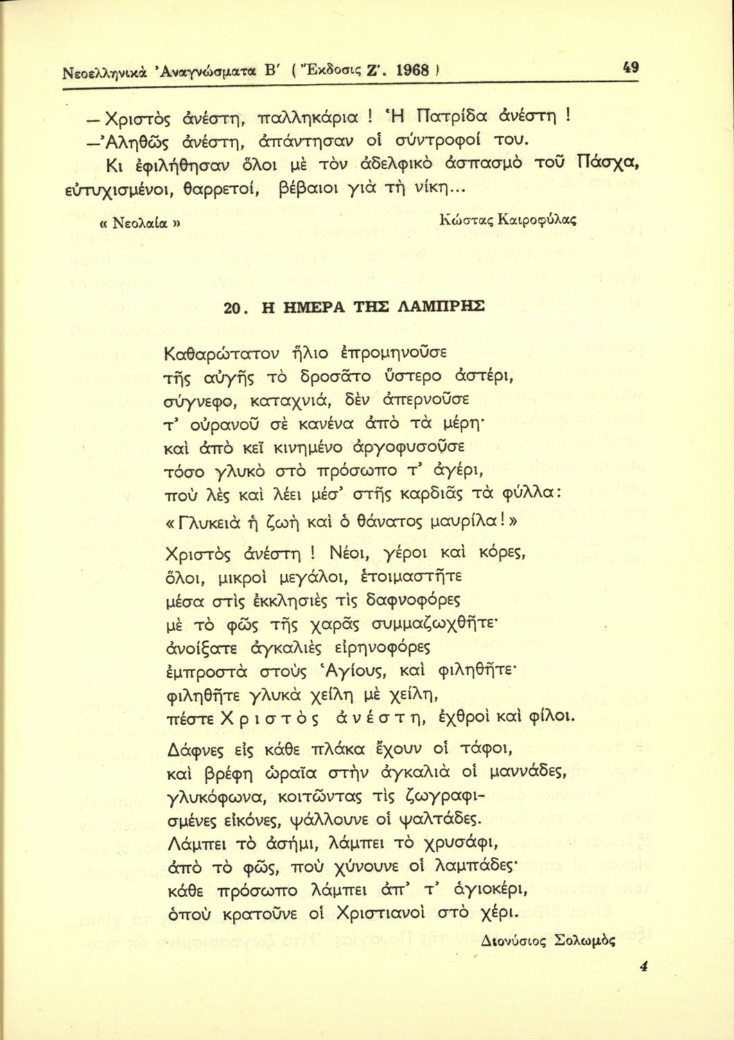 Σχολικό εγχειρίδιο Νέων Ελληνικών Β' Γυμνασίου που περιέχει ποιήματα και πεζά Ελλήνων συγγραφέων εμπνευσμένα από τη θρησκευτική, εθνική, οικογενειακή και κοινωνική ζωή και την ελληνική φύση. Περιέχει παράρτημα με βιογραφίες των συγγραφέων και λεξιλόγιο. Φέρει το σύμβολο της δικτατορίας.