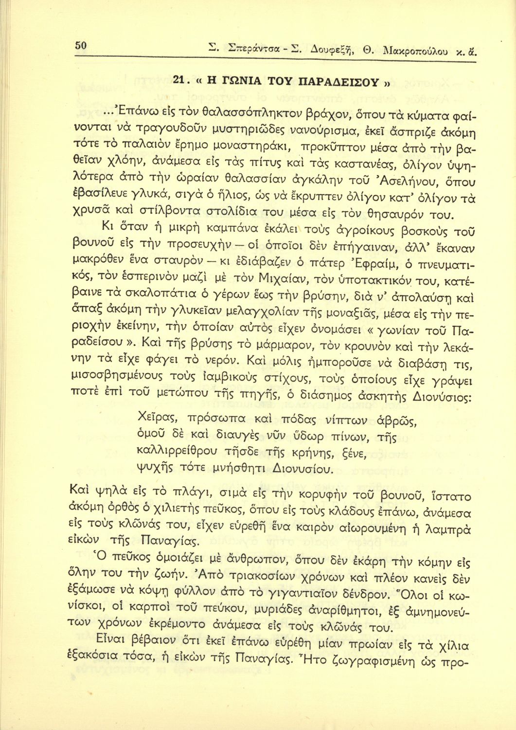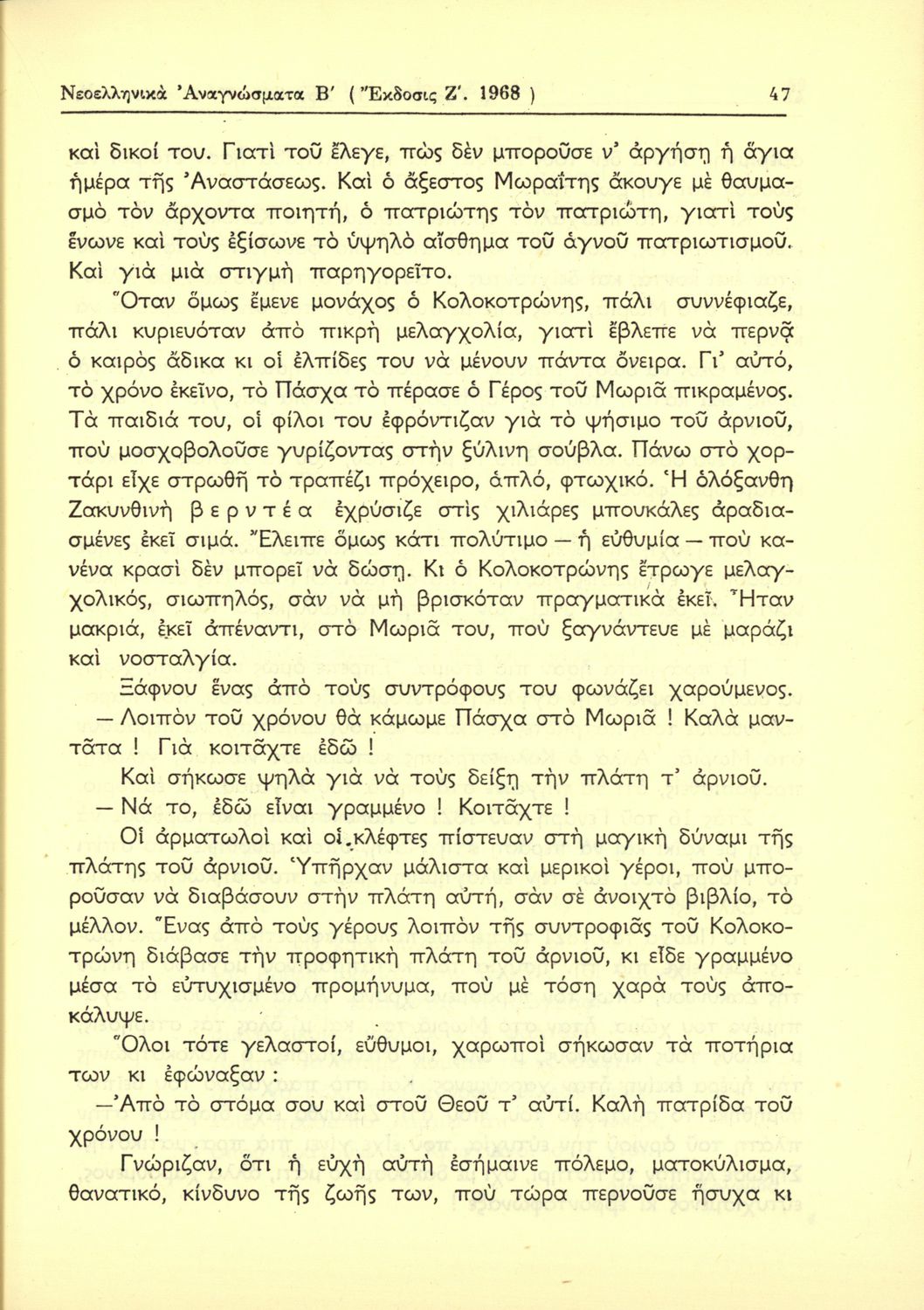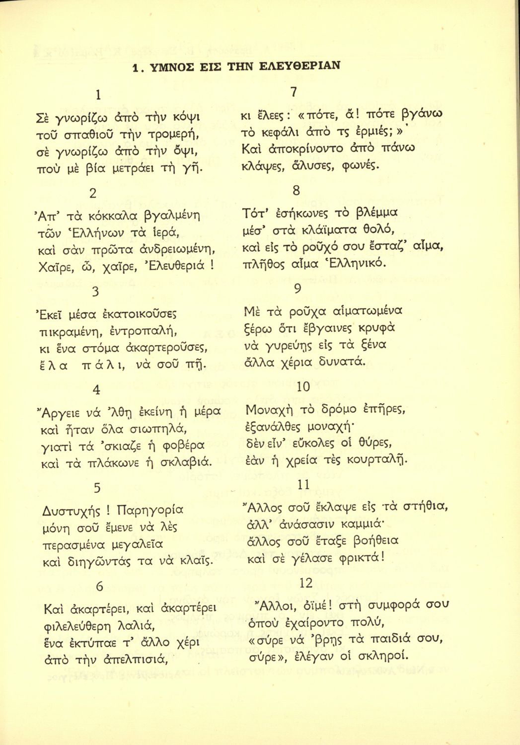 Σχολικό εγχειρίδιο Νέων Ελληνικών Β' Γυμνασίου που περιέχει ποιήματα και πεζά Ελλήνων συγγραφέων εμπνευσμένα από τη θρησκευτική, εθνική, οικογενειακή και κοινωνική ζωή και την ελληνική φύση. Περιέχει παράρτημα με βιογραφίες των συγγραφέων και λεξιλόγιο. Φέρει το σύμβολο της δικτατορίας.