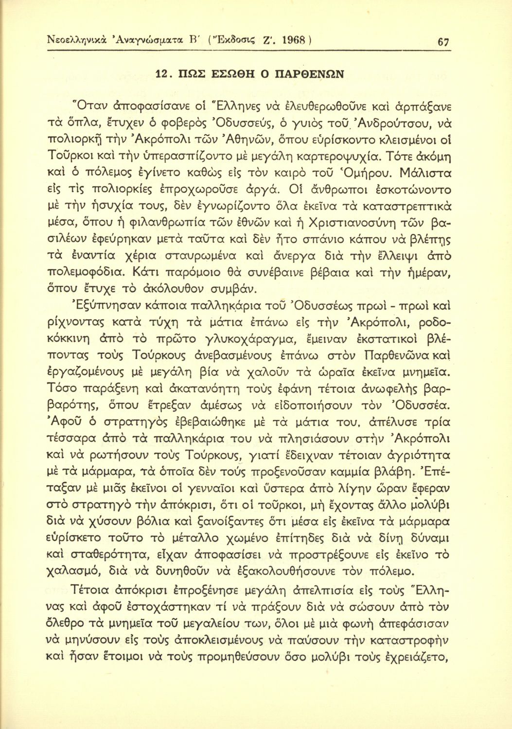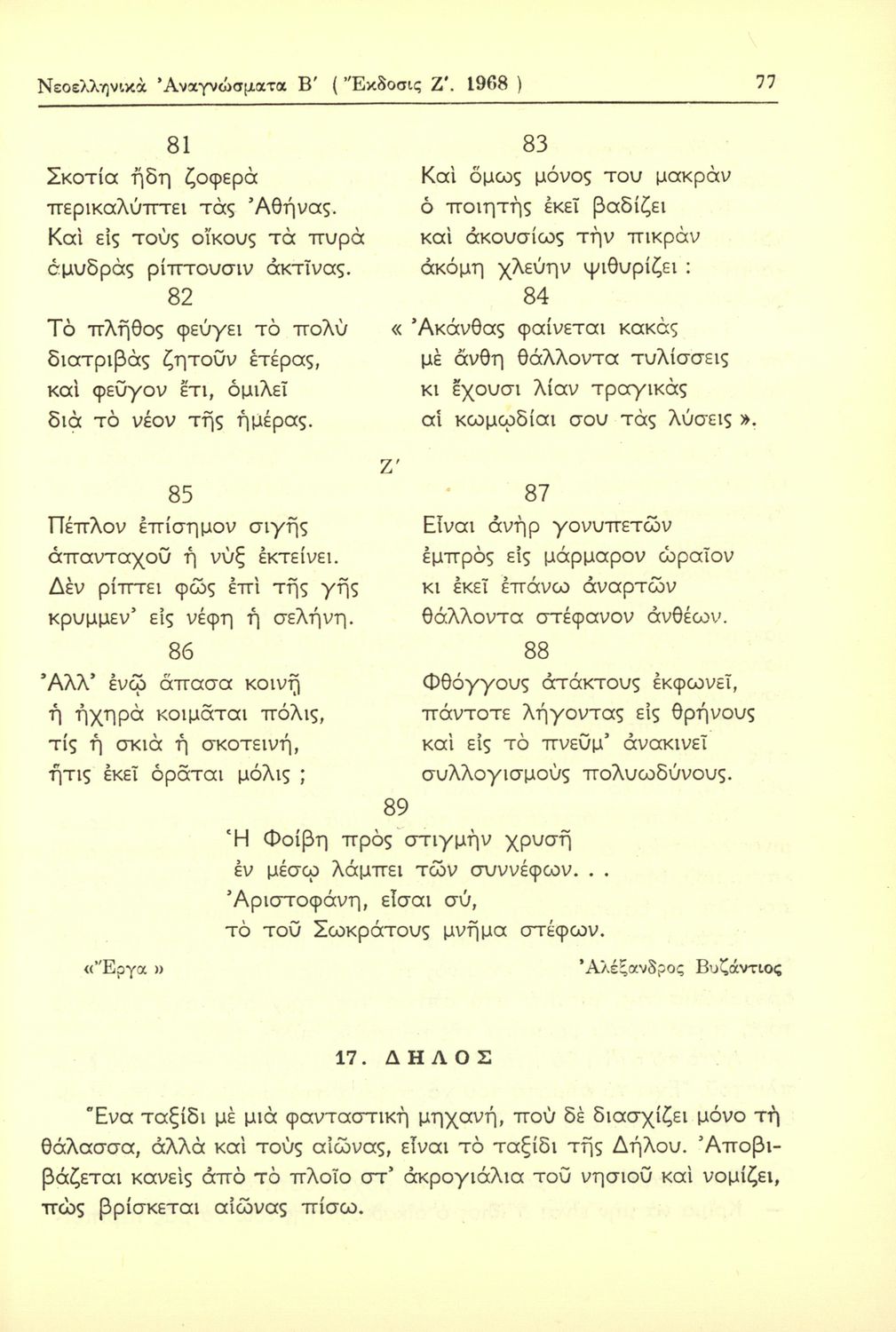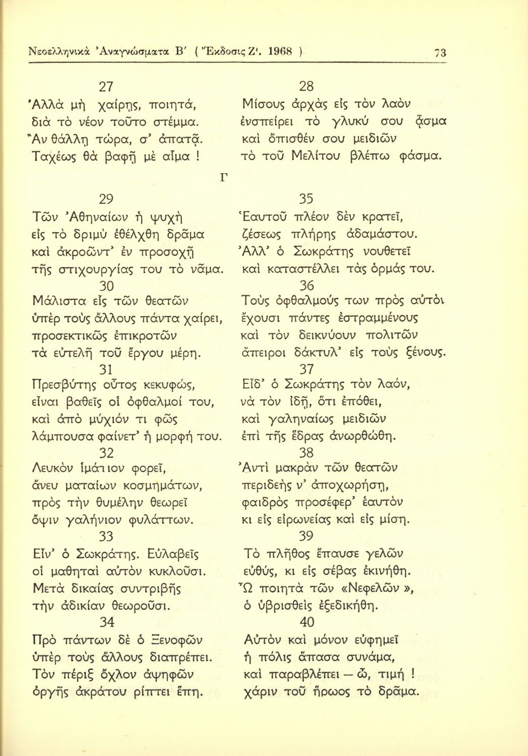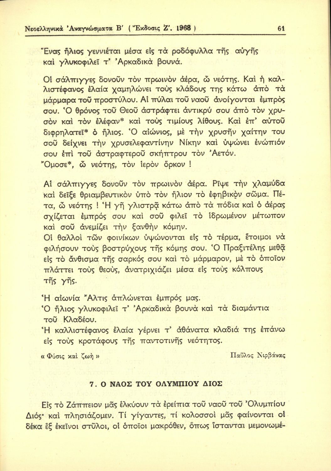 Σχολικό εγχειρίδιο Νέων Ελληνικών Δ΄ Γυμνασίου και Β΄ Αστικού Σχολείου που περιέχει πεζά και ποιήματα Ελλήνων συγγραφέων εμπνευσμένα από τη θρησκευτική και κοινωνική ζωή, την ελληνική μυθολογία, την αρχαία και