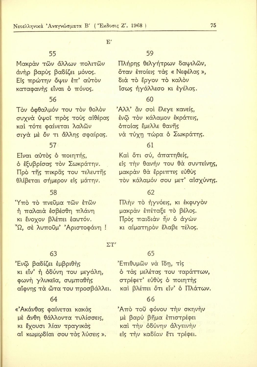Σχολικό εγχειρίδιο Νέων Ελληνικών Β' Γυμνασίου που περιέχει ποιήματα και πεζά Ελλήνων συγγραφέων εμπνευσμένα από τη θρησκευτική, εθνική, οικογενειακή και κοινωνική ζωή και την ελληνική φύση. Περιέχει παράρτημα με βιογραφίες των συγγραφέων και λεξιλόγιο. Φέρει το σύμβολο της δικτατορίας.