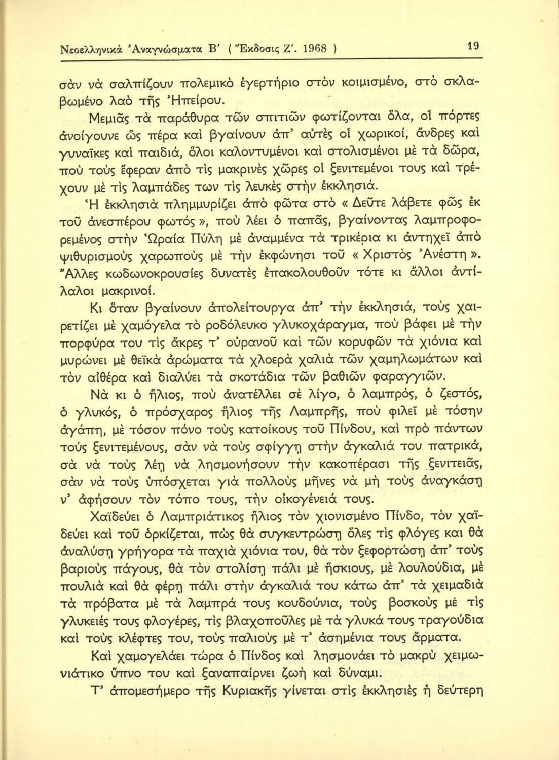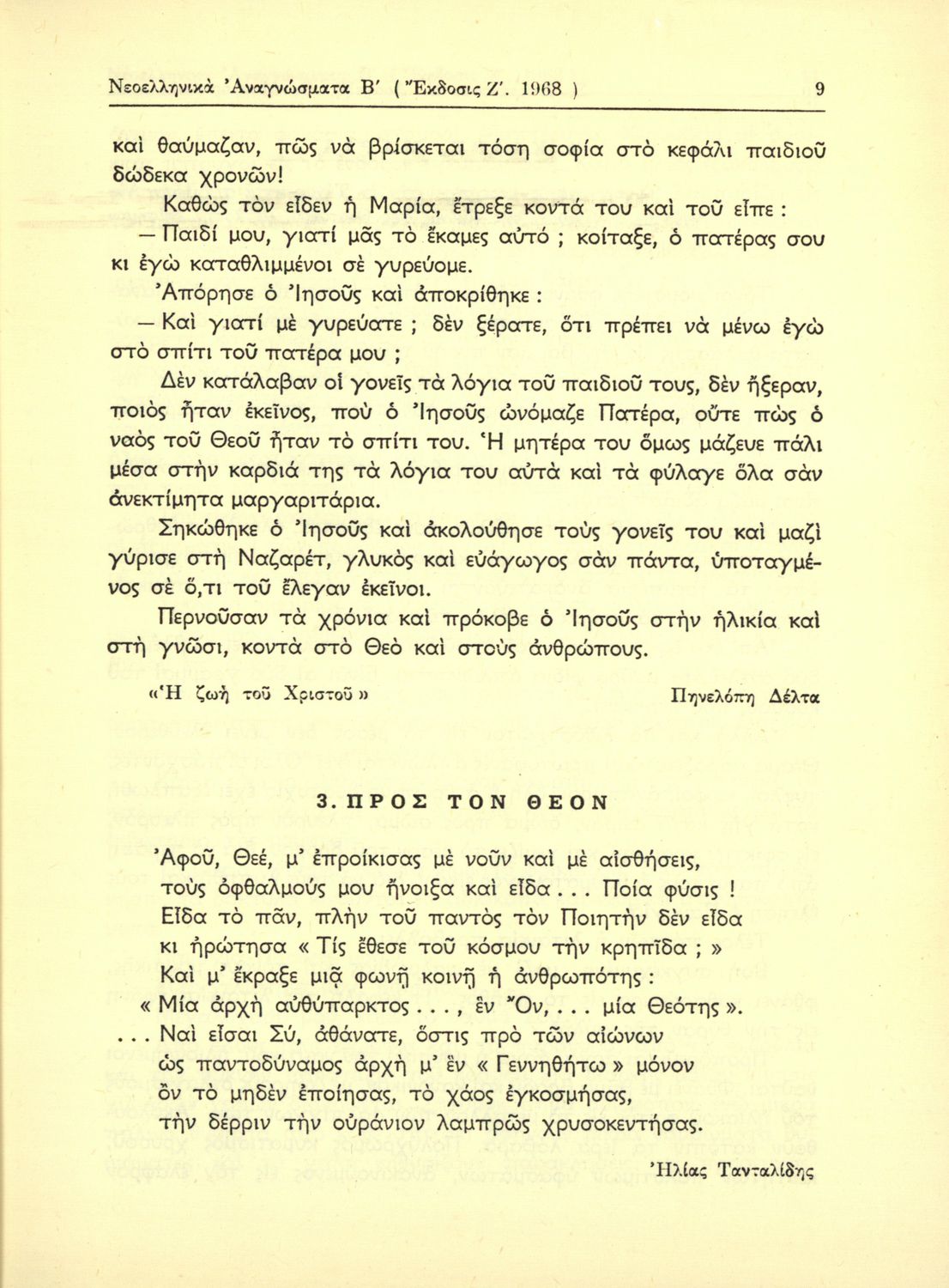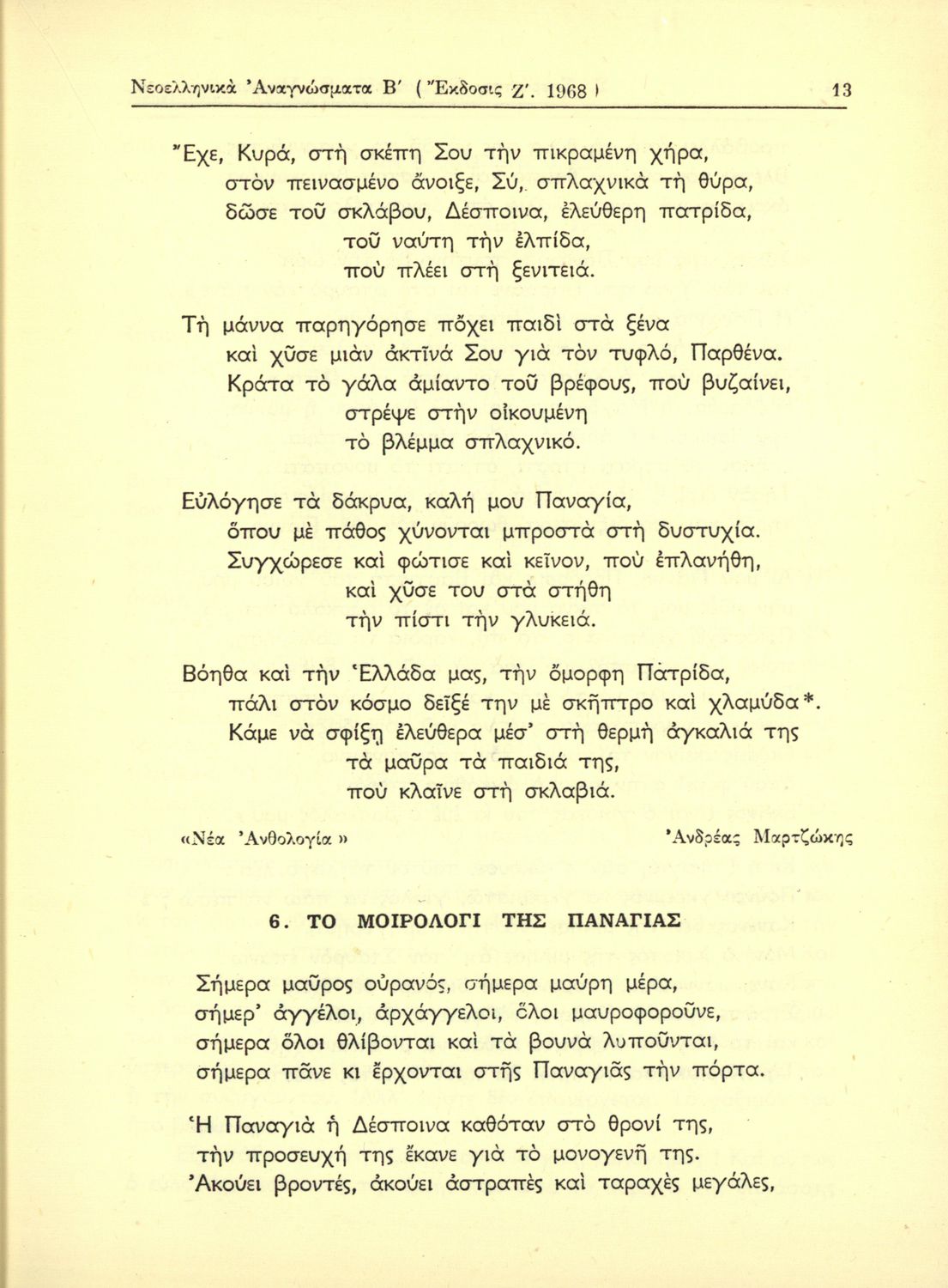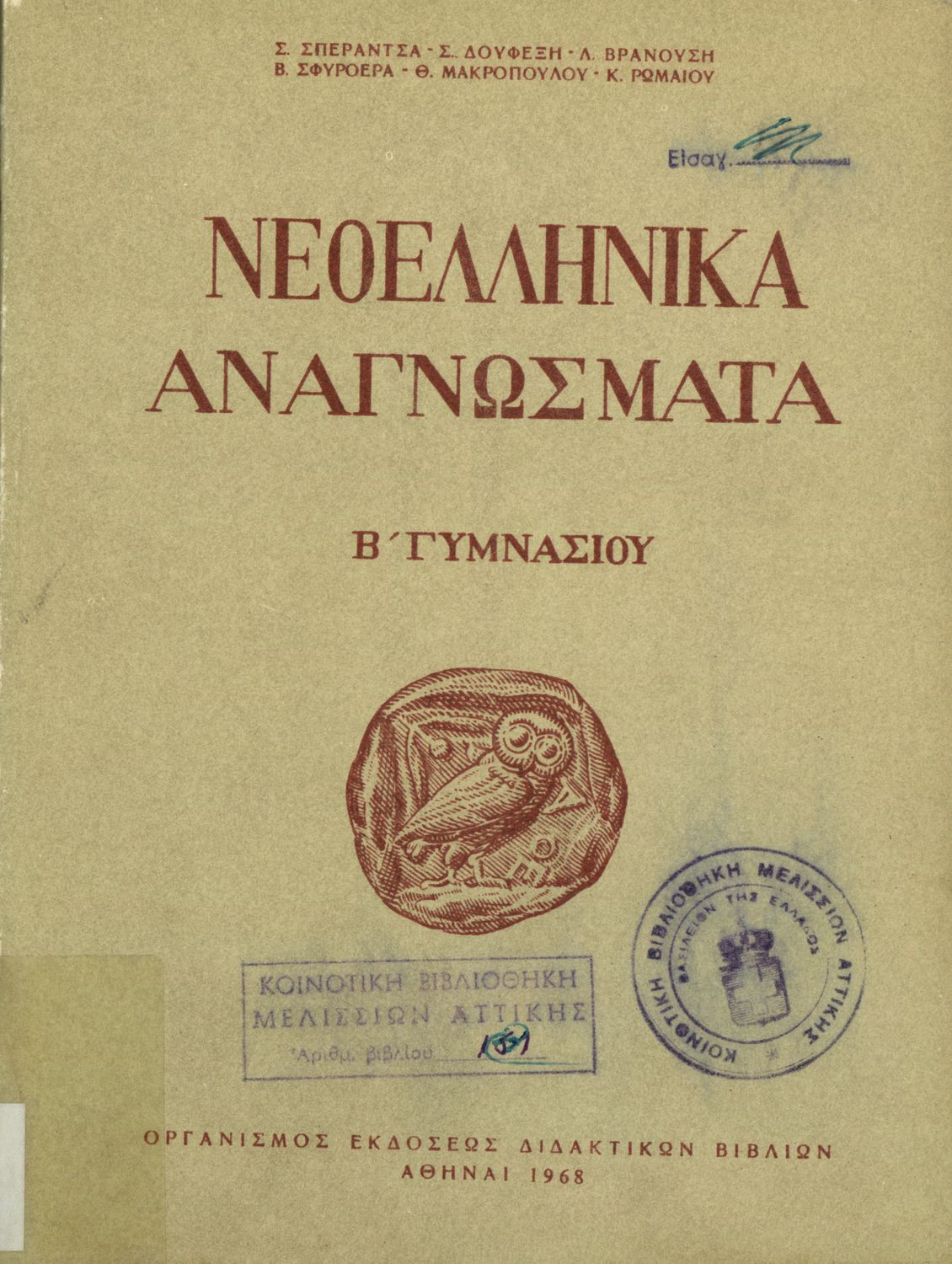 Σχολικό εγχειρίδιο Νέων Ελληνικών Δ΄ Γυμνασίου και Β΄ Αστικού Σχολείου που περιέχει πεζά και ποιήματα Ελλήνων συγγραφέων εμπνευσμένα από τη θρησκευτική και κοινωνική ζωή, την ελληνική μυθολογία, την αρχαία και