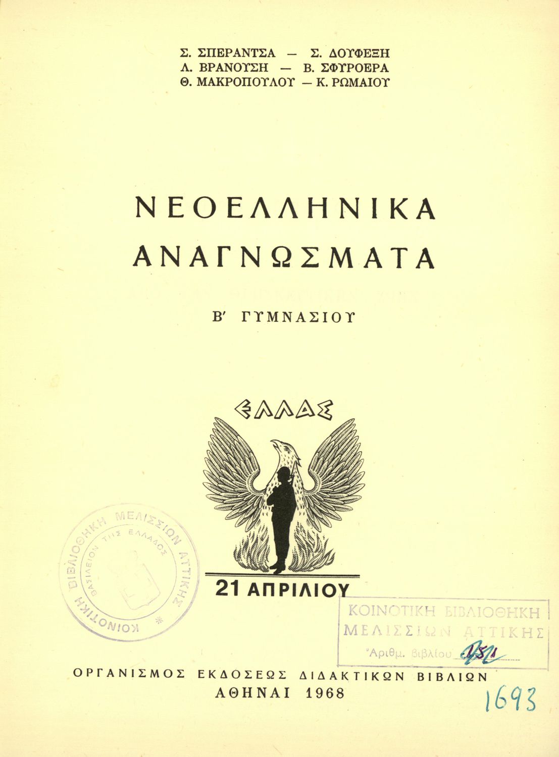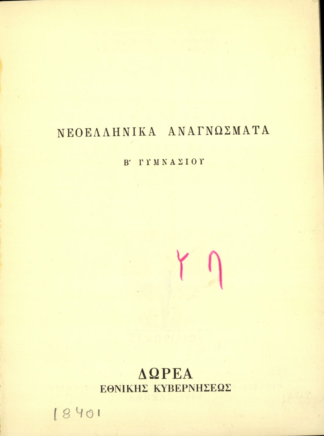 Σχολικό εγχειρίδιο Νέων Ελληνικών Β' Γυμνασίου που περιέχει ποιήματα και πεζά Ελλήνων συγγραφέων εμπνευσμένα από τη θρησκευτική, εθνική, οικογενειακή και κοινωνική ζωή και την ελληνική φύση. Περιέχει παράρτημα με βιογραφίες των συγγραφέων και λεξιλόγιο. Φέρει το σύμβολο της δικτατορίας.