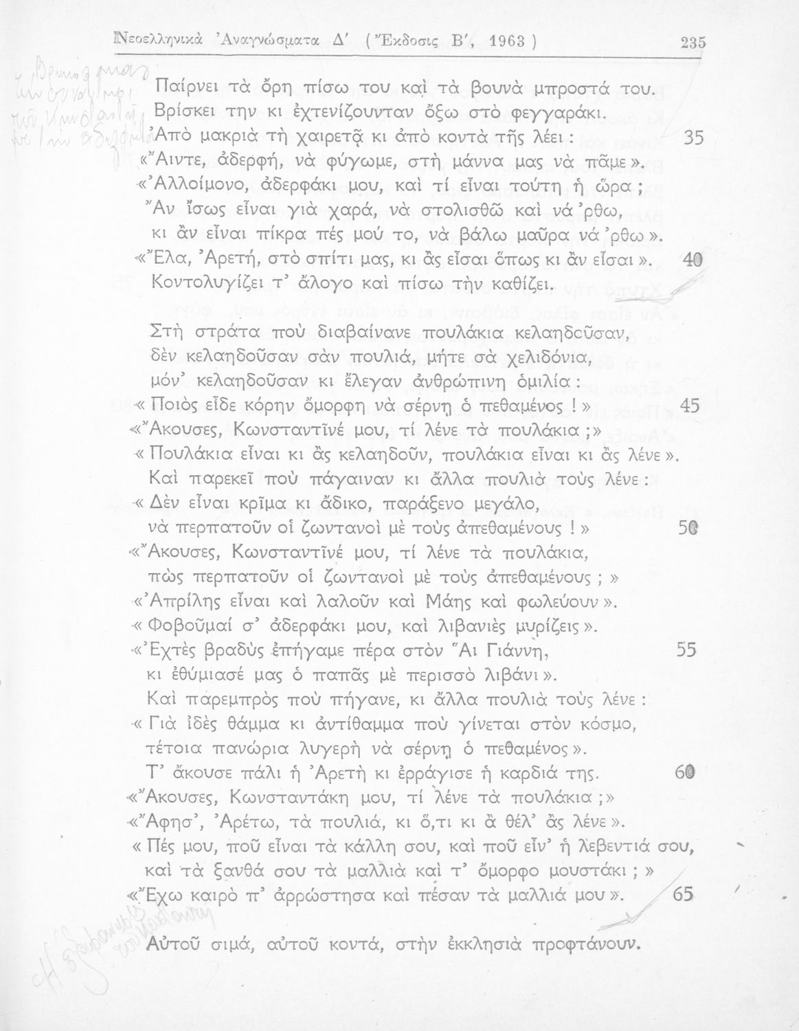 Σχολικό εγχειρίδιο Νέων Ελληνικών Δ΄ Γυμνασίου Θηλέων που περιλαμβάνει πεζά, ποιήματα και δημοτικά τραγούδια εμπνευσμένα από την σύγχρονη ελληνική ιστορία και την οικογενειακή και θρησκευτική ζωή. Περιέχει και