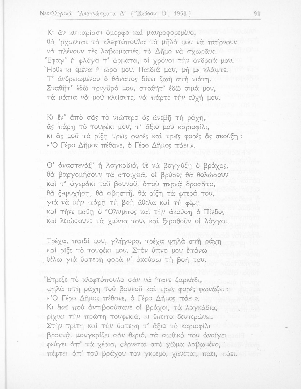 Σχολικό εγχειρίδιο Νέων Ελληνικών Δ΄ Γυμνασίου Θηλέων που περιλαμβάνει πεζά, ποιήματα και δημοτικά τραγούδια εμπνευσμένα από την σύγχρονη ελληνική ιστορία και την οικογενειακή και θρησκευτική ζωή. Περιέχει και
