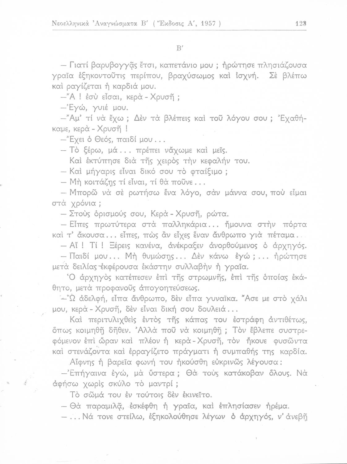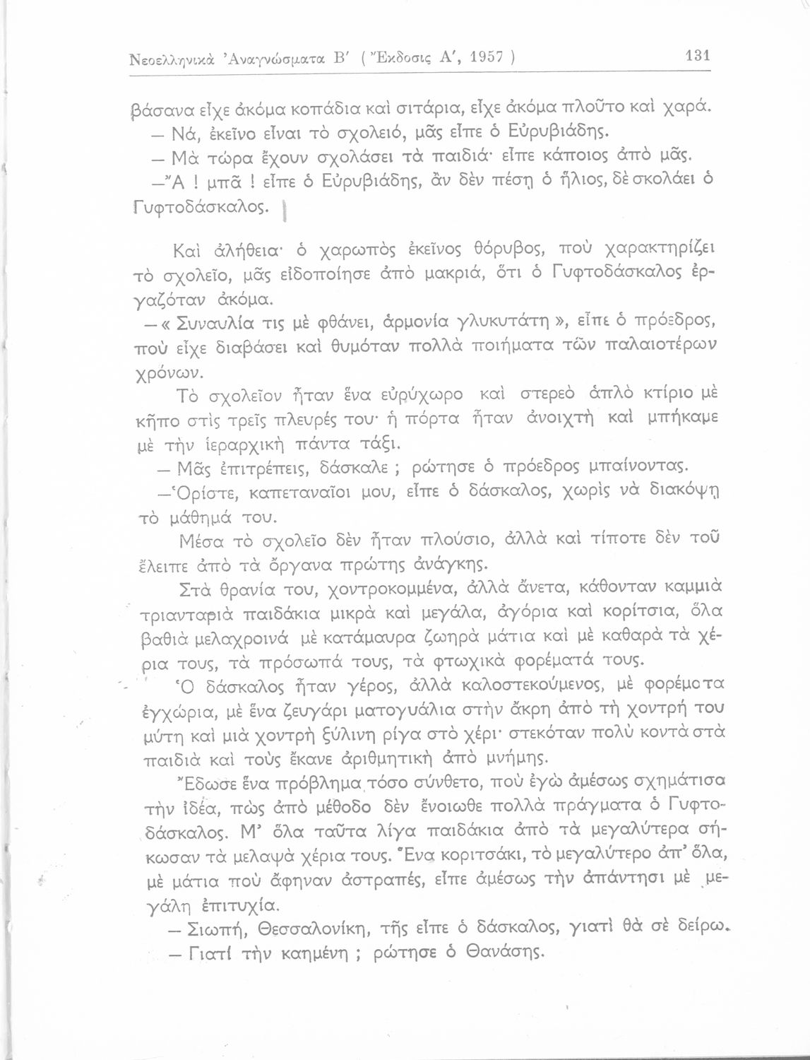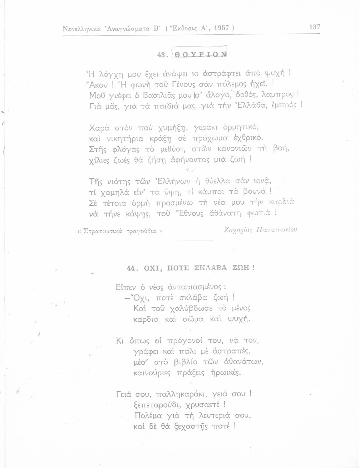 Σχολικό εγχειρίδιο Νέων Ελληνικών Δ΄ Γυμνασίου και Β΄ Αστικού Σχολείου που περιέχει πεζά και ποιήματα Ελλήνων συγγραφέων εμπνευσμένα από τη θρησκευτική και κοινωνική ζωή, την ελληνική μυθολογία, την αρχαία και