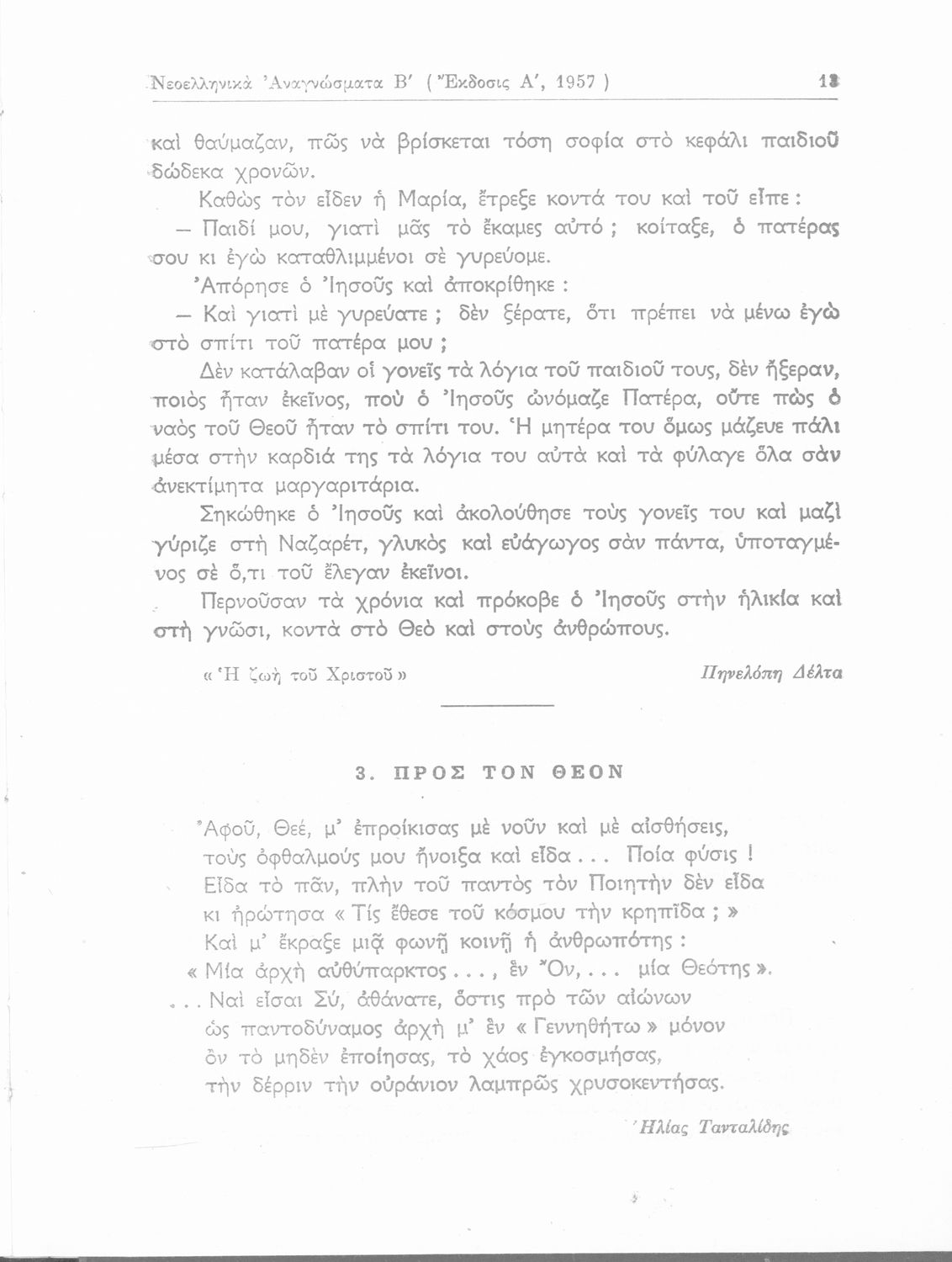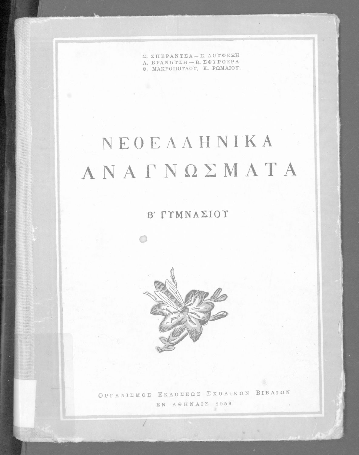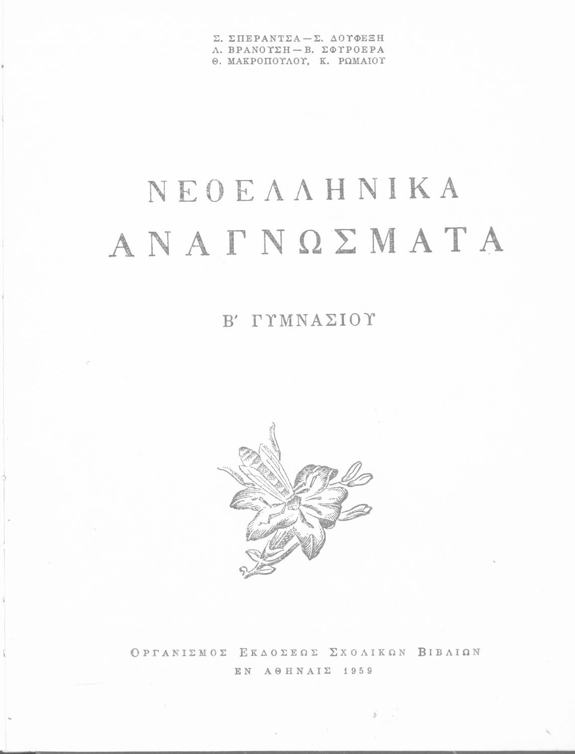 Σχολικό εγχειρίδιο Νέων Ελληνικών Δ΄ Γυμνασίου και Β΄ Αστικού Σχολείου που περιέχει πεζά και ποιήματα Ελλήνων συγγραφέων εμπνευσμένα από τη θρησκευτική και κοινωνική ζωή, την ελληνική μυθολογία, την αρχαία και
