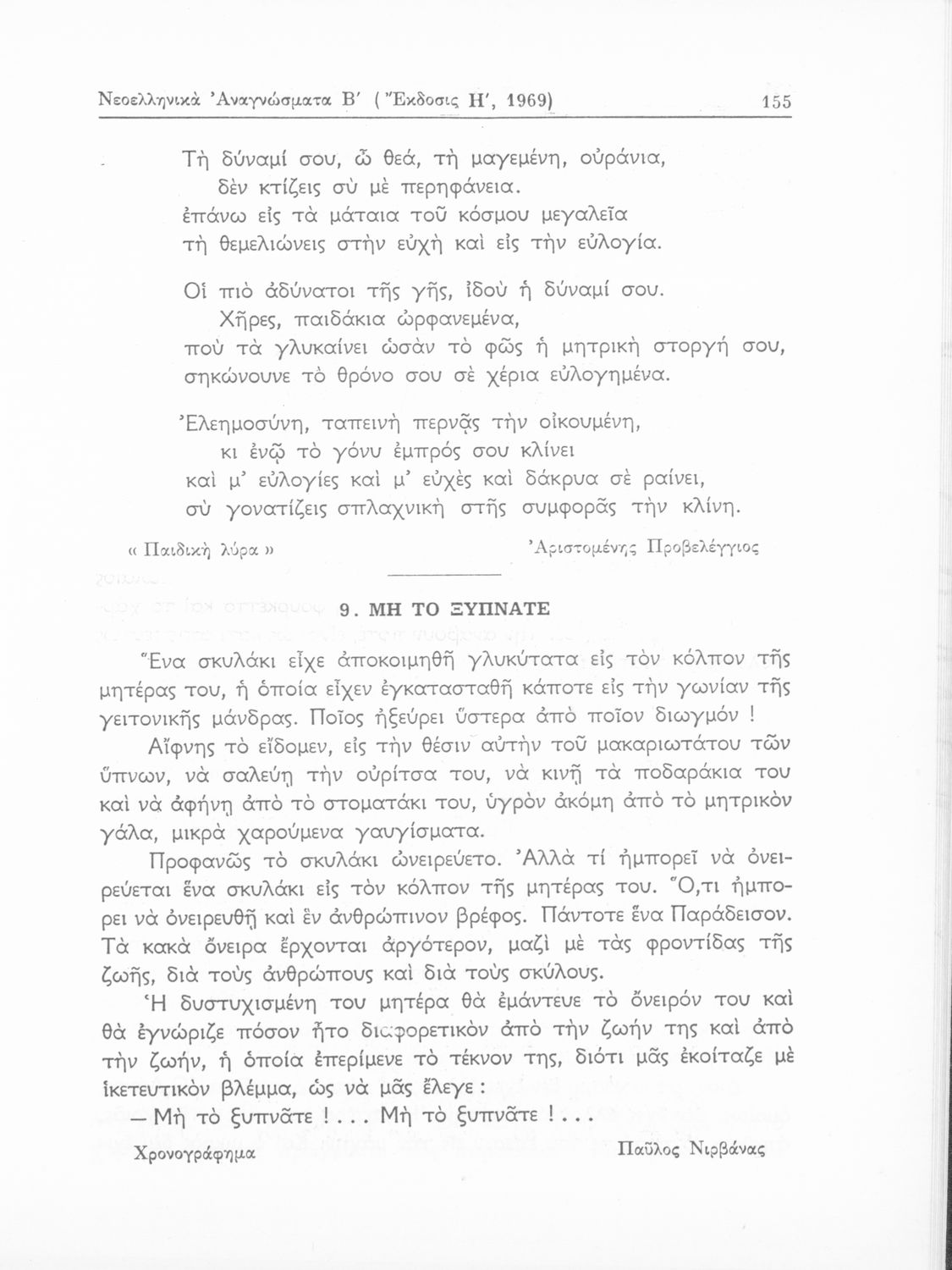 Σχολικό εγχειρίδιο Νέων Ελληνικών Β' Γυμνασίου που περιέχει ποιήματα και πεζά Ελλήνων συγγραφέων εμπνευσμένα από τη θρησκευτική, εθνική, οικογενειακή και κοινωνική ζωή και την ελληνική φύση. Περιέχει παράρτημα