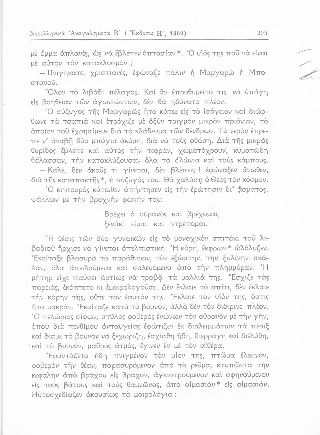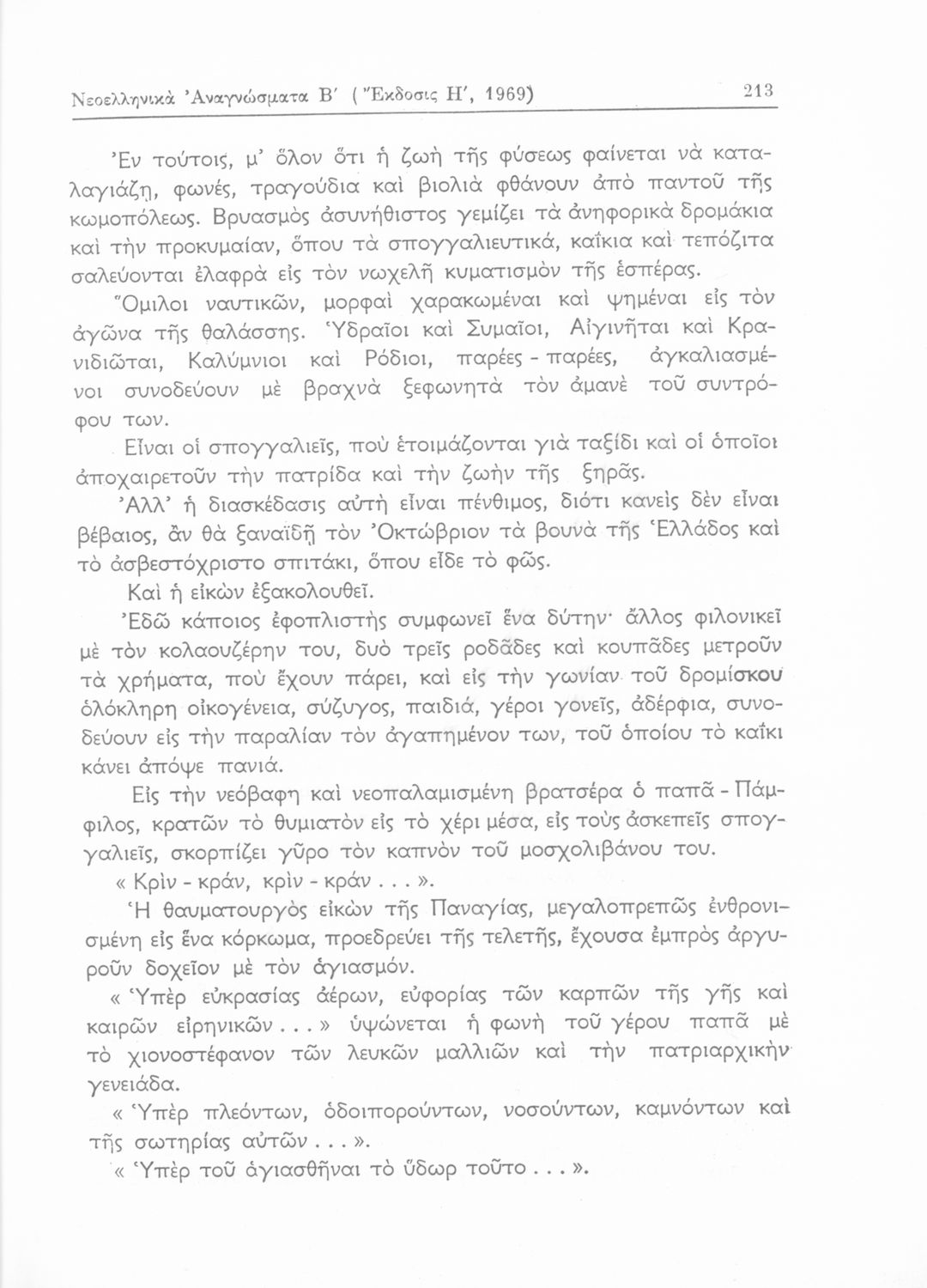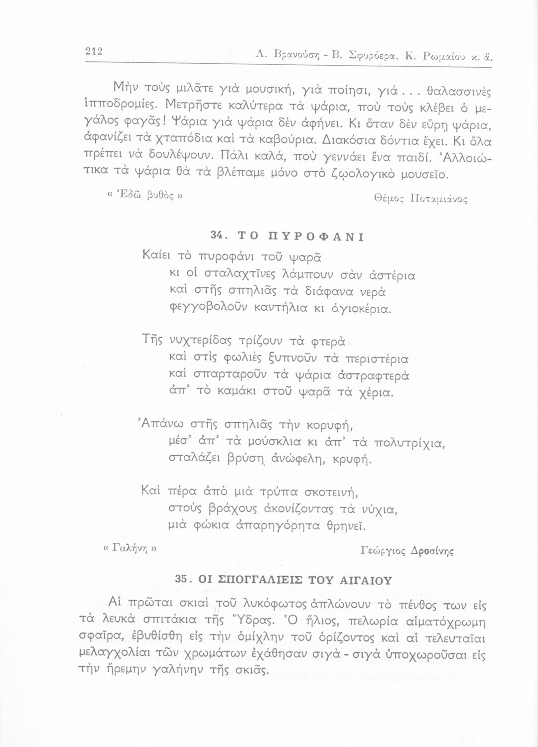 Σχολικό εγχειρίδιο Νέων Ελληνικών Β' Γυμνασίου που περιέχει ποιήματα και πεζά Ελλήνων συγγραφέων εμπνευσμένα από τη θρησκευτική, εθνική, οικογενειακή και κοινωνική ζωή και την ελληνική φύση. Περιέχει παράρτημα με βιογραφίες των συγγραφέων και λεξιλόγιο. Φέρει το σύμβολο της δικτατορίας.