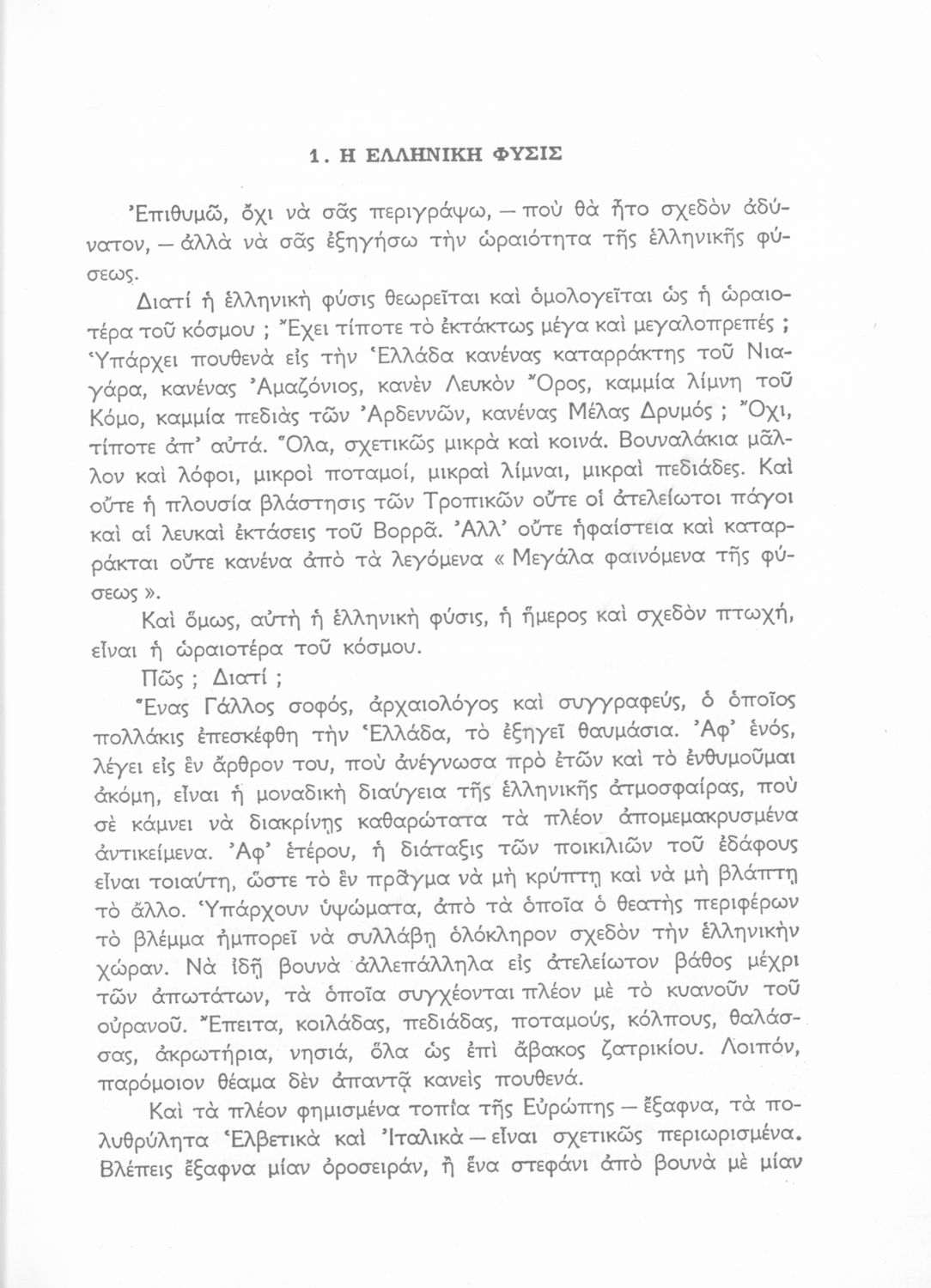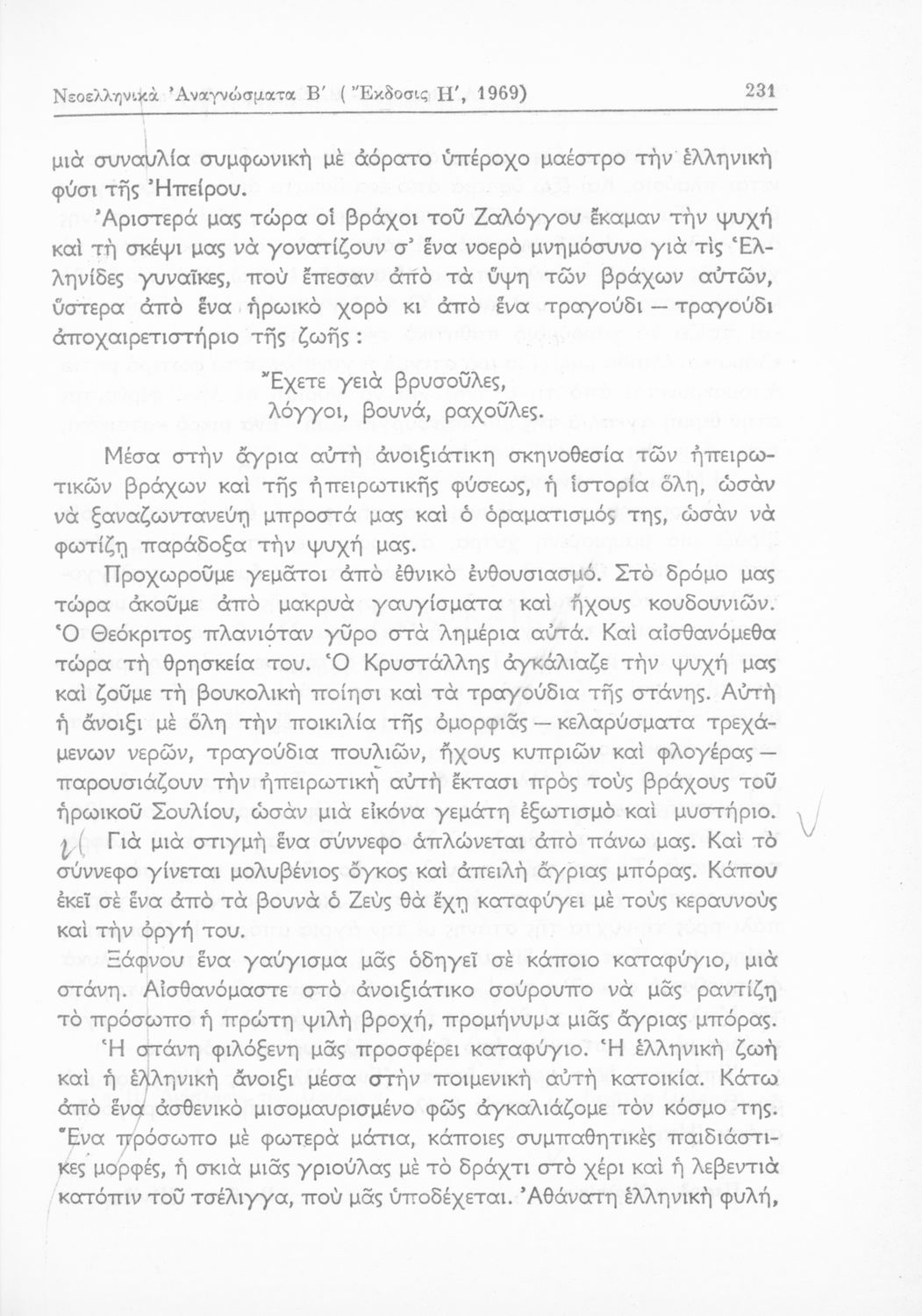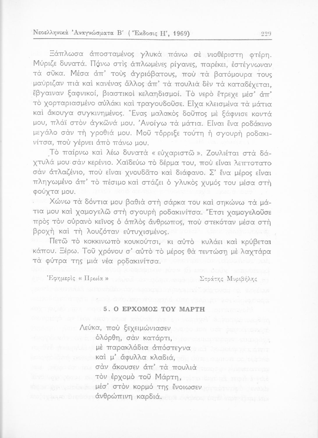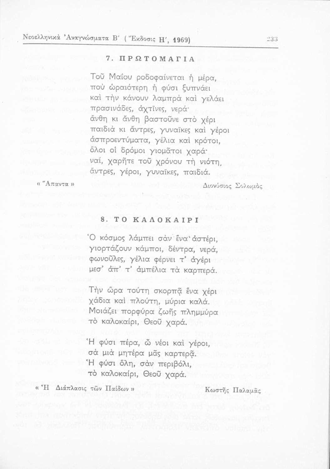 Σχολικό εγχειρίδιο Νέων Ελληνικών Β' Γυμνασίου που περιέχει ποιήματα και πεζά Ελλήνων συγγραφέων εμπνευσμένα από τη θρησκευτική, εθνική, οικογενειακή και κοινωνική ζωή και την ελληνική φύση. Περιέχει παράρτημα με βιογραφίες των συγγραφέων και λεξιλόγιο. Φέρει το σύμβολο της δικτατορίας.