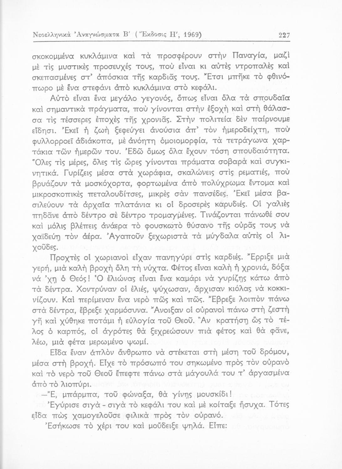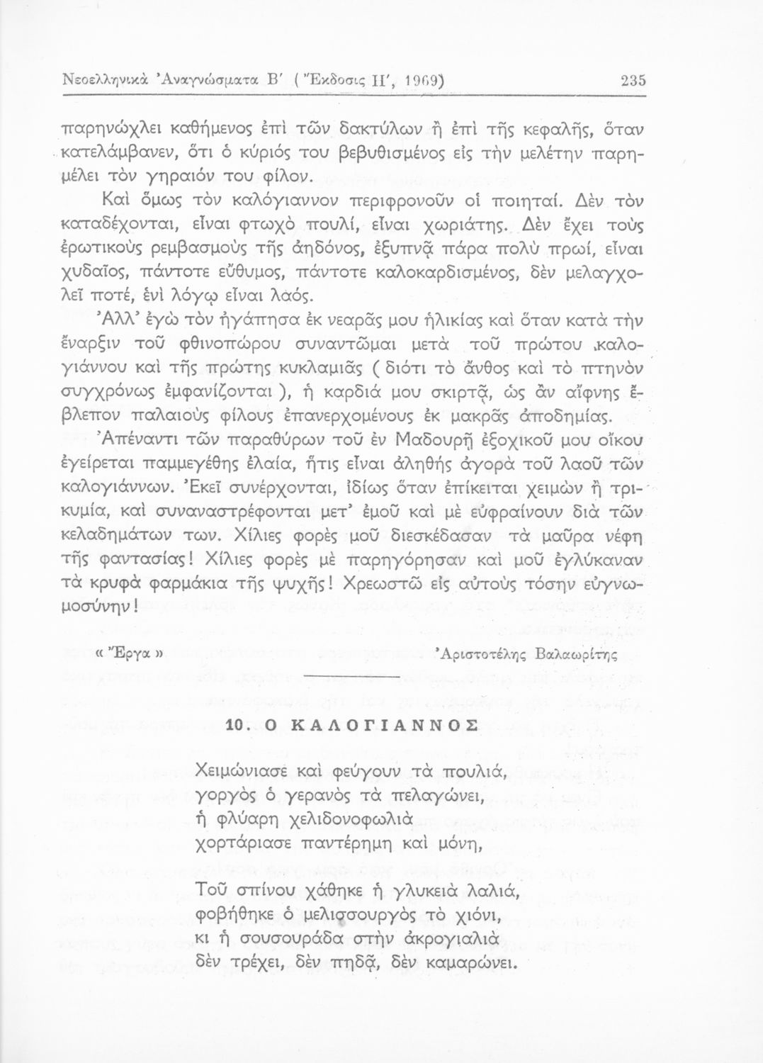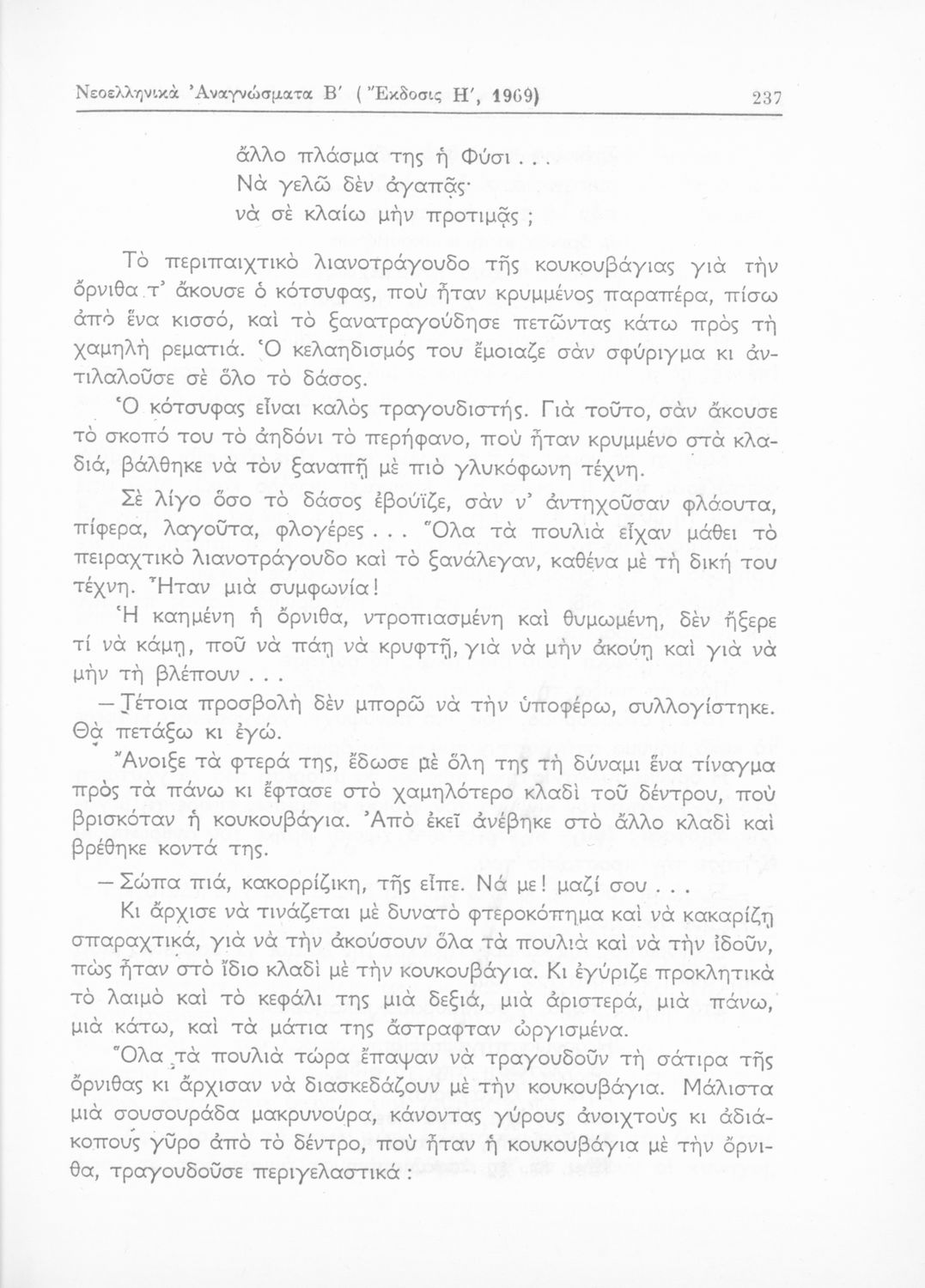 Σχολικό εγχειρίδιο Νέων Ελληνικών Β' Γυμνασίου που περιέχει ποιήματα και πεζά Ελλήνων συγγραφέων εμπνευσμένα από τη θρησκευτική, εθνική, οικογενειακή και κοινωνική ζωή και την ελληνική φύση. Περιέχει παράρτημα με βιογραφίες των συγγραφέων και λεξιλόγιο. Φέρει το σύμβολο της δικτατορίας.