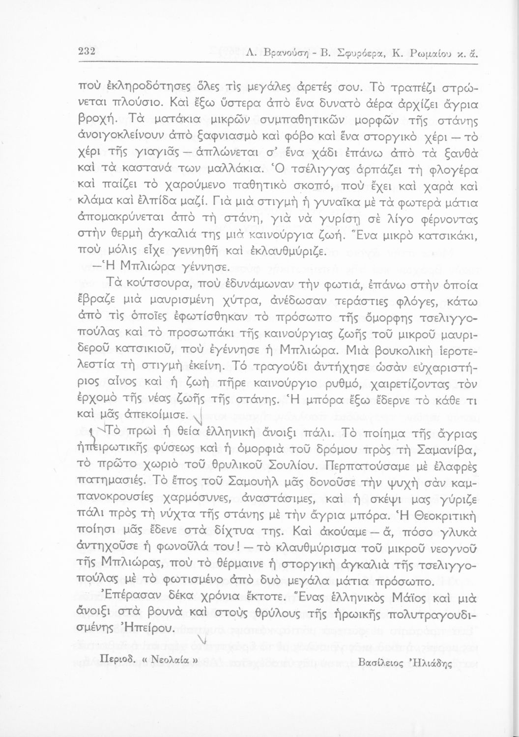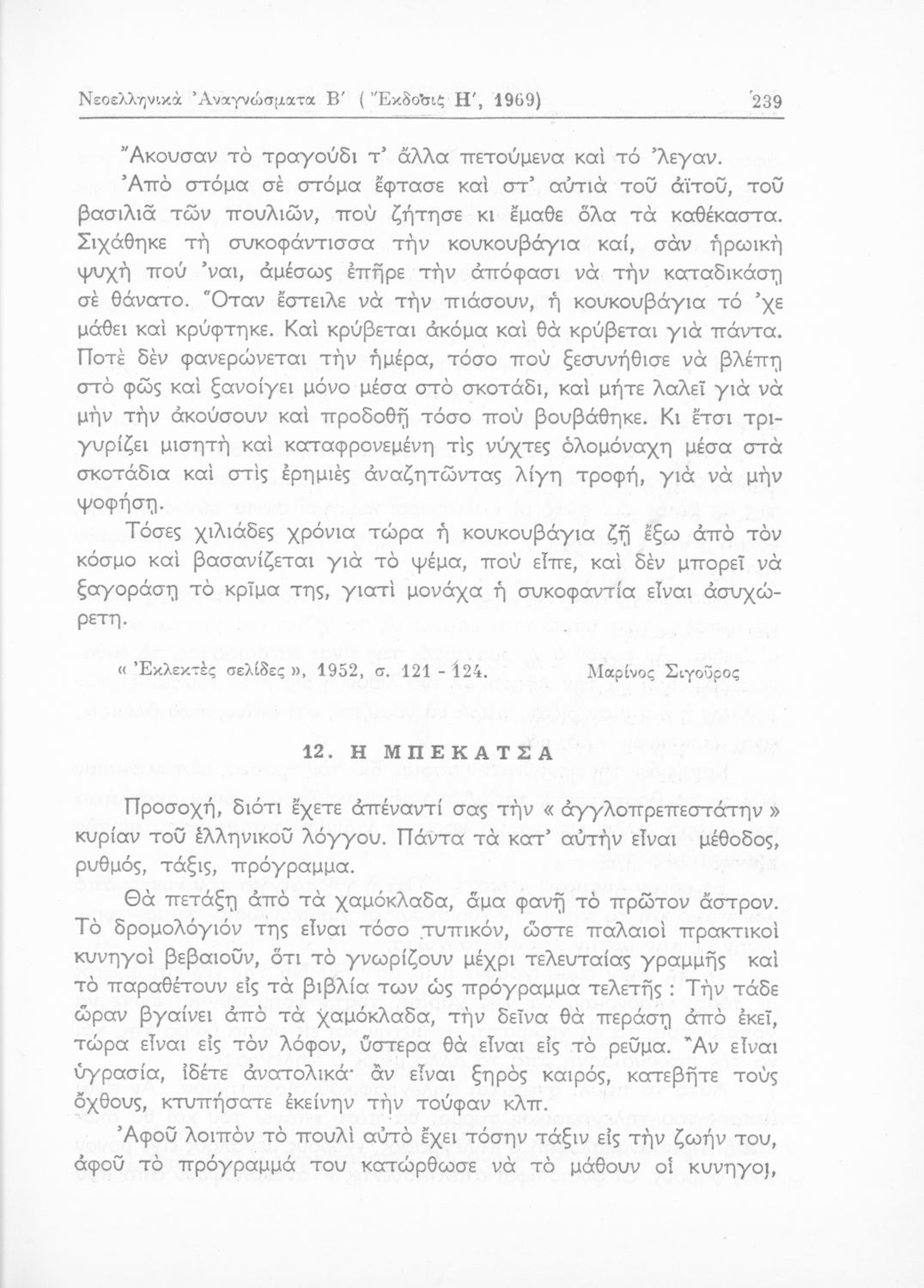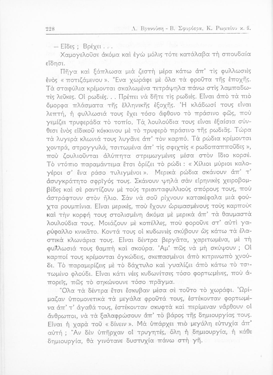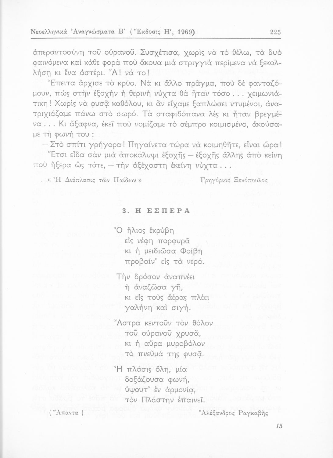 Σχολικό εγχειρίδιο Νέων Ελληνικών Β' Γυμνασίου που περιέχει ποιήματα και πεζά Ελλήνων συγγραφέων εμπνευσμένα από τη θρησκευτική, εθνική, οικογενειακή και κοινωνική ζωή και την ελληνική φύση. Περιέχει παράρτημα με βιογραφίες των συγγραφέων και λεξιλόγιο. Φέρει το σύμβολο της δικτατορίας.