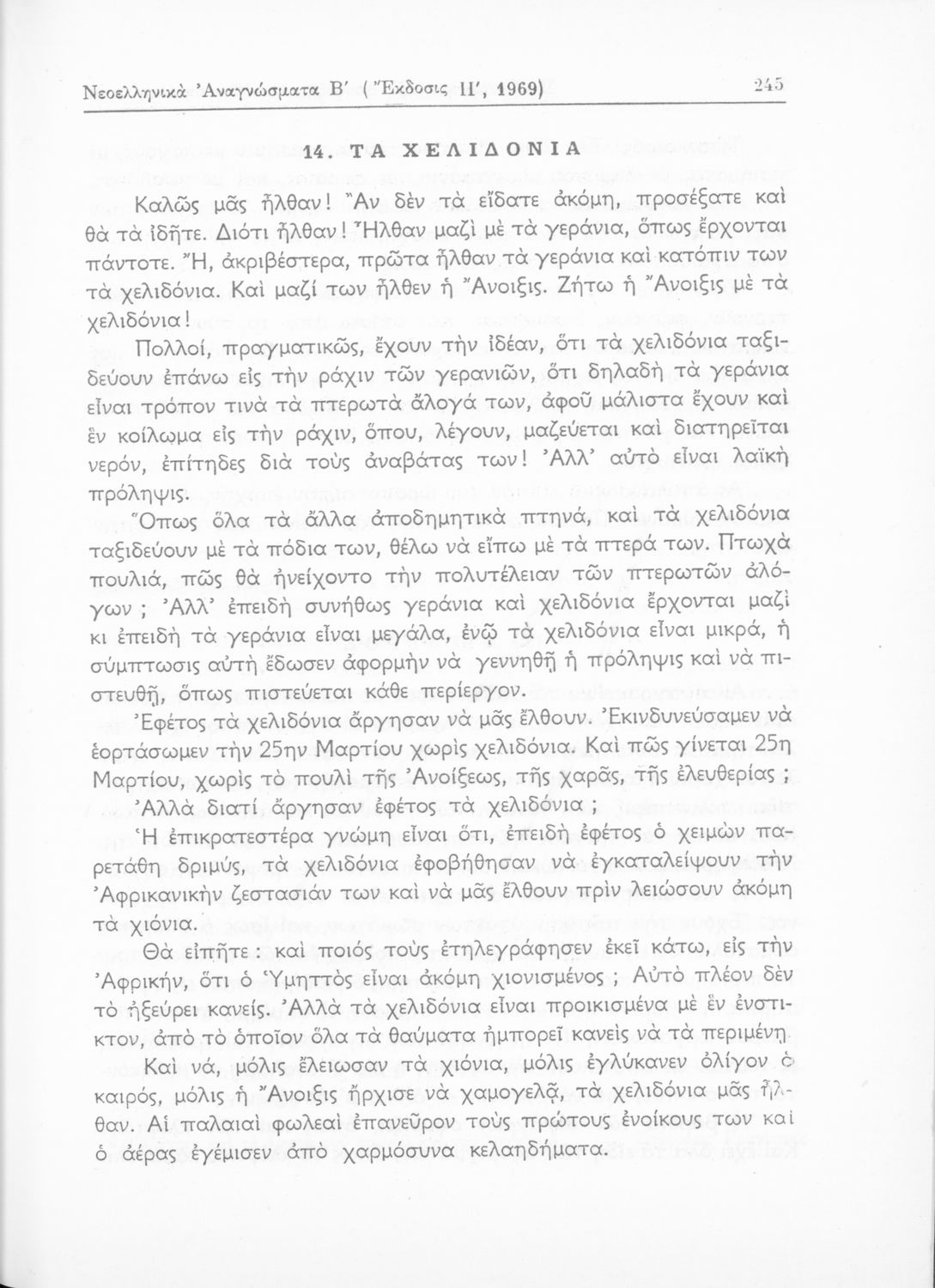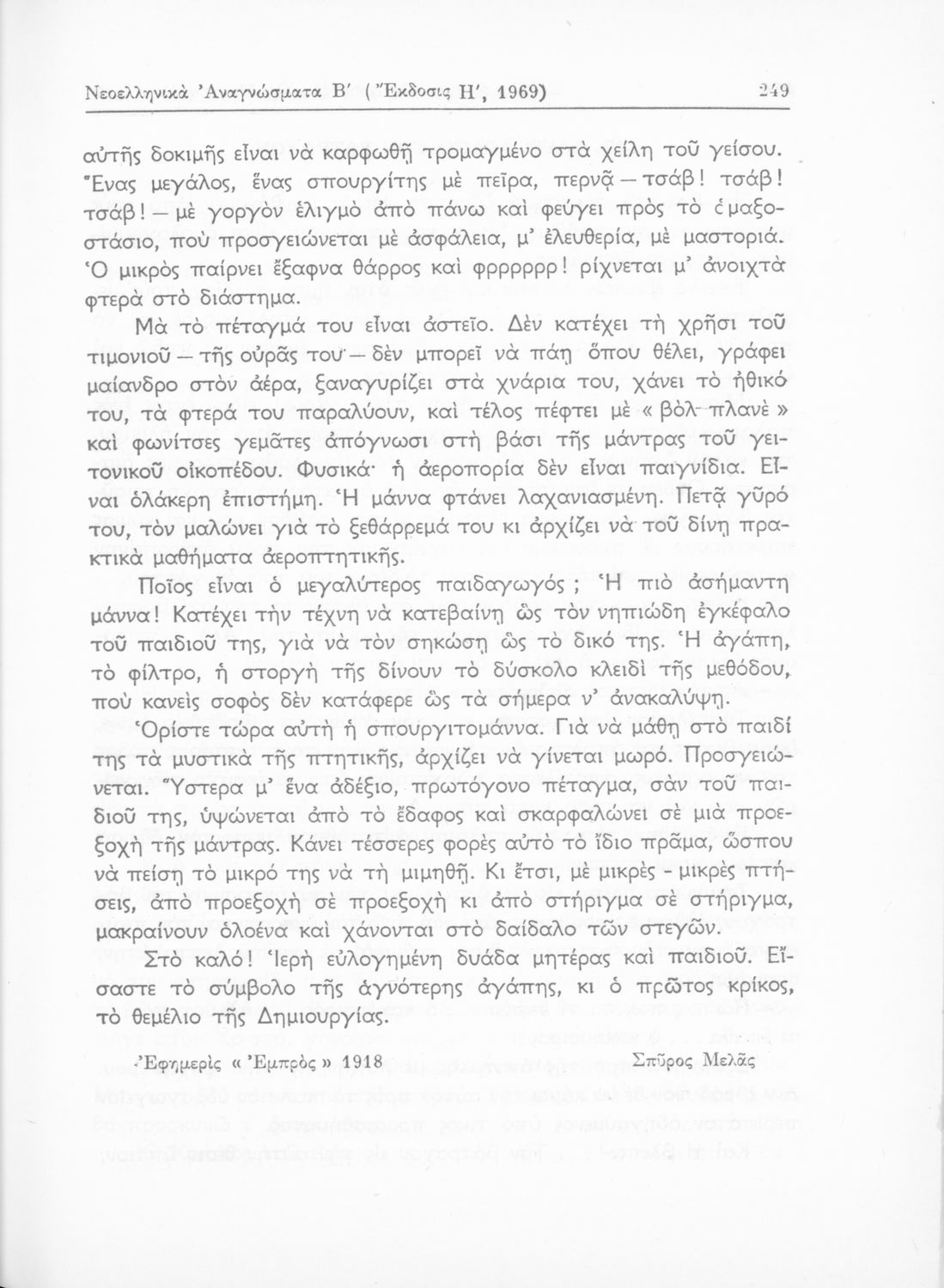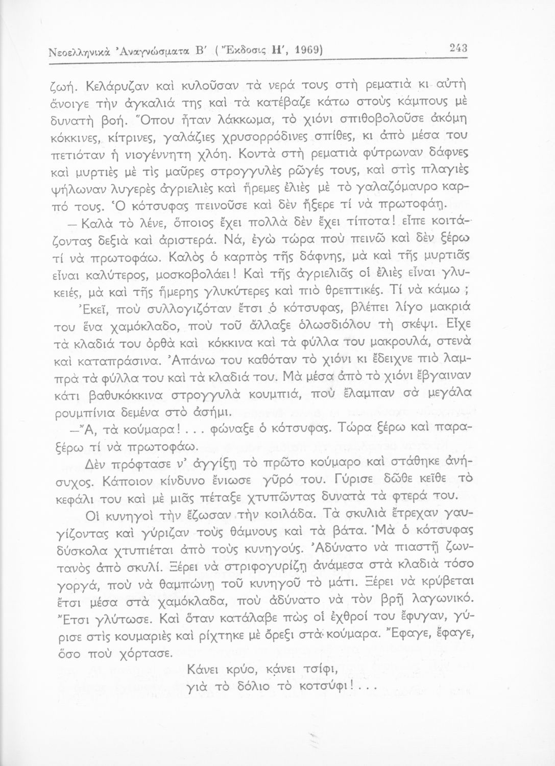 Σχολικό εγχειρίδιο Νέων Ελληνικών Β' Γυμνασίου που περιέχει ποιήματα και πεζά Ελλήνων συγγραφέων εμπνευσμένα από τη θρησκευτική, εθνική, οικογενειακή και κοινωνική ζωή και την ελληνική φύση. Περιέχει παράρτημα με βιογραφίες των συγγραφέων και λεξιλόγιο. Φέρει το σύμβολο της δικτατορίας.