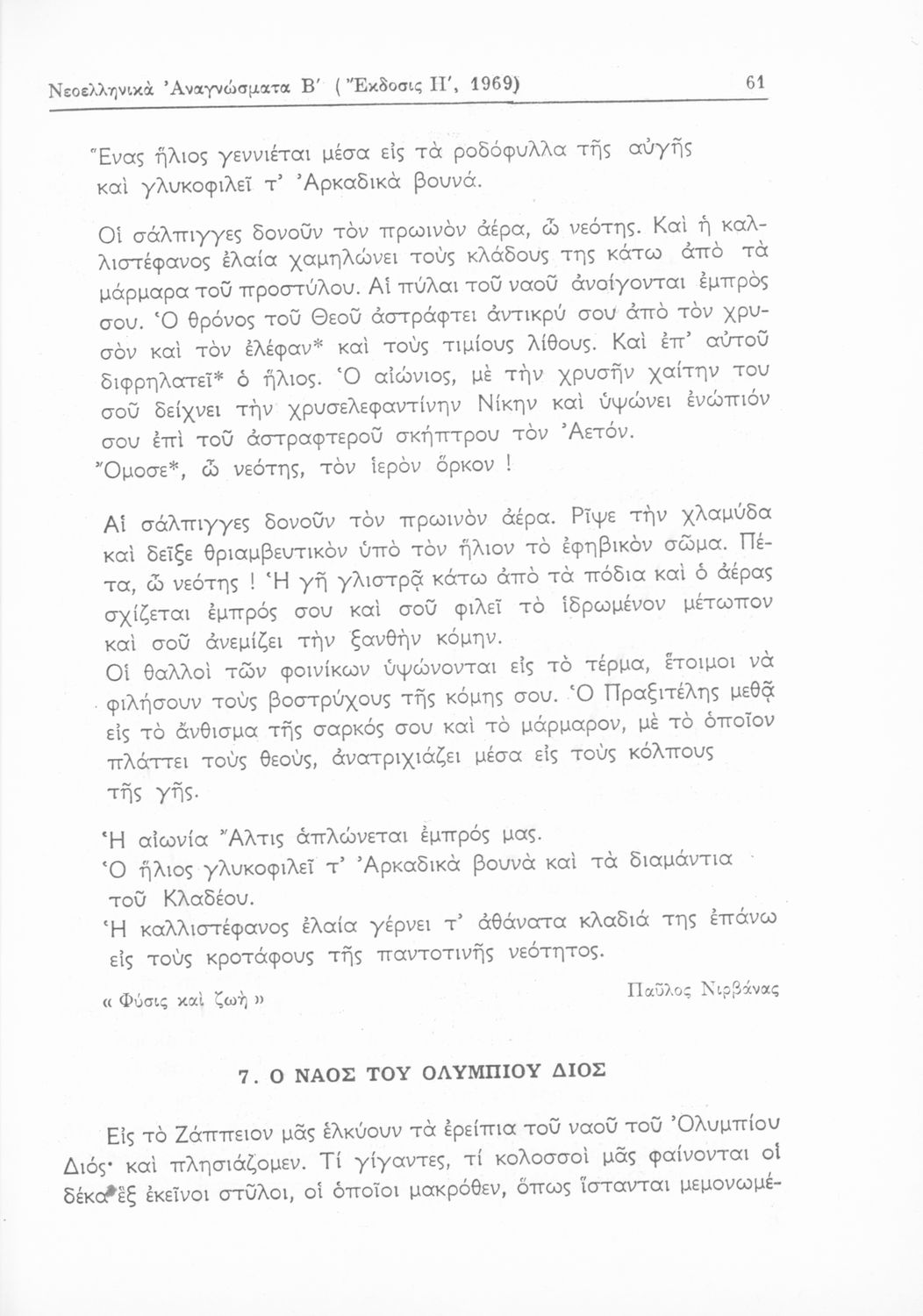 Σχολικό εγχειρίδιο Νέων Ελληνικών Β' Γυμνασίου που περιέχει ποιήματα και πεζά Ελλήνων συγγραφέων εμπνευσμένα από τη θρησκευτική, εθνική, οικογενειακή και κοινωνική ζωή και την ελληνική φύση. Περιέχει παράρτημα με βιογραφίες των συγγραφέων και λεξιλόγιο. Φέρει το σύμβολο της δικτατορίας.
