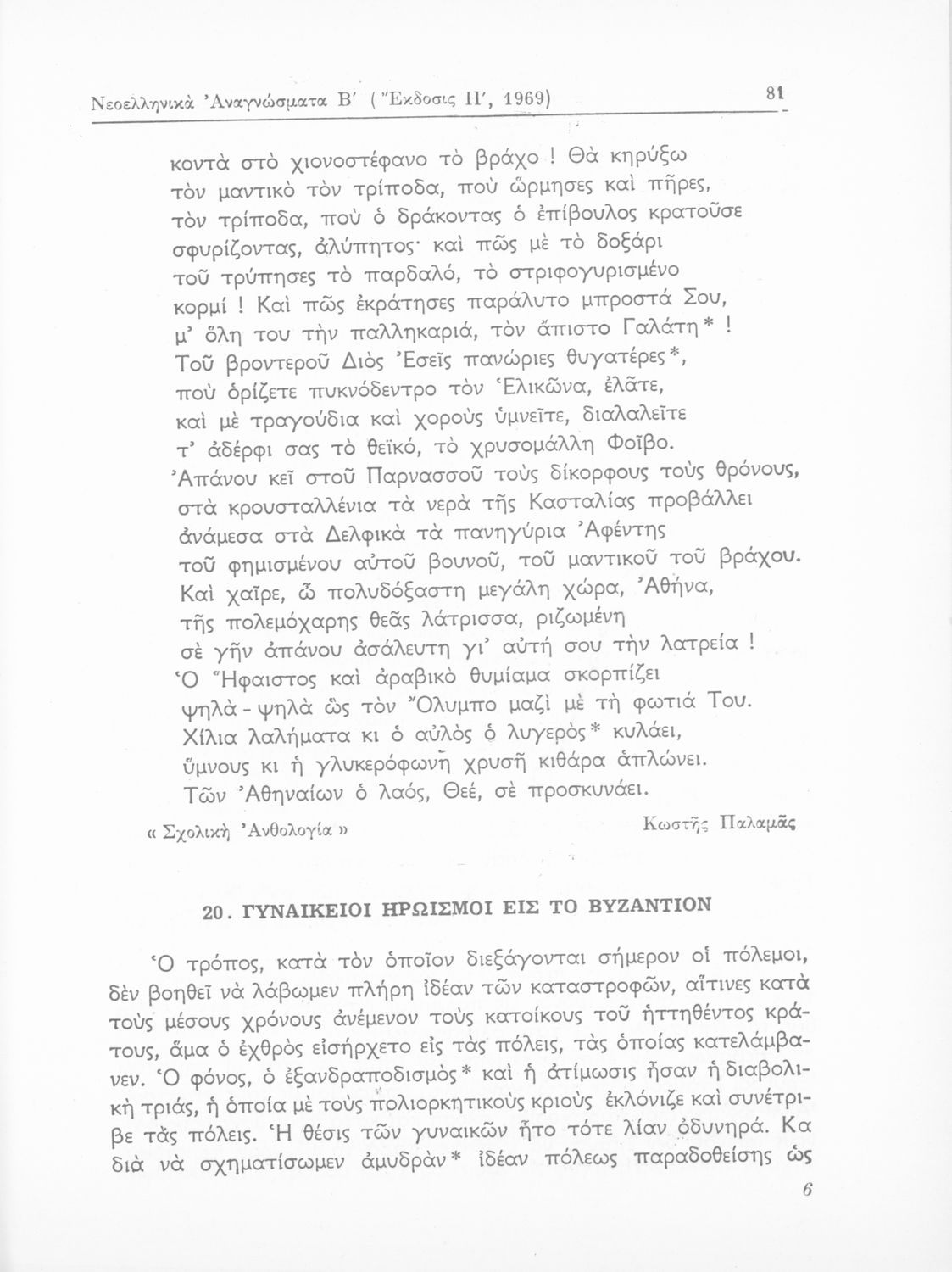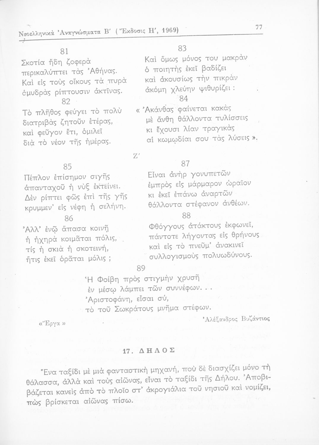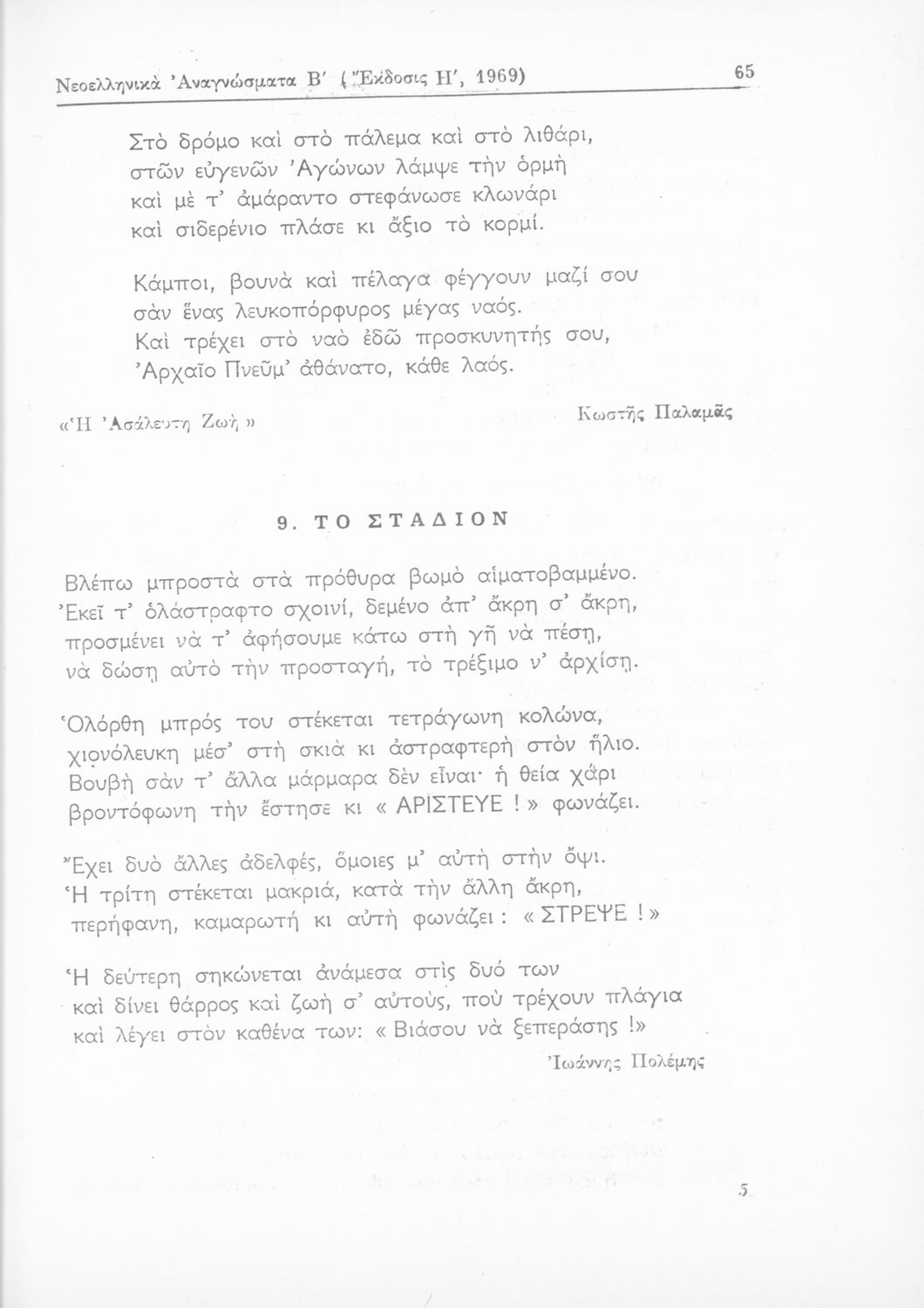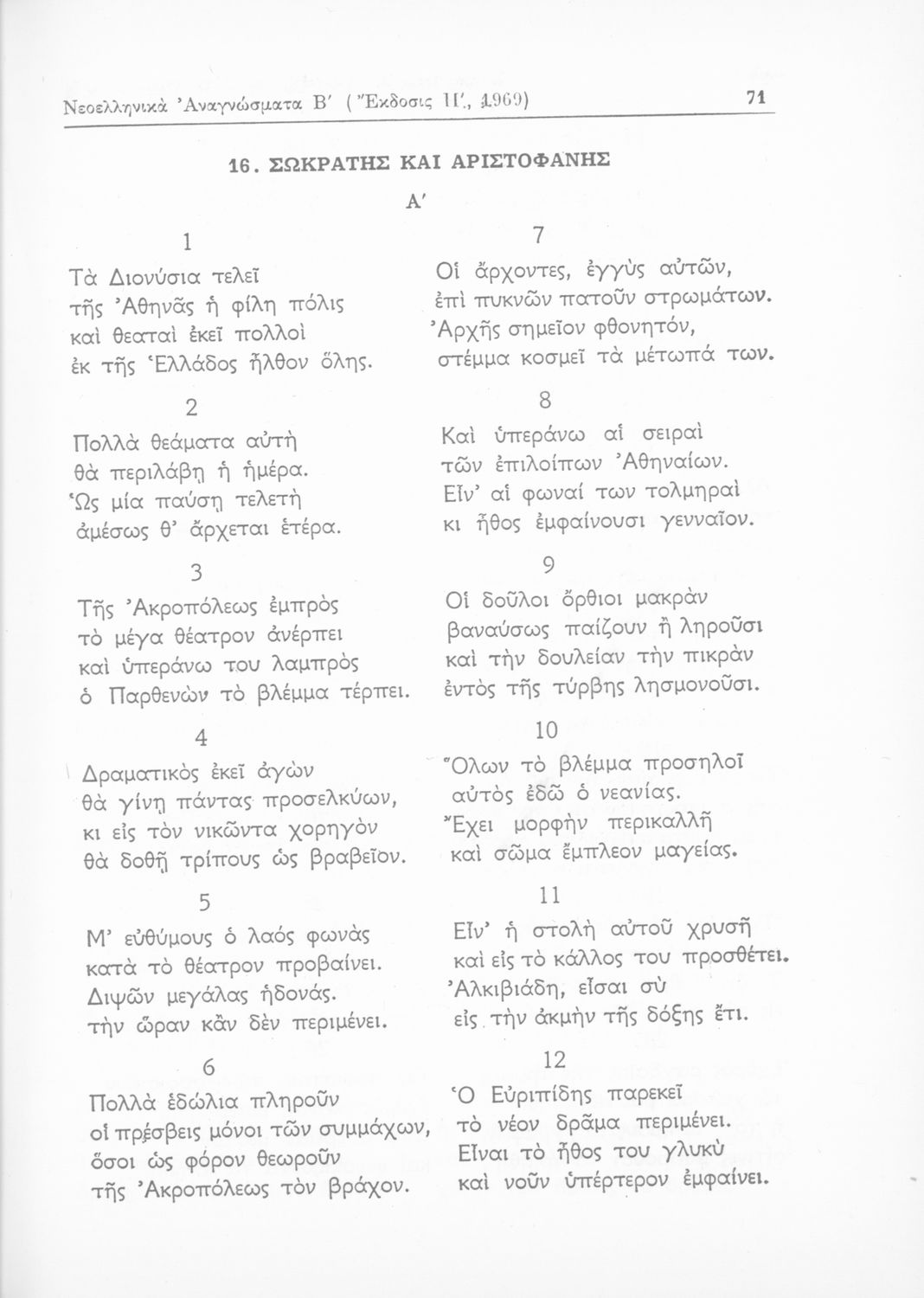 Σχολικό εγχειρίδιο Νέων Ελληνικών Β' Γυμνασίου που περιέχει ποιήματα και πεζά Ελλήνων συγγραφέων εμπνευσμένα από τη θρησκευτική, εθνική, οικογενειακή και κοινωνική ζωή και την ελληνική φύση. Περιέχει παράρτημα με βιογραφίες των συγγραφέων και λεξιλόγιο. Φέρει το σύμβολο της δικτατορίας.