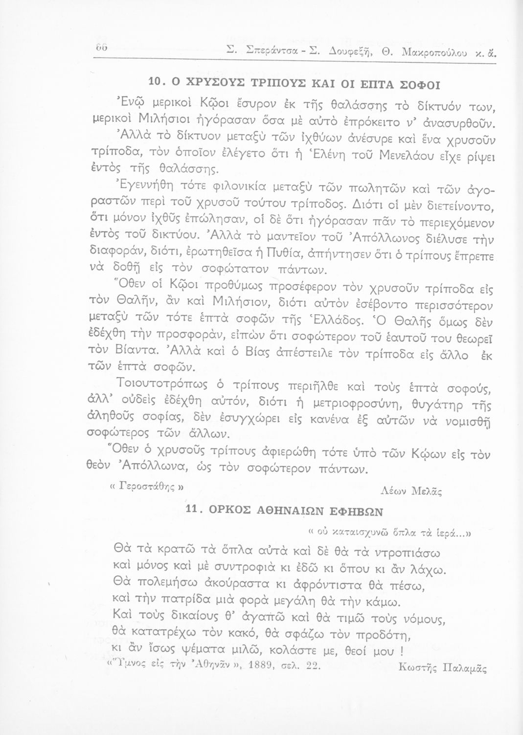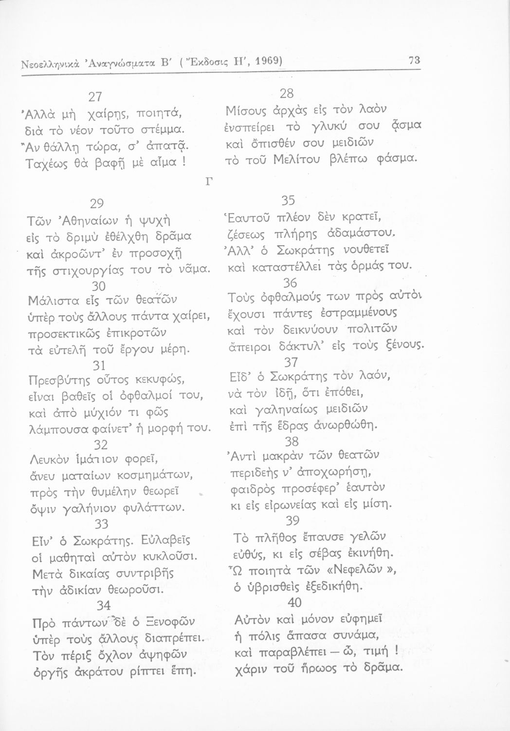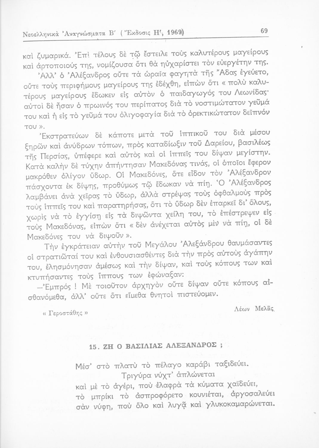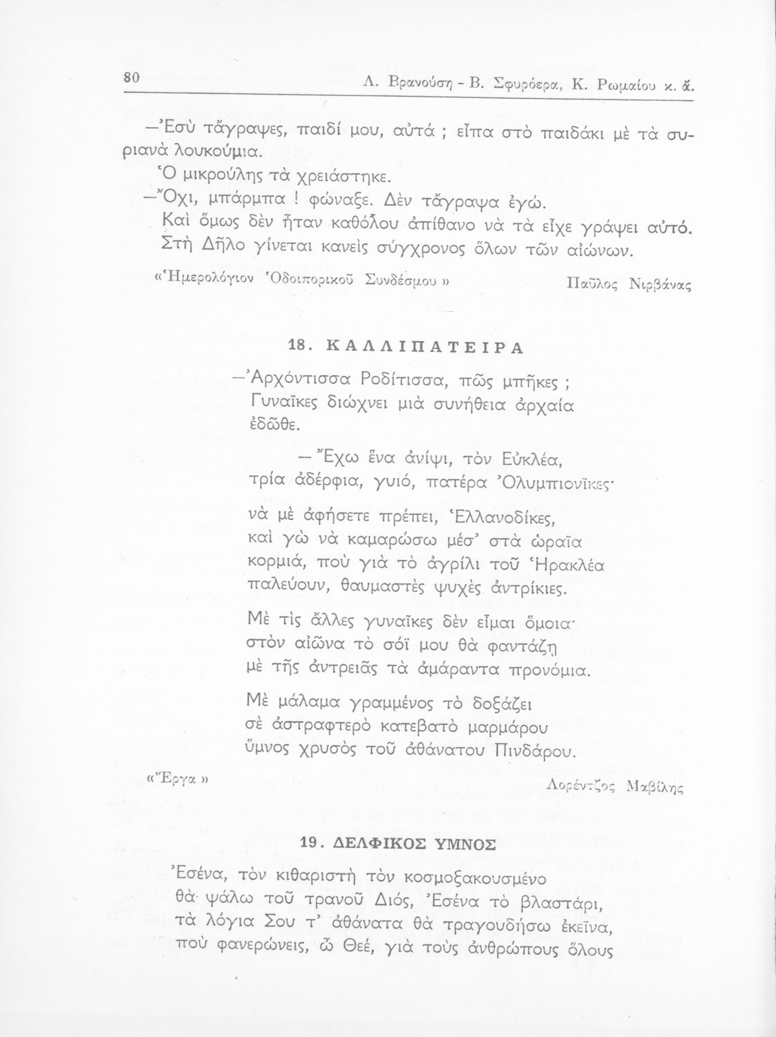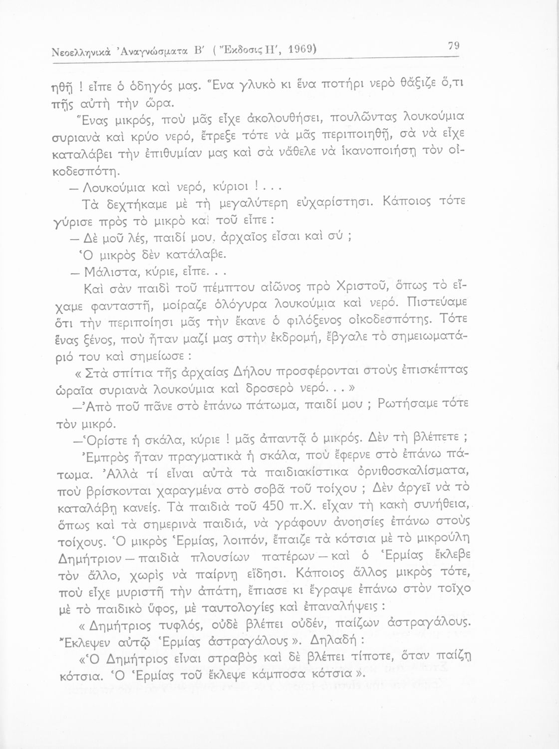 Σχολικό εγχειρίδιο Νέων Ελληνικών Β' Γυμνασίου που περιέχει ποιήματα και πεζά Ελλήνων συγγραφέων εμπνευσμένα από τη θρησκευτική, εθνική, οικογενειακή και κοινωνική ζωή και την ελληνική φύση. Περιέχει παράρτημα με βιογραφίες των συγγραφέων και λεξιλόγιο. Φέρει το σύμβολο της δικτατορίας.