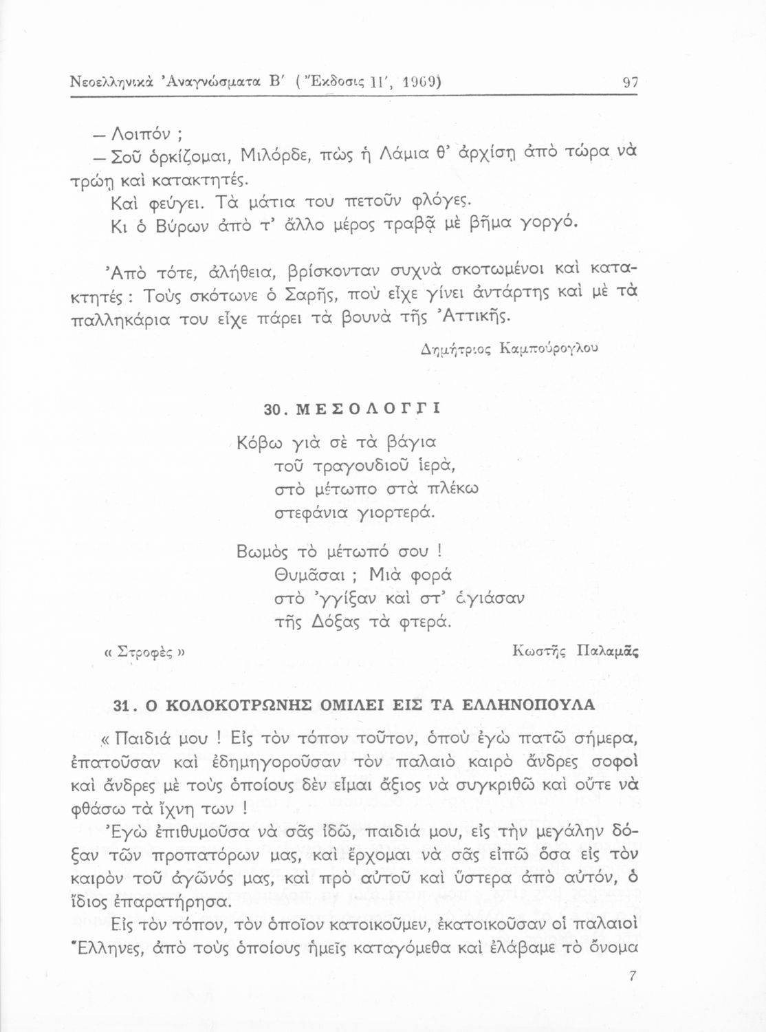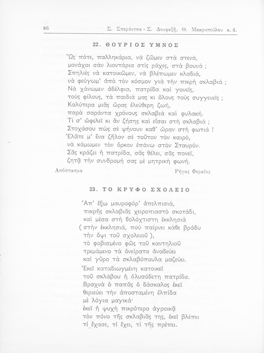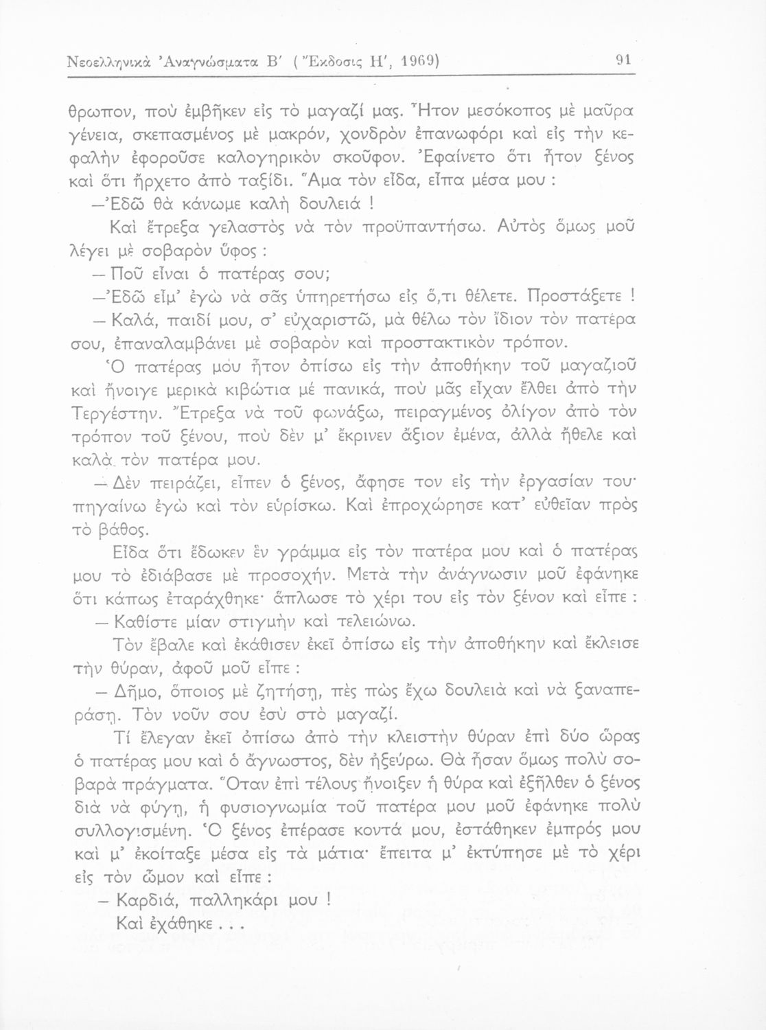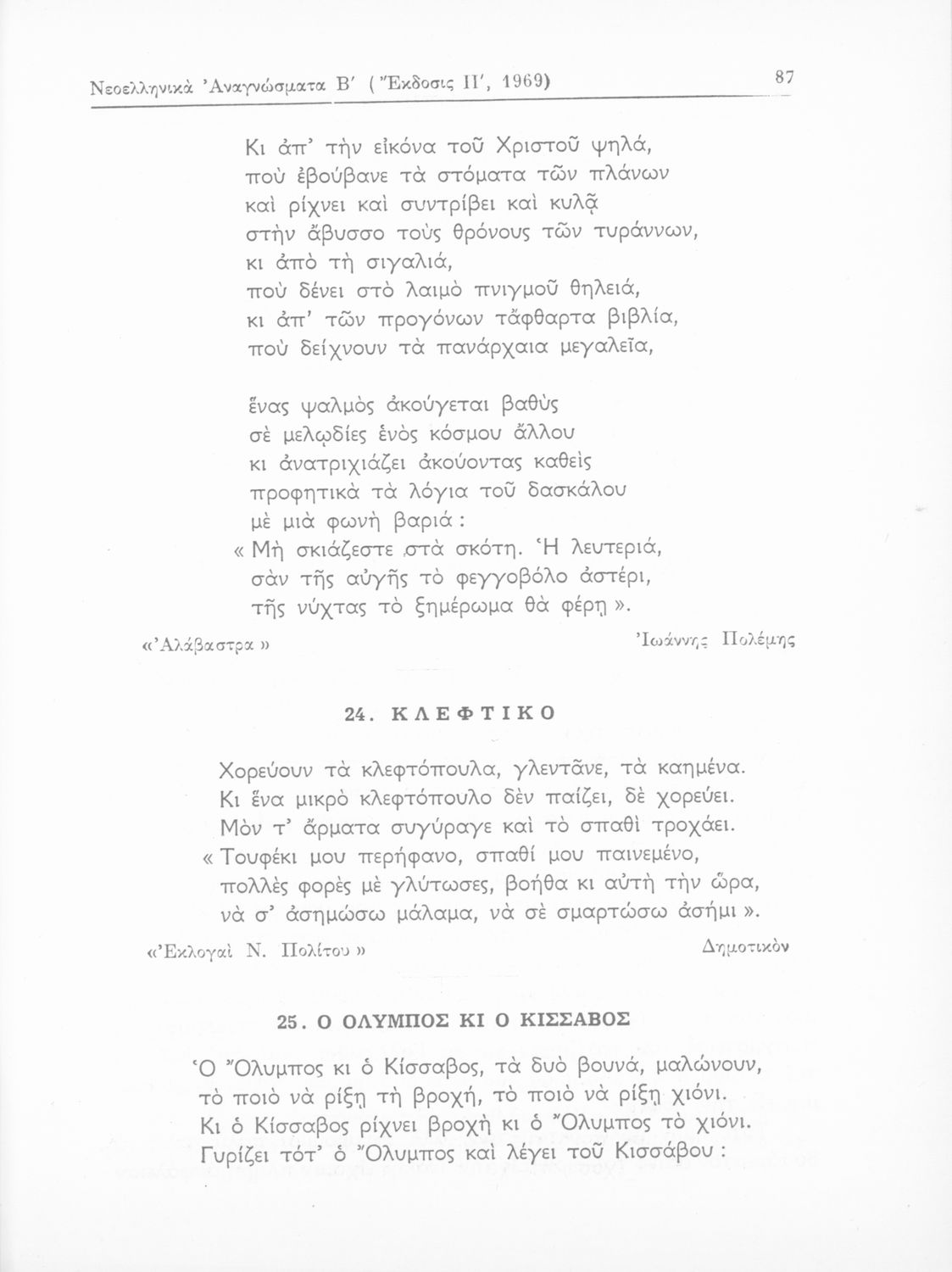 Σχολικό εγχειρίδιο Νέων Ελληνικών Β' Γυμνασίου που περιέχει ποιήματα και πεζά Ελλήνων συγγραφέων εμπνευσμένα από τη θρησκευτική, εθνική, οικογενειακή και κοινωνική ζωή και την ελληνική φύση. Περιέχει παράρτημα με βιογραφίες των συγγραφέων και λεξιλόγιο. Φέρει το σύμβολο της δικτατορίας.