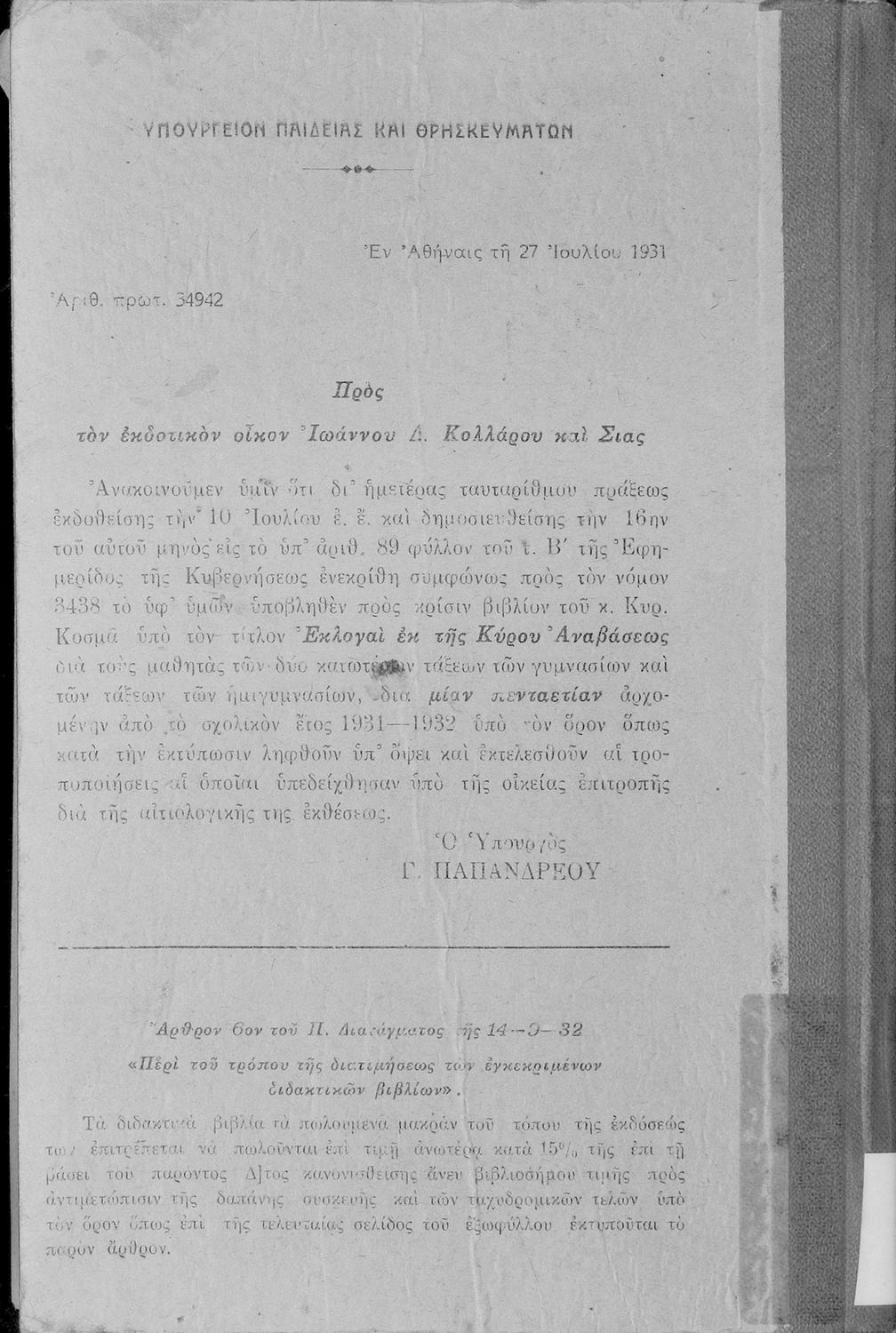 Τίτλος: Εκλογαί εκ της Κύρου αναβάσεως του Ξενοφώντος δια την Β' τάξιν των Γυμνασίων και Ημιγυμνασίων