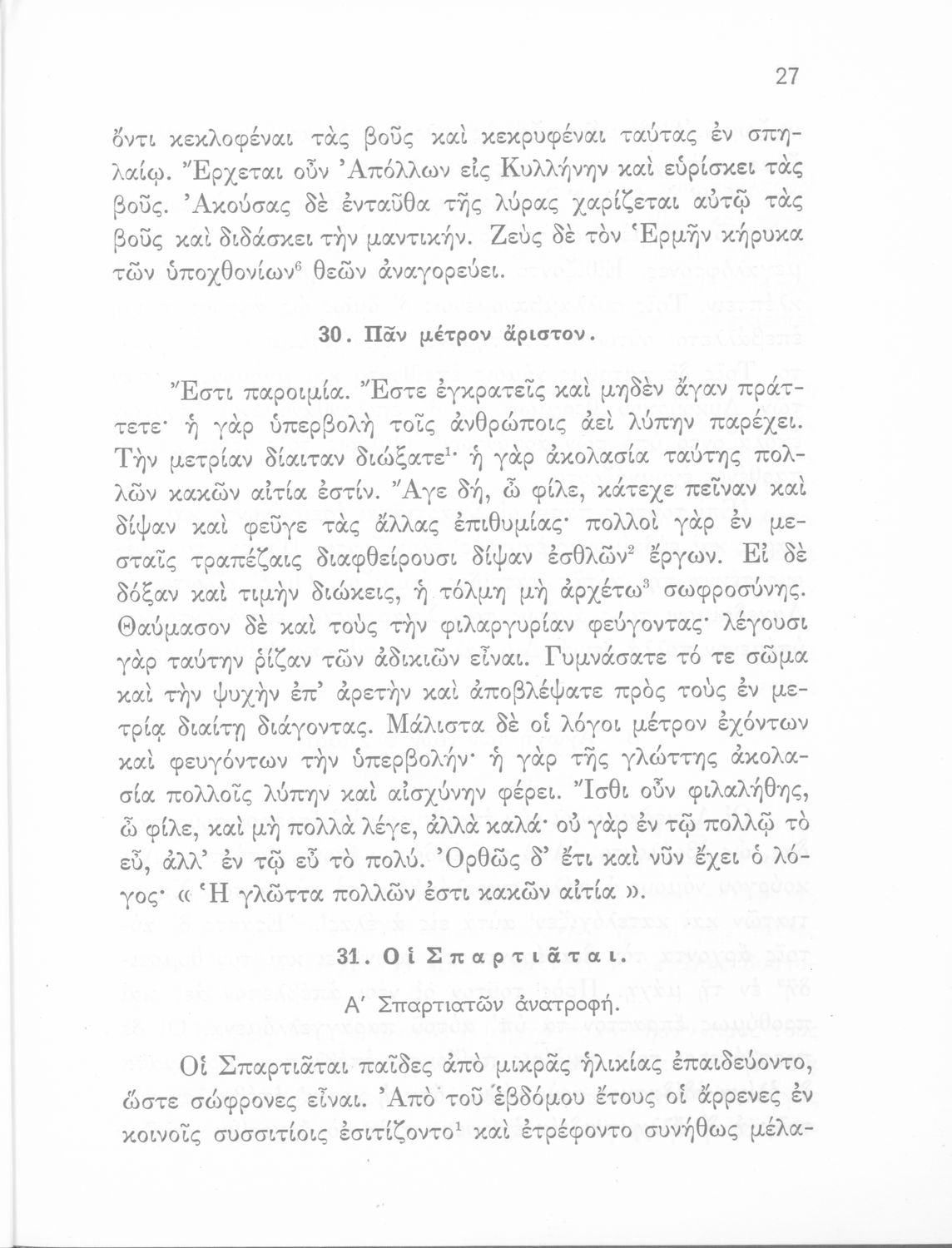 Σχολικό Εγχειρίδιο Αρχαίων Ελληνικών που περιλαμβάνει κείμενα προσαρμοσμένα στη διδασκαλία των γραμματικών και συντακτικών φαινομένων, και ερμηνευτικές και λεξιλογικές σημειώσεις.