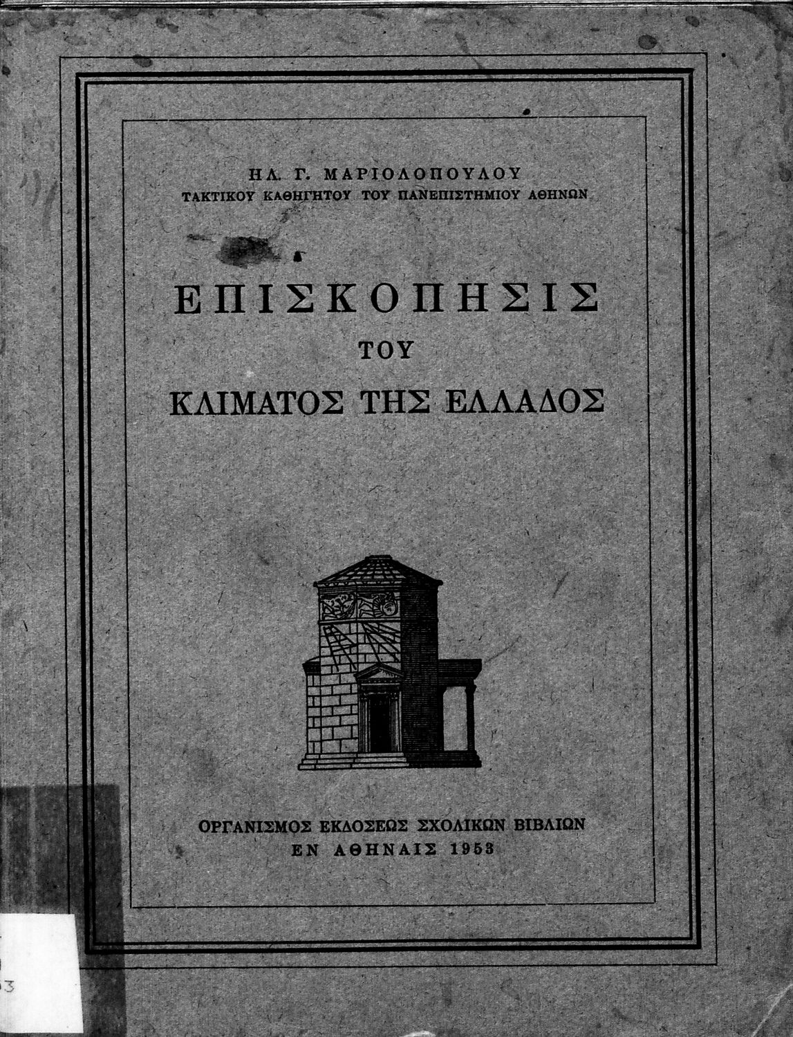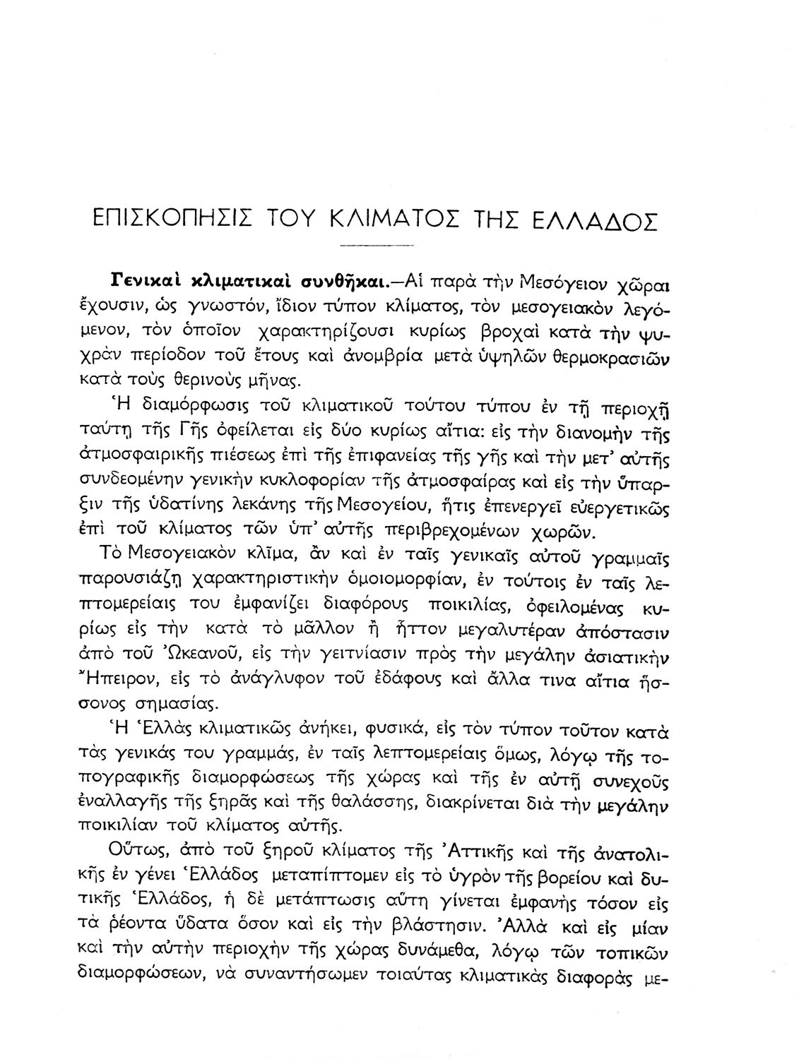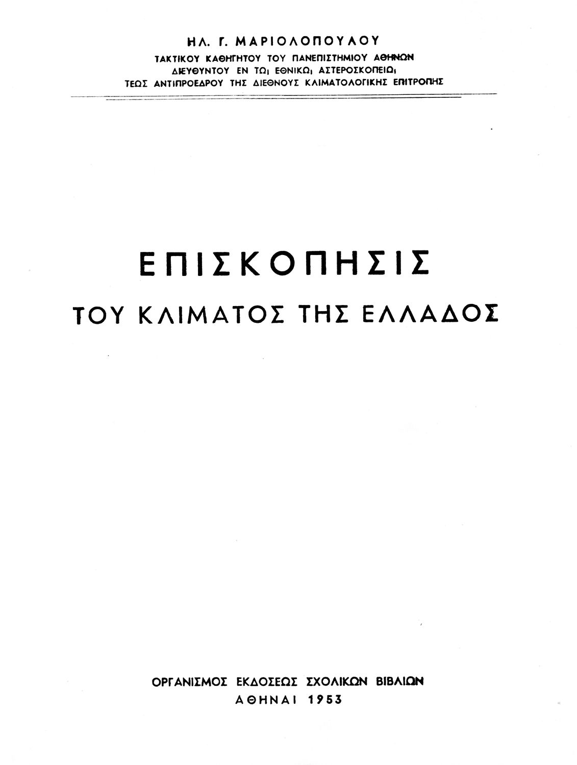 Σχολικό εγχειρίδιο Γεωγραφίας που πραγματεύεται το κλίμα της Ελλάδας ανά γεωγραφική περιοχή και περιέχει κλιματολογικούς χάρτες. Ο συγγραφέας υπήρξε τακτικός καθηγητής του Πανεπιστημίου Αθηνών.