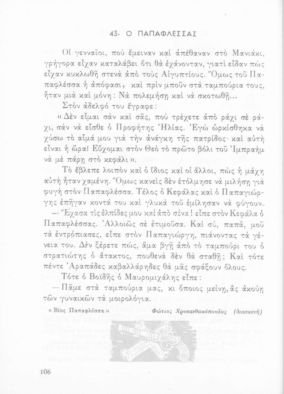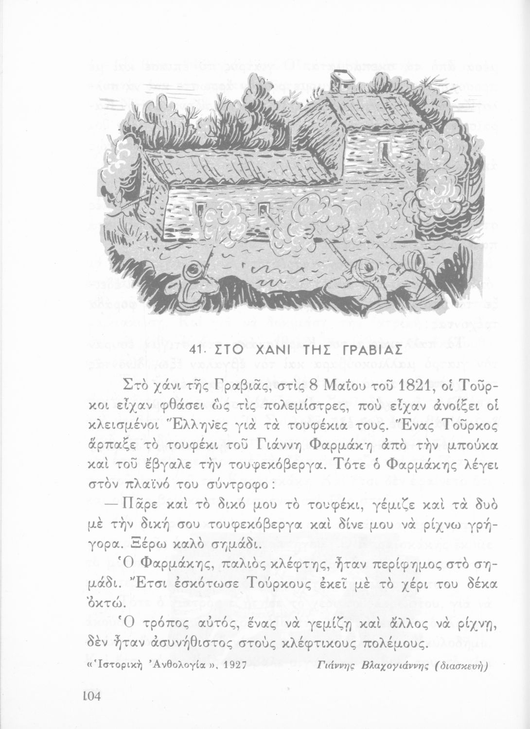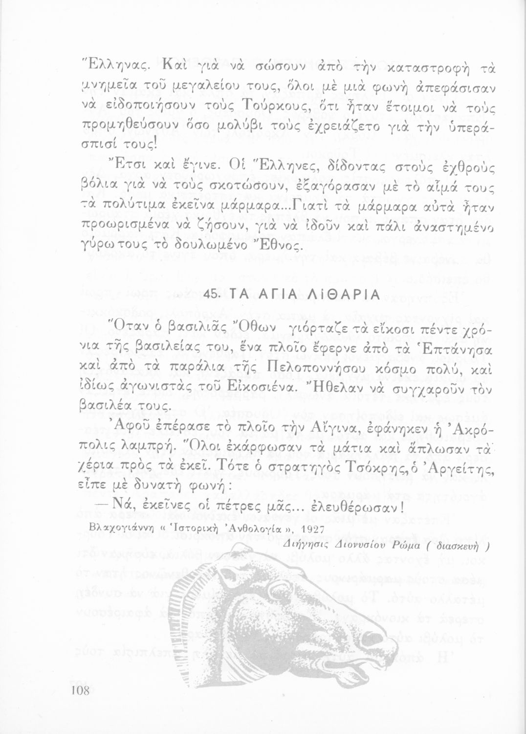 Αναγνωστικό ΣΤ΄ Δημοτικού που περιλαμβάνει θέματα από τις ελληνικές παραδόσεις και μύθους, την ελληνική φύση και θάλασσα και το τρίπτυχο "Πατρίς-θρησκεία-οικογένειαα".
