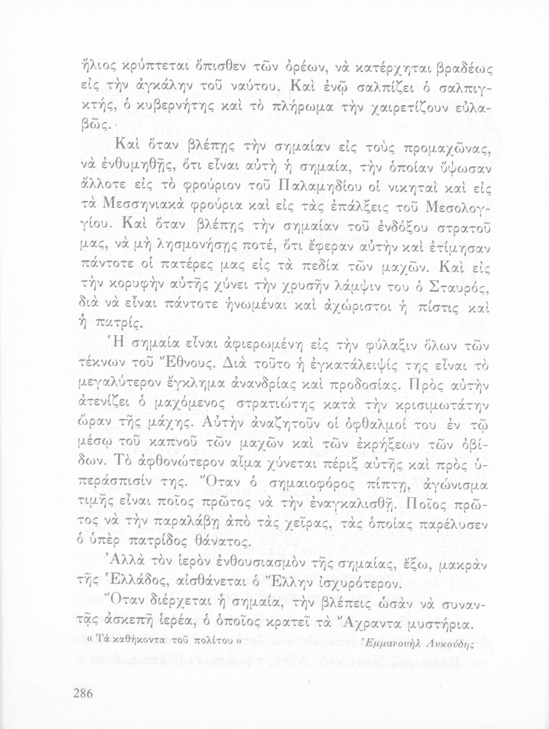 Αναγνωστικό ΣΤ΄ Δημοτικού που περιλαμβάνει θέματα από τις ελληνικές παραδόσεις και μύθους, την ελληνική φύση και θάλασσα και το τρίπτυχο "Πατρίς-θρησκεία-οικογένειαα".