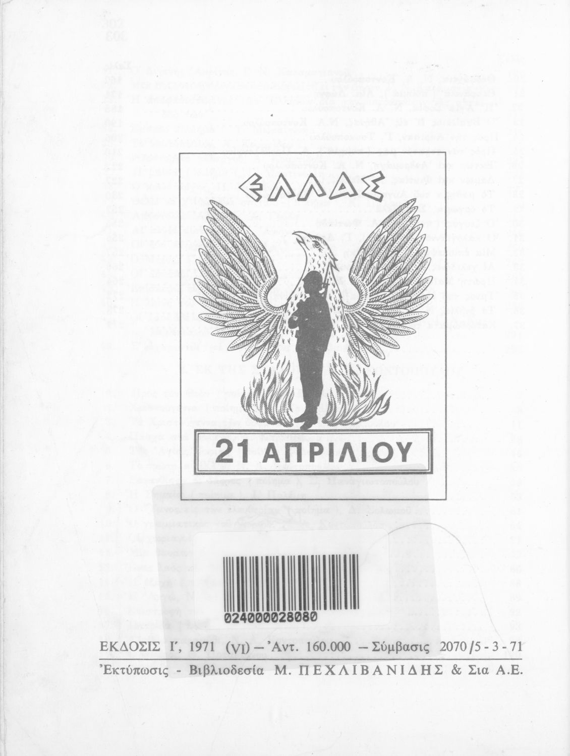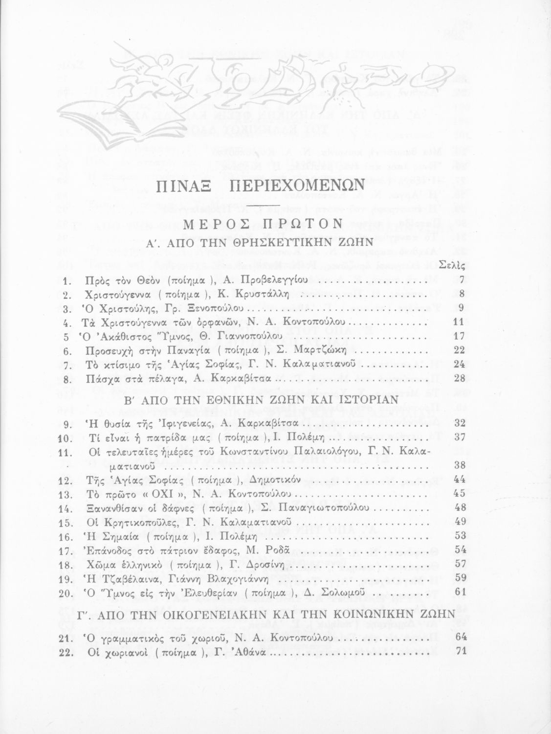 Αναγνωστικό Ε΄ Δημοτικού που περιέχει κείμενα εμπνευσμένα από την εθνική, κοινωνική και οικογενειακή ζωή και την ελληνική φύση, μυθολογία και ιστορία. Φέρει το σύμβολο της δικτατορίας.