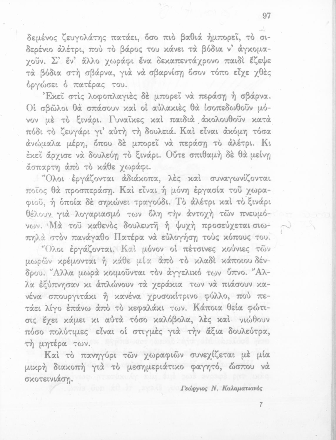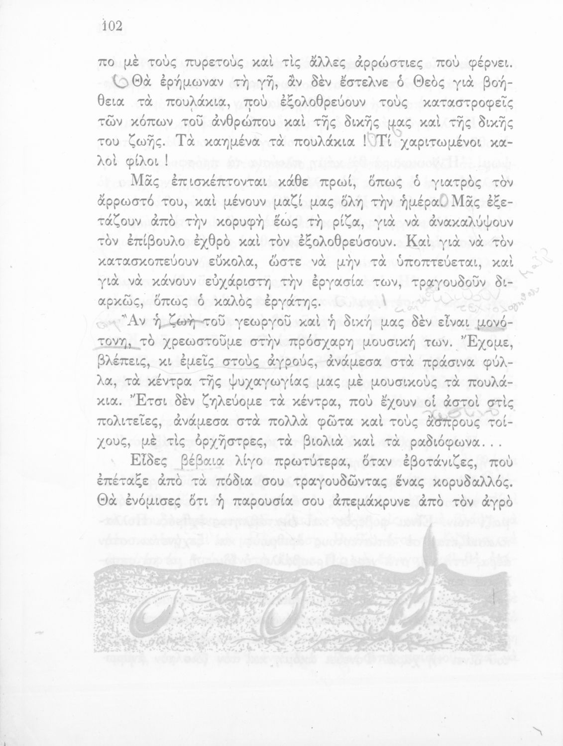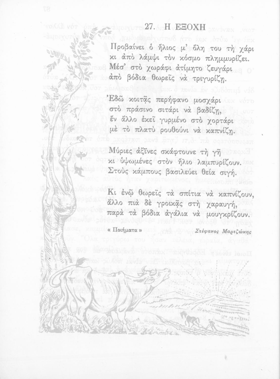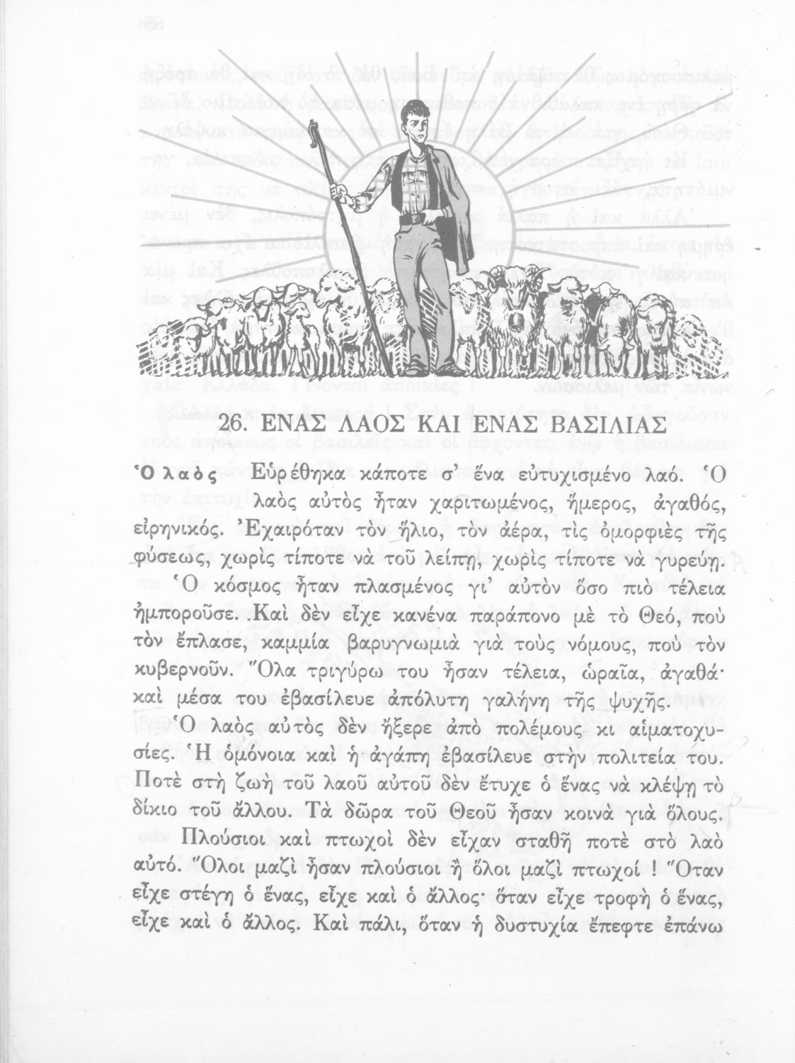 Αναγνωστικό Ε΄ Δημοτικού που περιέχει κείμενα εμπνευσμένα από την εθνική, κοινωνική και οικογενειακή ζωή και την ελληνική φύση, μυθολογία και ιστορία. Φέρει το σύμβολο της δικτατορίας.