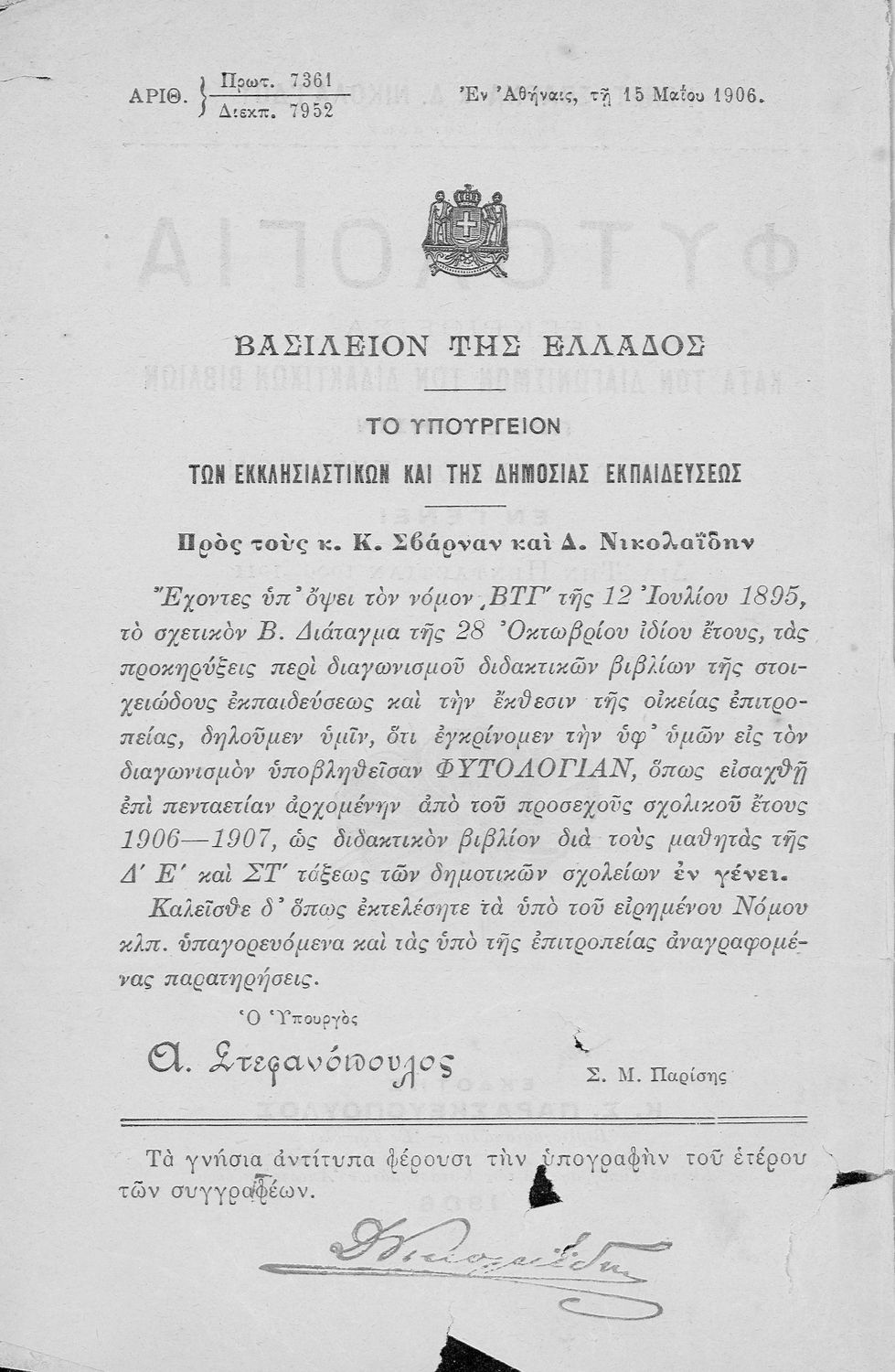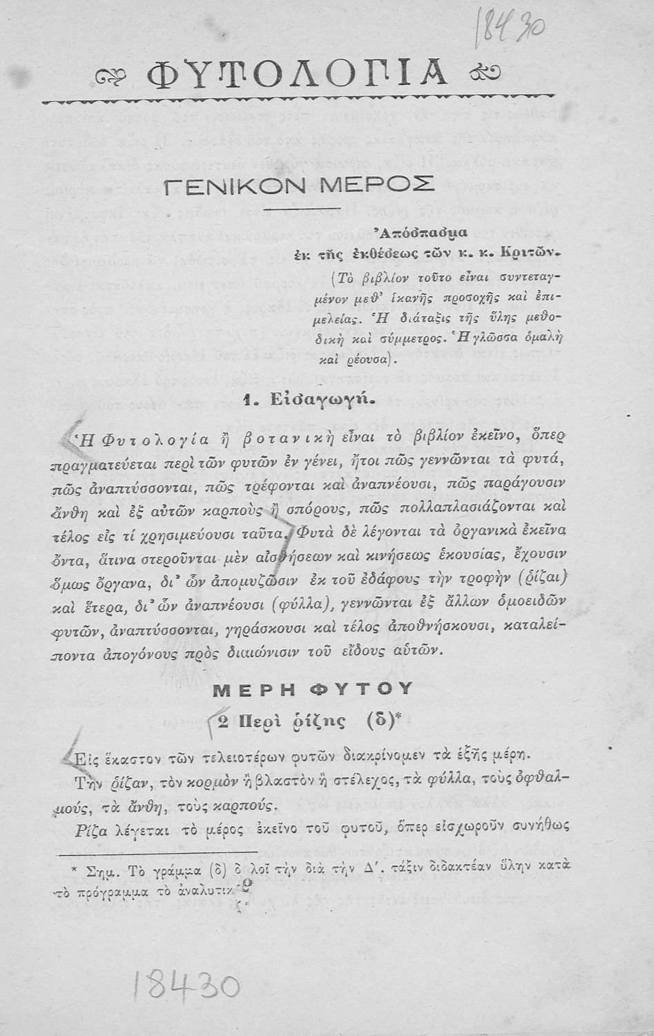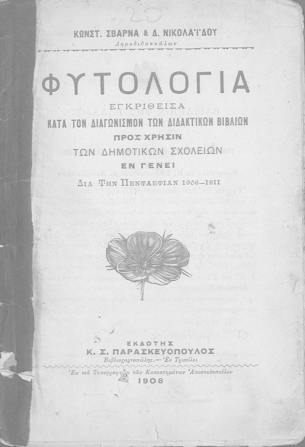 Τίτλος: Φυτολογία, εγκριθείσα κατά τον διαγωνισμό των διδακτικών βιβλίων, προς χρήσιν των Δημοτικών Σχολείων