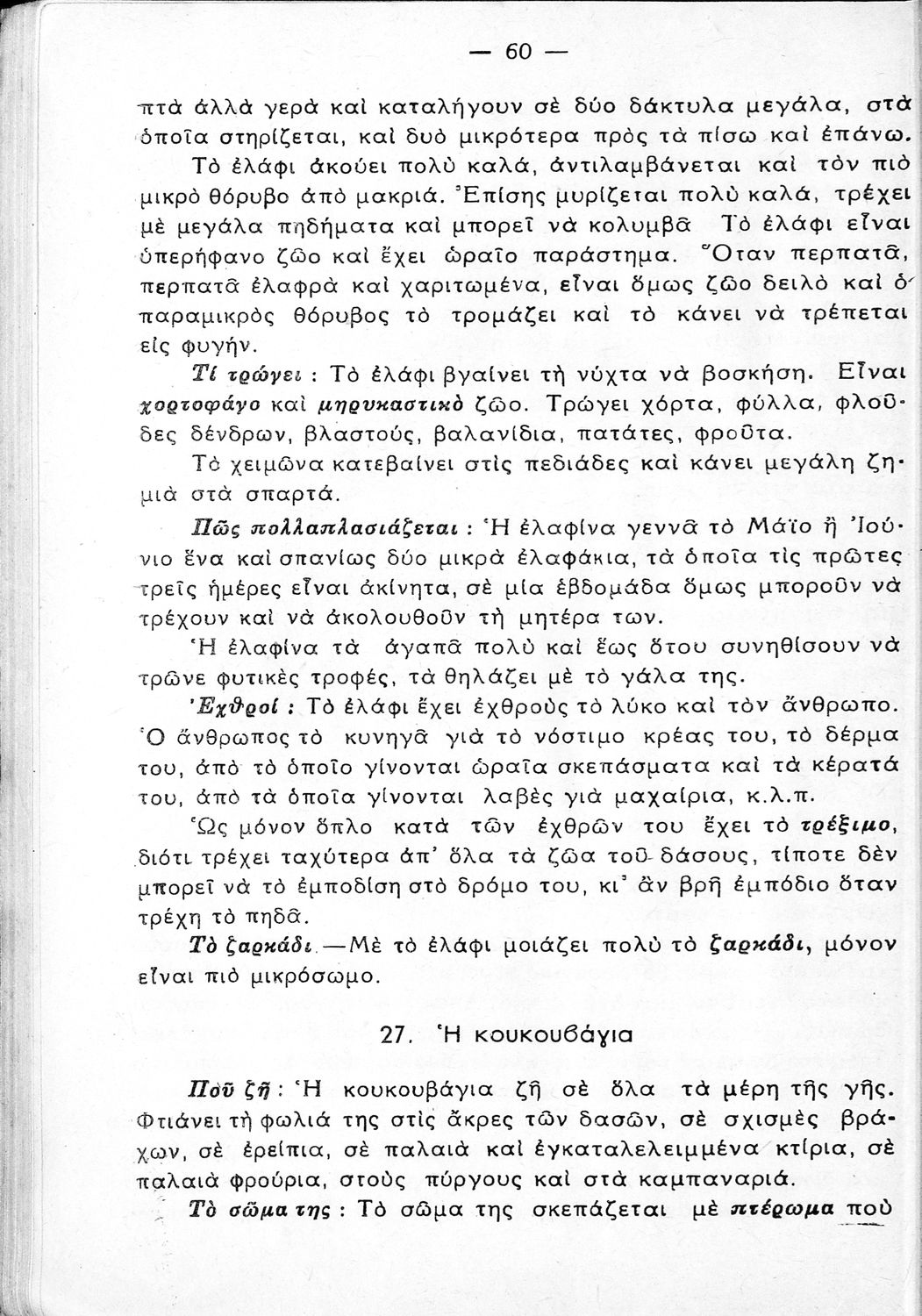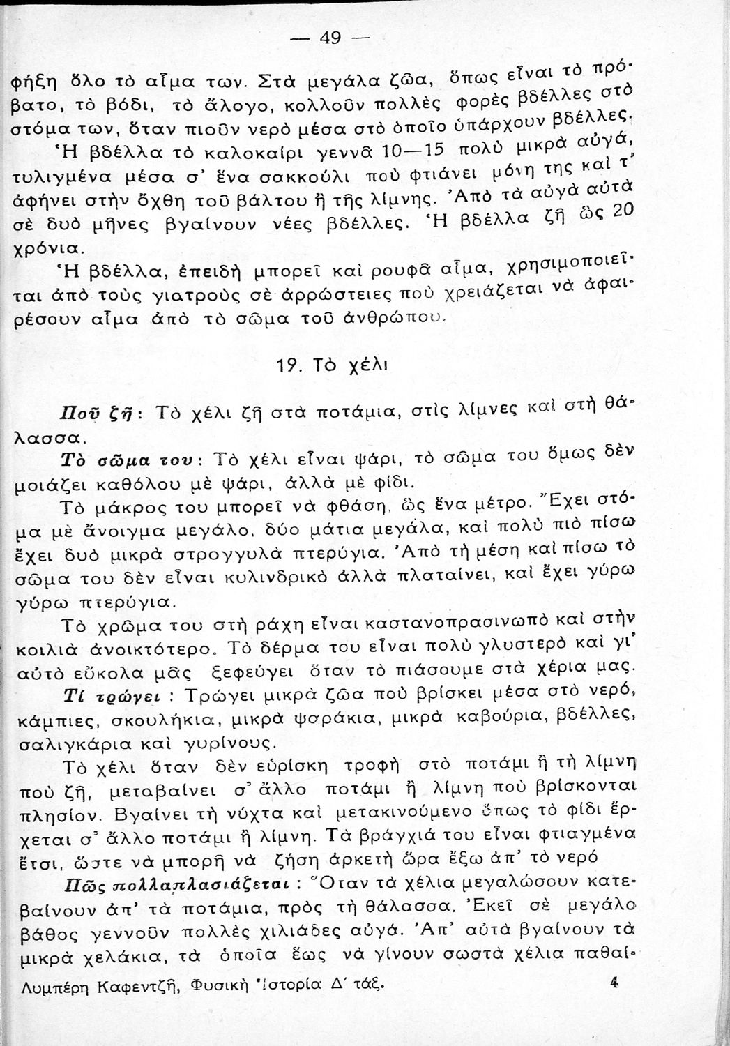 Βαθμίδα εκπαίδευσης: Πρωτοβάθμια Τάξη: Δ' Δημοτικού Μάθημα: Φυσική Ιστορία Γλώσσα: Δημοτική Παρουσίαση περιεχομένου: Μαθητικό βοήθημα της Δ΄ Δημοτικού για το μάθημα της Φυσικής Ιστορίας. Περιέχει πληροφορίες για τη φυτολογία, ορυκτολογία και τη ζωολογία. Το βιβλίο έχει εικόνες, οι οποίες διευκολύνουν τη διδασκαλία. Ο λόγος των κειμένων είναι απλός και κατανοητός για τους μαθητές. |