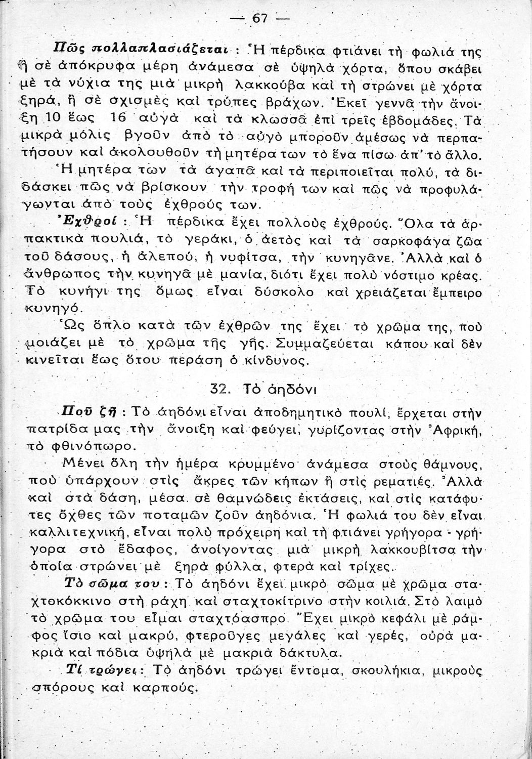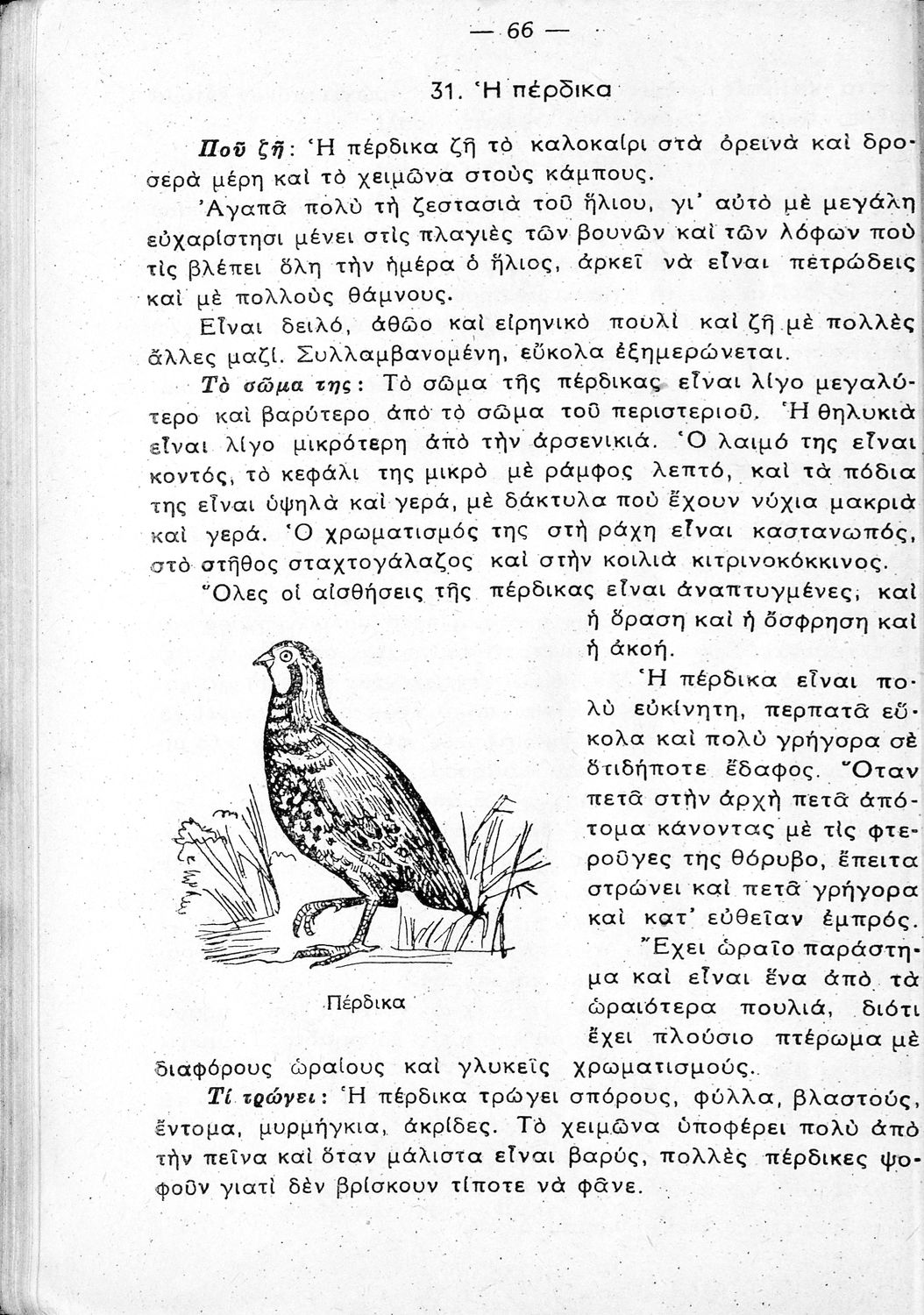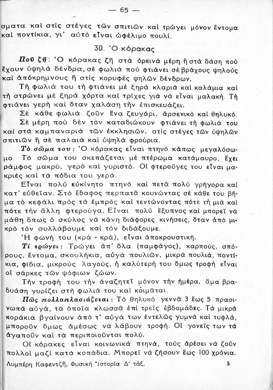 Βαθμίδα εκπαίδευσης: Πρωτοβάθμια Τάξη: Δ' Δημοτικού Μάθημα: Φυσική Ιστορία Γλώσσα: Δημοτική Παρουσίαση περιεχομένου: Μαθητικό βοήθημα της Δ΄ Δημοτικού για το μάθημα της Φυσικής Ιστορίας. Περιέχει πληροφορίες για τη φυτολογία, ορυκτολογία και τη ζωολογία. Το βιβλίο έχει εικόνες, οι οποίες διευκολύνουν τη διδασκαλία. Ο λόγος των κειμένων είναι απλός και κατανοητός για τους μαθητές. |
