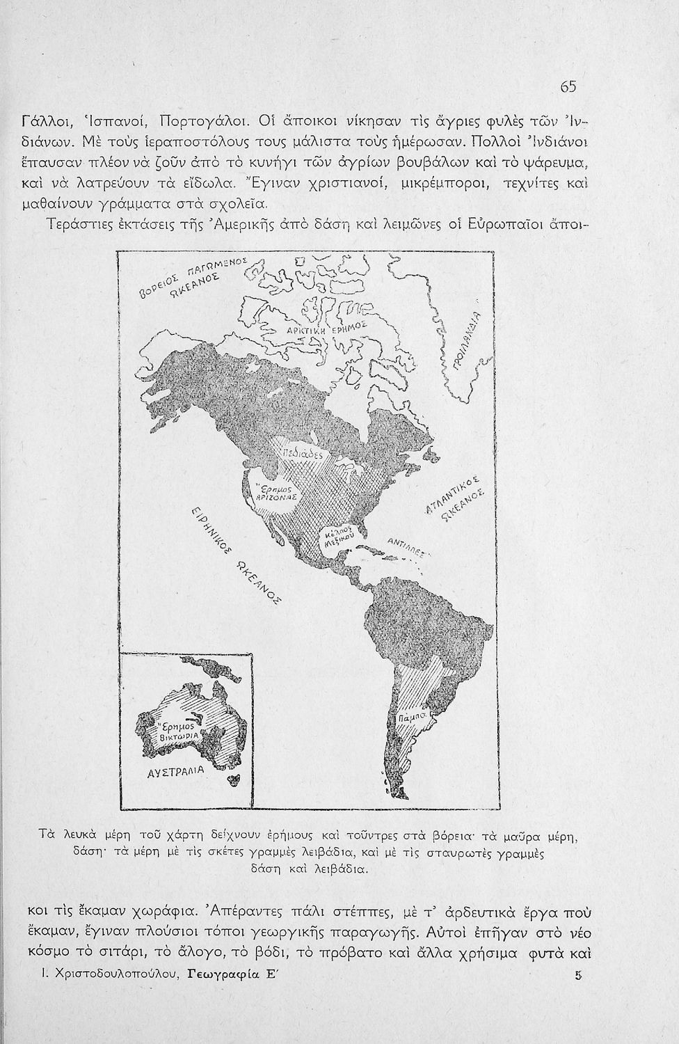 Σχολικό εγχειρίδιο Γεωγραφίας Ε΄ Δημοτικού που περιλαμβάνει στοιχεία φυσικής, μαθηματικής και πολιτικής γεωγραφίας και εστιάζει στη γεωμορφολογική και γεωπολιτική κατάσταση της Ασίας, της Αφρικής, της Αμερικής