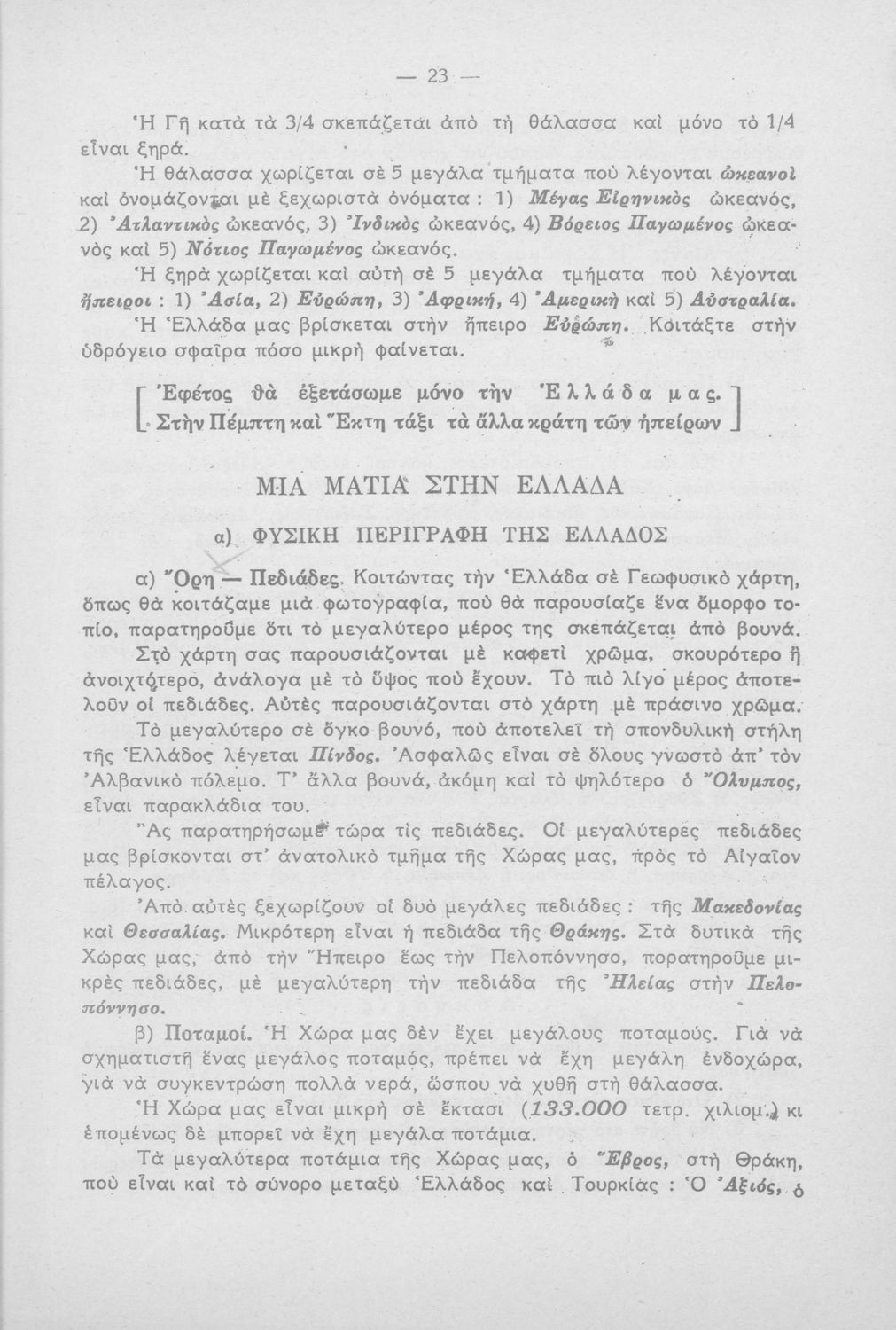 Μαθητικό βοήθημα Γεωγραφίας για τις Γ΄ και Δ΄ Δημοτικού που περιέχει εισαγωγή στη φυσική γεωγραφία και εξετάζει την Ελλάδα ανά διαμέρισμα και νομό από γεωφυσική, οικονομική και πολιτική άποψη.