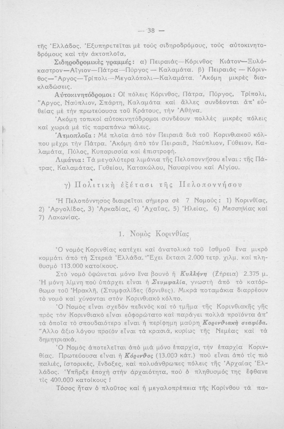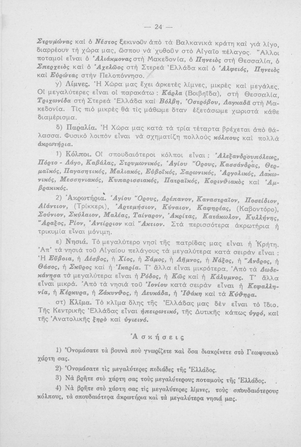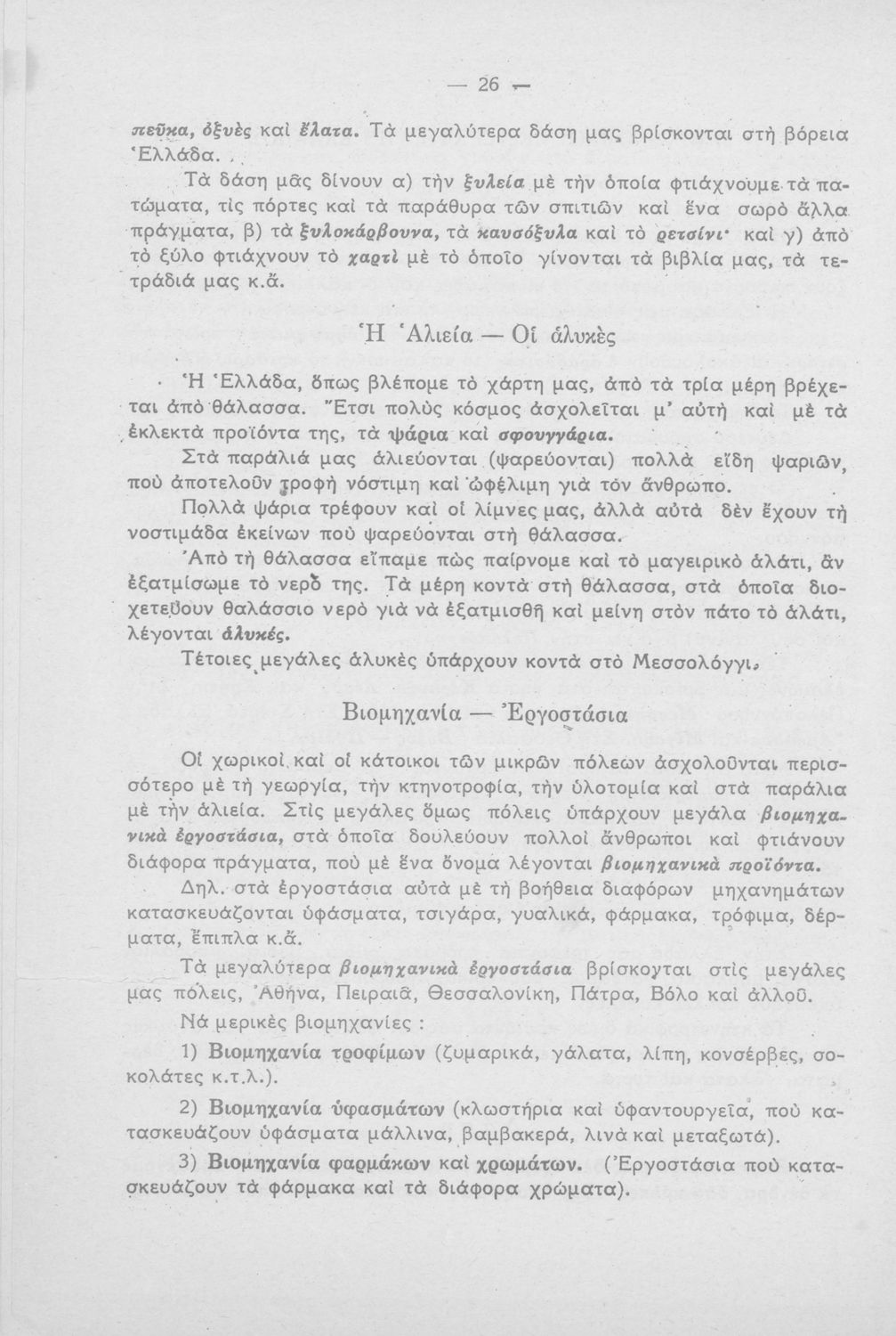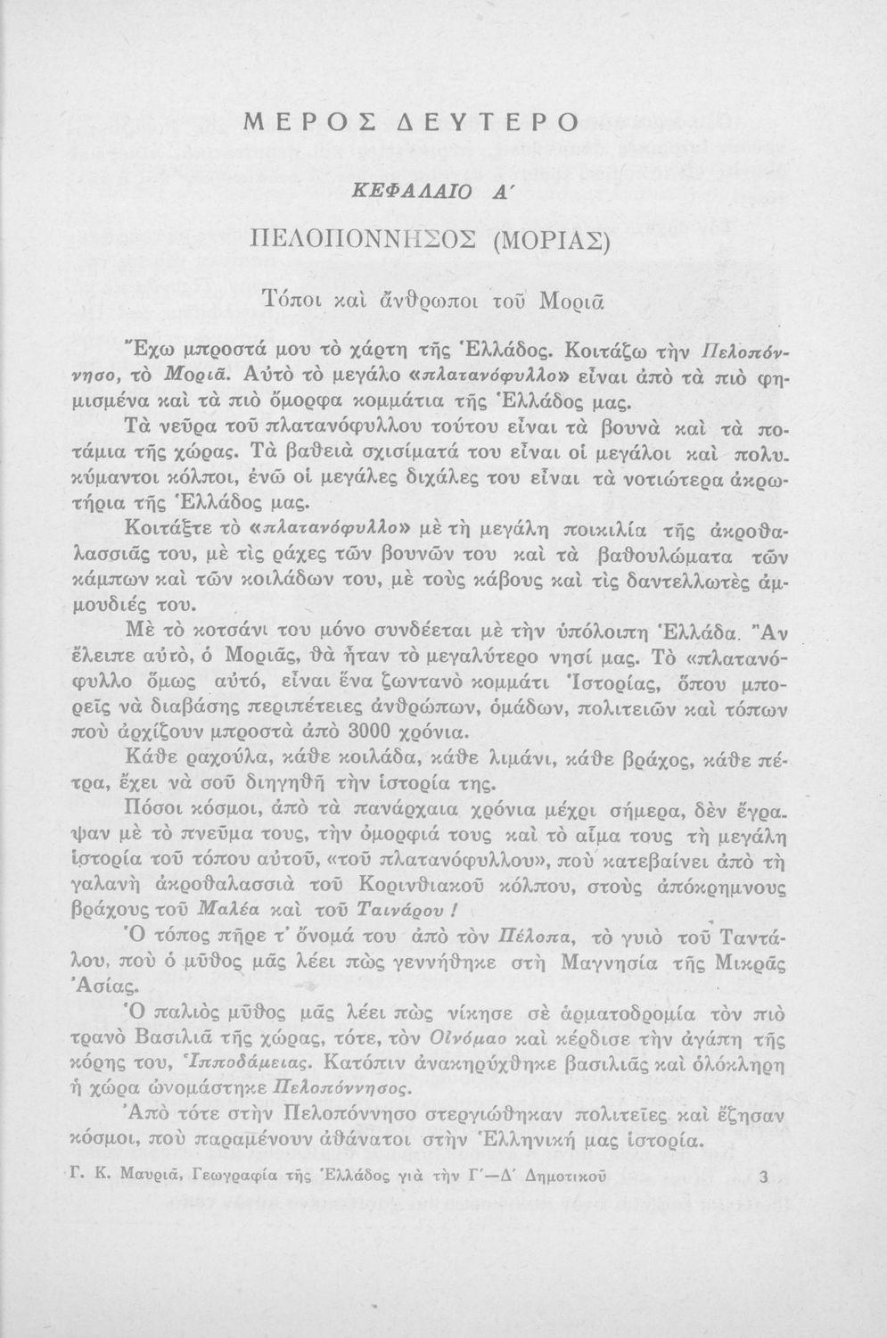 Σχολικό εγχειρίδιο Γεωγραφίας για τη Γ΄, Δ΄ Δημοτικού. Μελετά την Ελλάδα ανά γεωγραφικό νομό με πληροφορίες από το χάρτη της περιοχής και στοιχεία της ιστορίας και της οικονομικής ζωής.