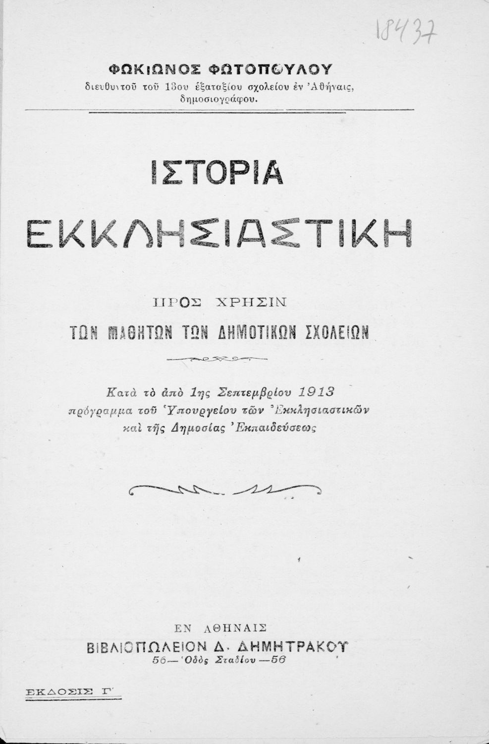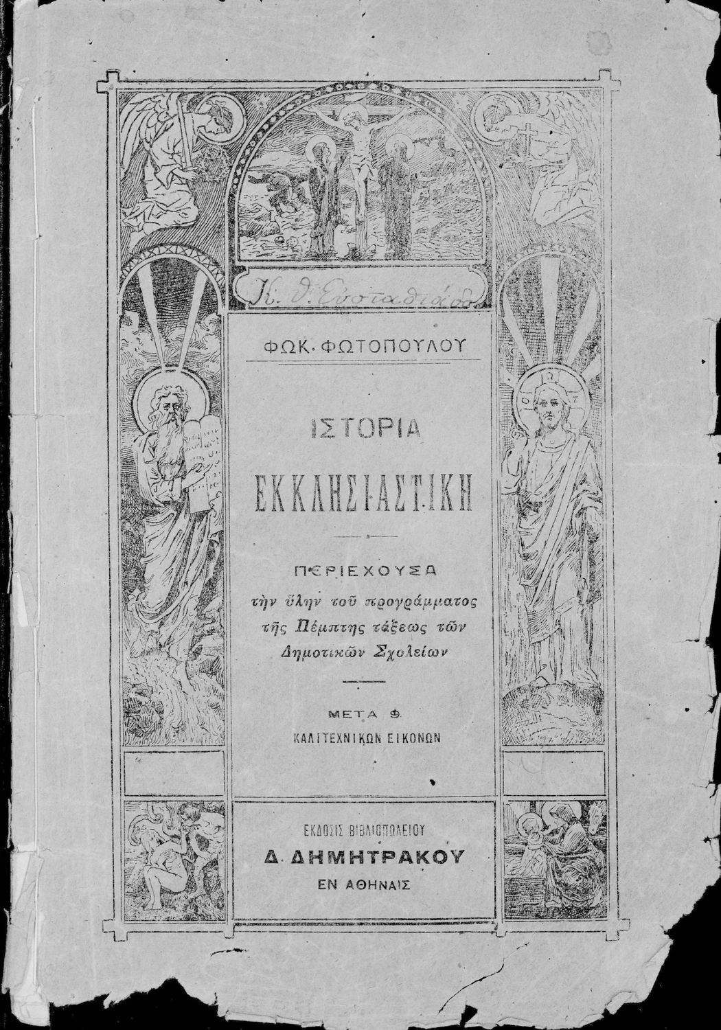 Κωδικός αναγνώρισης: 01-18437 Τίτλος: Ιστορία Εκκλησιαστική προς χρήσιν των μαθητών της πέμπτης τάξεως των Δημοτικών Σχολείων Συγγραφέας: Φωκίων Φωτόπουλος Μέγεθος και υπόστρωμα: Μαθητικό βοήθημα, 21εκ., σκληρό εξώφυλλο, 46 σελίδες. Φωτογραφίες (ασπρόμαυρες). |