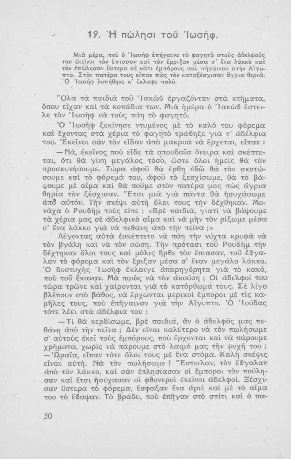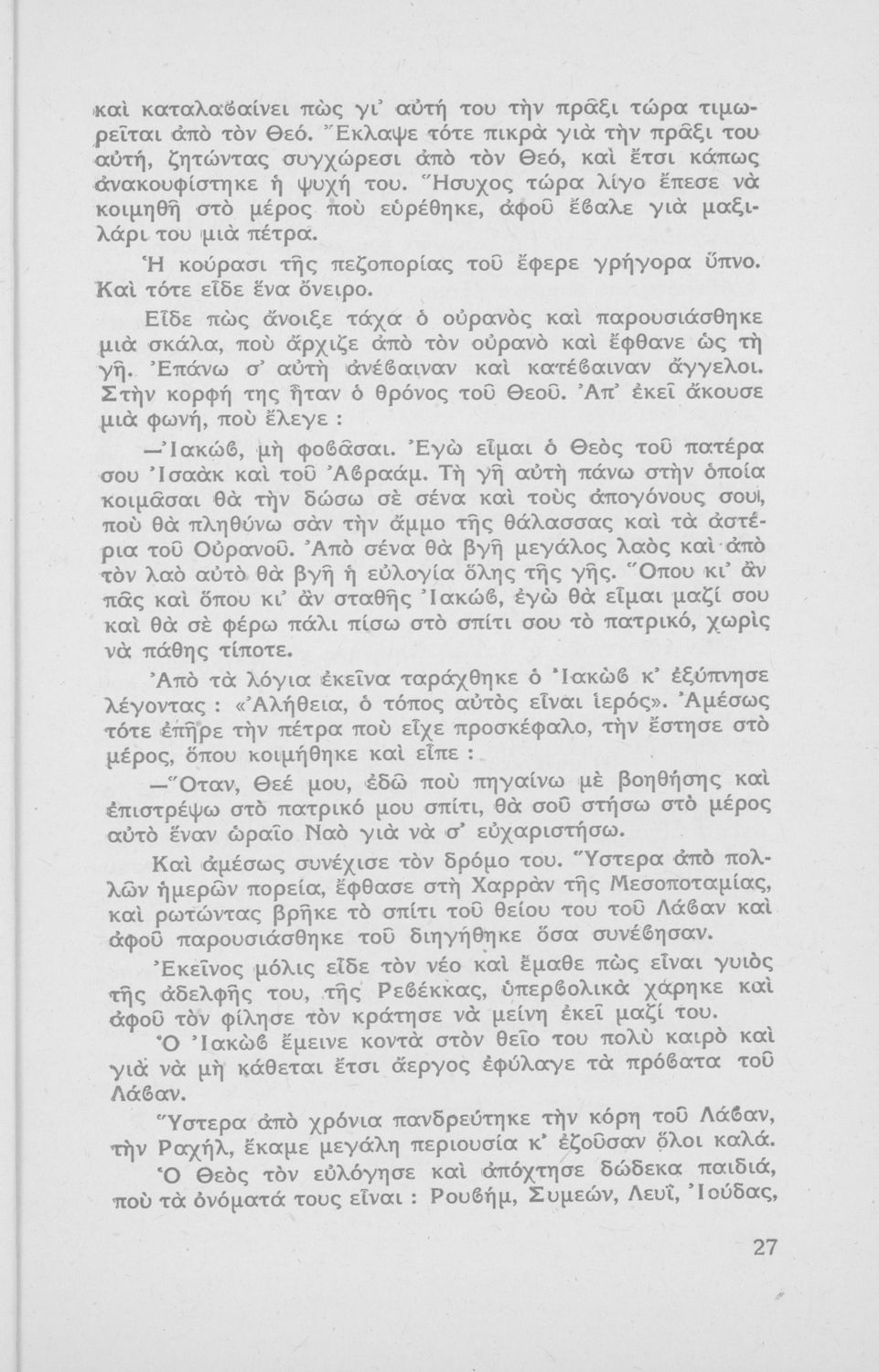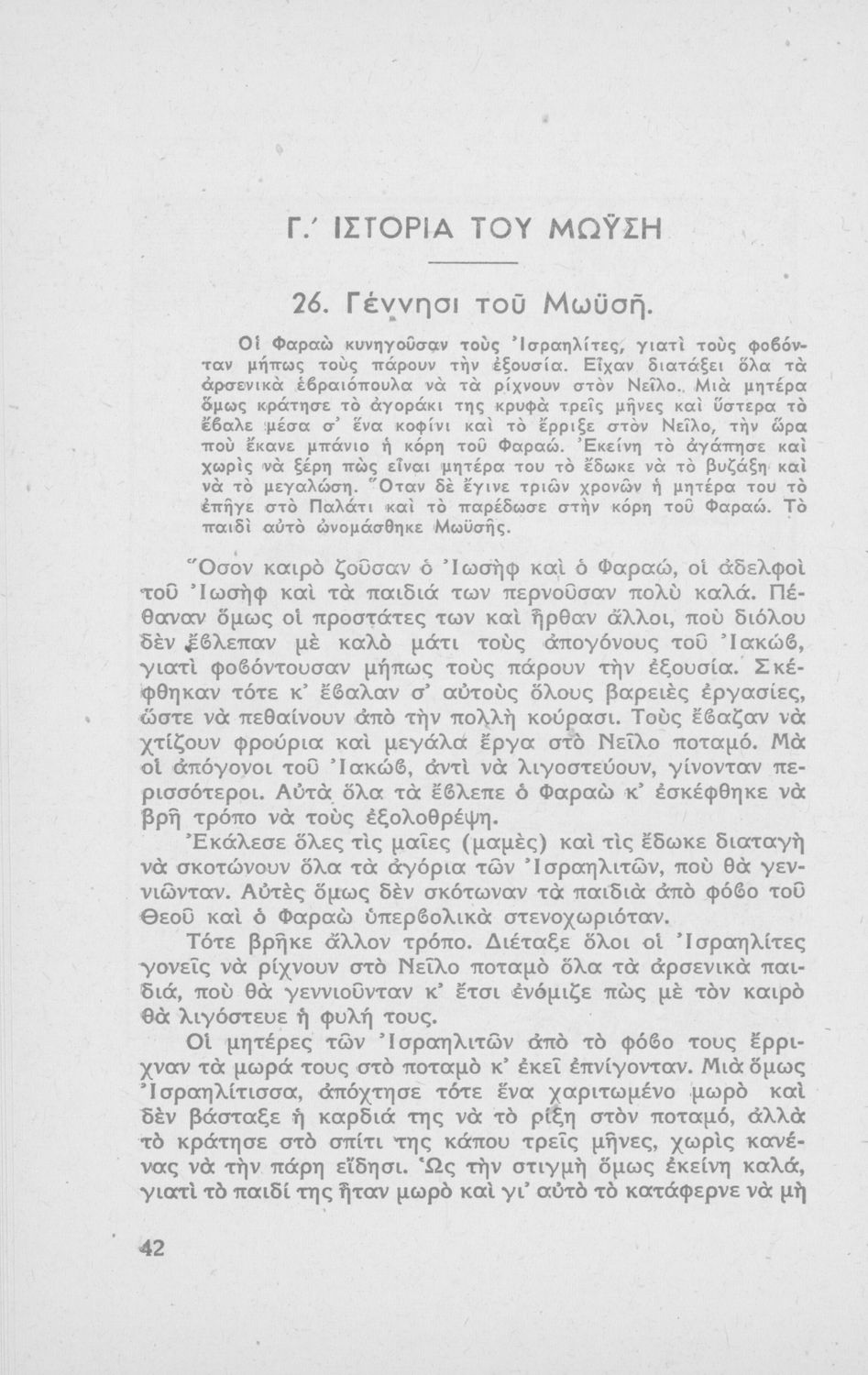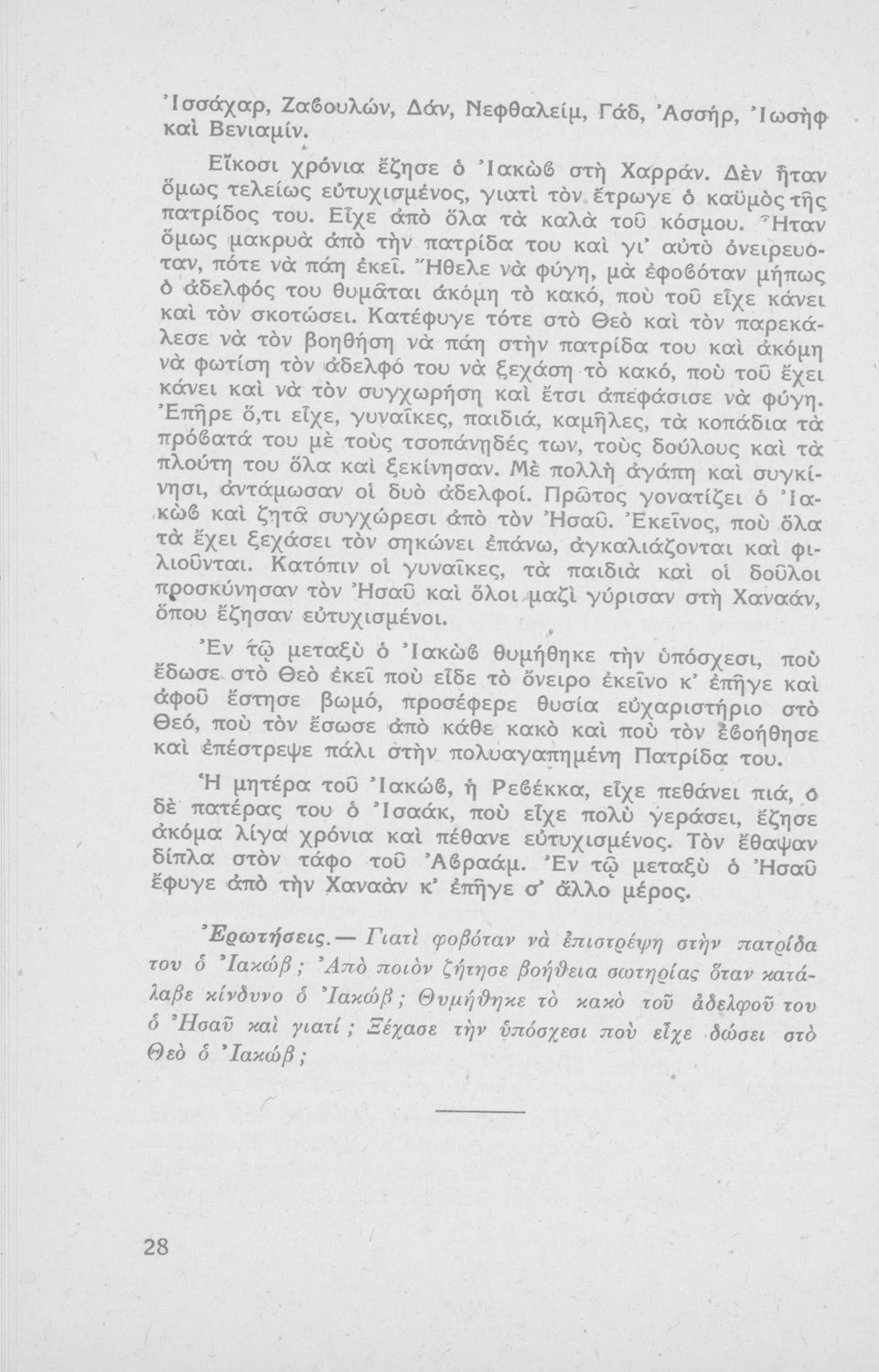 Σχολικό εγχειρίδιο για την Γ΄ Τάξη πιθανόν της Εκκλησιαστικής Γεωργικής Σχολής. Αναφέρεται στα γεγονότα της Παλαιάς Διαθήκης. Περιέχει τη δράση του Ιακώβ, του Μωυσή, μέχρι και τους προφήτες.
