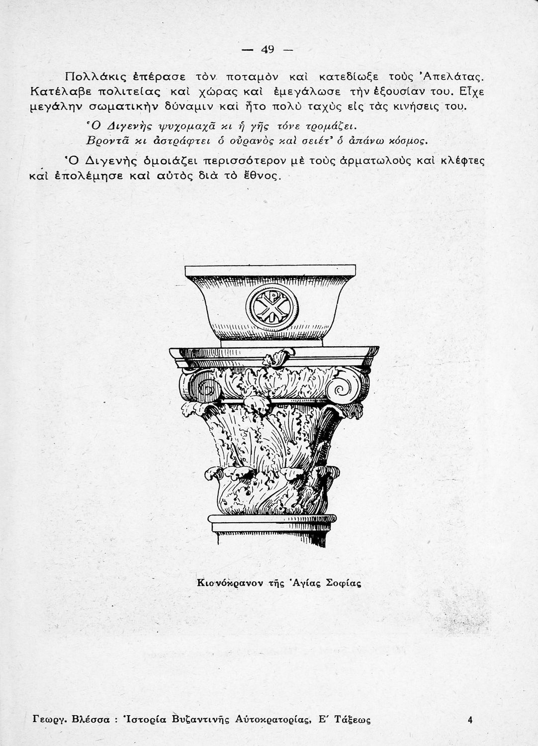 Κωδικός αναγνώρισης: 01-18446 Τίτλος: Βυζαντινή Ιστορία .Τάξις Ε΄ Δημοτικού Συγγραφέας: Γεώργιος Σ. Βλέσσας Μέγεθος και υπόστρωμα: Μαθητικό βοήθημα, σκληρό εξώφυλλο, 88 σελίδες. Σκίτσα, εικόνες (ασπρόμαυρα). |