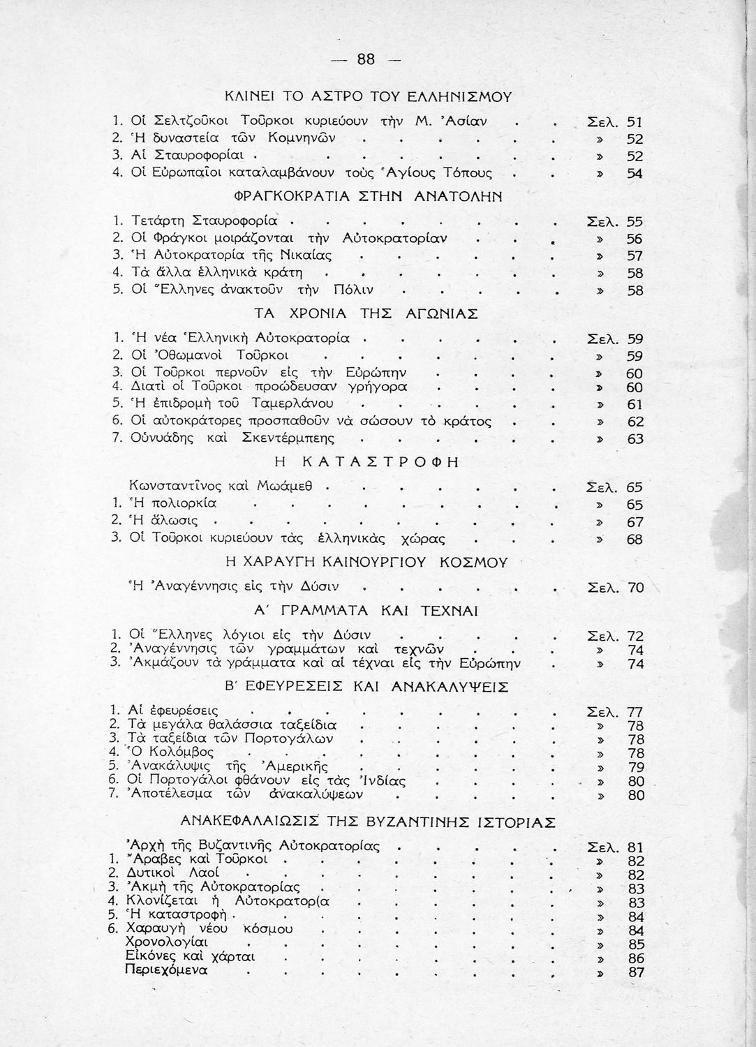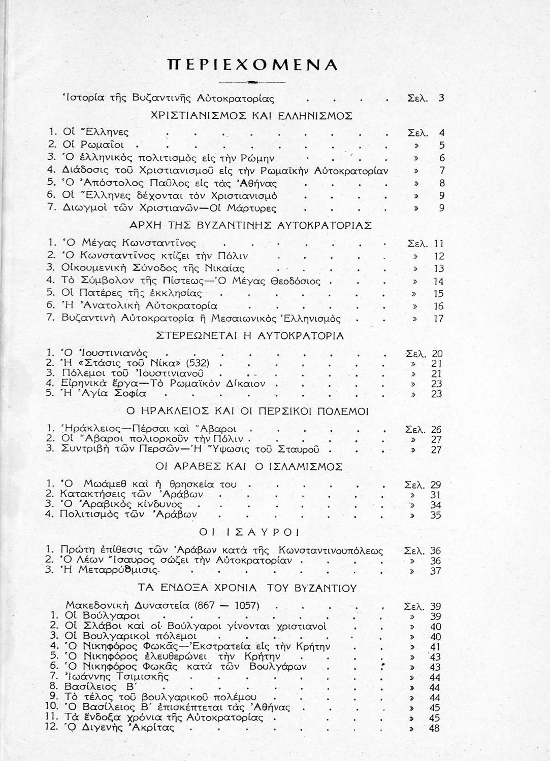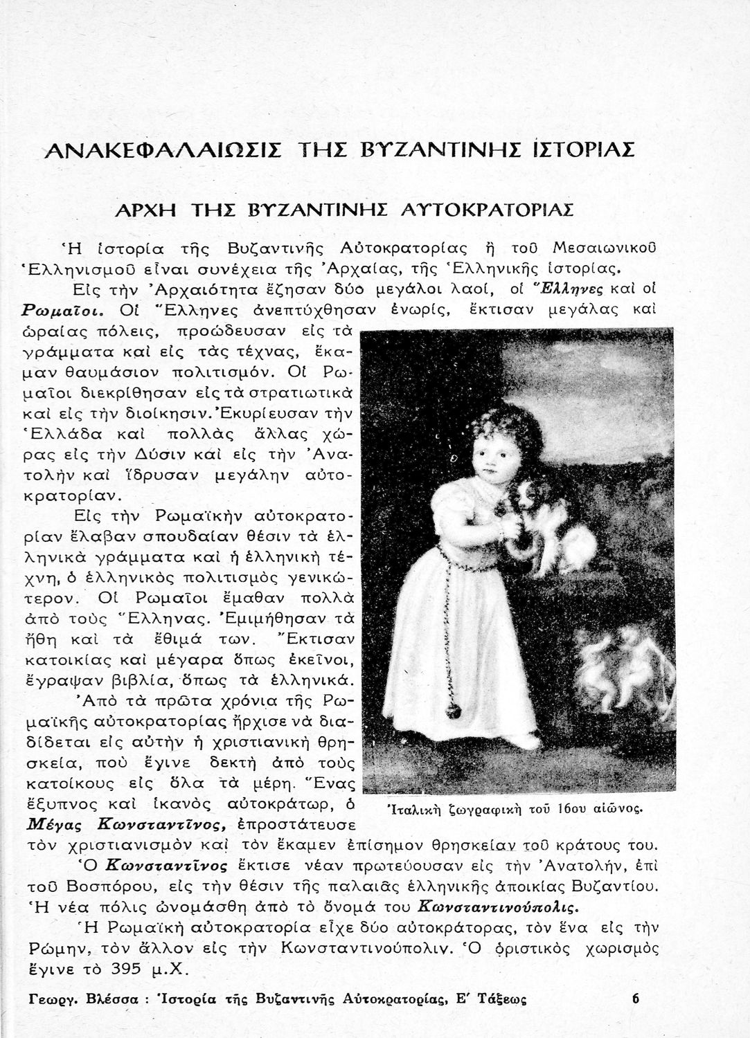 Βαθμίδα εκπαίδευσης: Πρωτοβάθμια Τάξη: Ε' Δημοτικού Μάθημα: Ιστορία Γλώσσα: Απλή καθαρεύουσα Παρουσίαση περιεχομένου: Μαθητικό βοήθημα Ιστορίας Ε΄ Δημοτικού που περιλαμβάνει την ιστορία της Βυζαντινής Αυτοκρατορίας και εστιάζει στο έργο και τη δράση του κάθε αυτοκράτορα μέχρι και την άλωση της Κωνσταντινούπολης. |